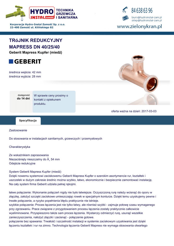 TRóJNIK REDUKCYJNY MAPRESS DN 40/25/40 Geberit Mapress Kupfer (miedź) średnica wejścia: 42 mm średnica wyjścia: 28 mm dostępność do 14 dni W sprawie ceny prosimy o kontakt z opiekunem produktu. oferta ważna na dzień: 2017-03-03 Zastosowanie Do stosowania w instalacjach sanitarnych, grzewczych i przemysłowych Charakterystyka Ze wskaźnikiem zaprasowania Niezaciśnięty nieszczelny do ø 54 mm Odejście redukcyjne System Geberit Mapress Kupfer (miedź) Dzięki nowemu systemowi zaciskowemu Geberit Mapress Kupfer o szerokim asortymencie rur, kształtek i uszczelek w dużym zakresie średnic można szybko, łatwo, ekonomicznie i bezpiecznie zamontować instalację. Na cały system firma Geberit udziela pełnej rękojmi. łatwe połączenie: Wykonanie połączeń nigdy nie było łatwiejsze. Oczyszczoną rurę należy wcisnąć do oporu w złączkę, założyć szczęki zaciskowe umieszczając rowek w specjalnym konturze. Dzięki temu uzyskujemy pewne i trwałe połączenie, a ryzyko popełnienia błędu praktycznie nie istnieje. szybkie połączenie: Proces łączenia jest nie tylko łatwy, ale również szybki - zajmuje połowę czasu wymaganego przy zgrzewaniu. Prace związane z przygotowaniem procesu łączenia zostały praktycznie całkowicie wyeliminowane. Przyspieszono także sam proces łączenia. Wystarczy odmierzyć rurę, usunąć wszelkie zanieczyszczenia, nałożyć złączki i zacisnąć - połączenie gotowe. połączenie bez spawania: Trwałość i szczelność instalacji w systemie zaciskowym uzyskiwania jest dzięki łączeniu kształtek i rur na zimno. Technologia łączenia Geberit Mapress nie wymaga stosowania otwartego płomienia niezbędnego w procesie lutowania lub spawania. Dzięki temu podczas modernizacji lub naprawy instalacji nie ma potrzeby zapewnienia dodatkowych środków ochrony. wskaźnik zacisku: Nowy wskaźnik zacisku znajdujący się na wszystkich złączkach systemu Geberit Mapress Kupfer po prawidłowym zaciśnięciu może być bez wysiłku usunięty. W ten sposób jeszcze przed próbą ciśnieniową można wizualnie znaleźć miejsca, w których połączenia nie zostały właściwie wykonane. Biały kolor wskaźnika zacisku umożliwia jednoznaczną identyfikację materiału. Dla potrzeb identyfikacji na wskaźniku umieszczone są także logo Geberit i wymiary danego elementu. zaślepka ochronna: Wszystkie końcówki kształtek zaciskowych Geberit zaopatrzone są w specjalne zaślepki złączek, które zabezpieczają instalację przed przedostawaniem się do niej pyłu i zanieczyszczeń. uszczelnienie konturowe: Uszczelka konturowa gwarantuje dodatkowe bezpieczeństwo niezależnie od wskaźnika zacisku. Dzięki specjalnemu konturowi pierścienia połączenia niezaciśnięte zostają podczas próby ciśnieniowej zidentyfikowane jako nieszczelne. wytrzymałość mechaniczna: Idealnie dobrane składniki zapewniają systemowi Geberit Mapress bardzo dużą wytrzymałość, nawet przy ciśnieniu roboczym 25 bar i więcej. Dzięki dużej wytrzymałości mechanicznej system ma bardzo szeroki zakres zastosowania, znacznie wykraczający poza tradycyjne systemy instalacji technicznej budynku. uformowanie uszczelnienia: Pierścień uszczelniający po zaprasowaniu systemowymi szczękami zaciskowymi przyjmuje odpowiedni kształt i kumuluje dodatkową energię wytworzoną podczas zaciskania. W ten sposób zwiększamy trwałość i pewność połączenia, dzięki czemu systemy Geberit Mapress funkcjonują bezawaryjnie od ponad 40 lat. geometria złączek: Ze względu na niewielkie wymiary montażowe złączek, instalator potrzebuje do montażu mniej miejsca i może wykonać zwarte układy instalacji. Geberit oferuje bogaty asortyment łączników umożliwiający dowolne zastosowanie. spoiny złączek: W szczególności zgrzew rury i złączki ma istotny wpływ na zapewnienie trwałej szczelności systemu i ograniczenie podatności na korozję Specjalna obróbka termiczna zapewnia homogeniczne połączenie materiałów, gwarantując optymalne zaciśnięcie elementów. kod producenta: 61219 rodzaj: zaprasowywany trójnik redukcyjny materiał: miedź Cu-DHP CW024A (EN 1412) uszczelki: CIIR czarne DN: 40/25/40 średnica wejścia: 42 mm średnica wyjścia: 28 mm długość: 11,4 cm Opiekun produktu: Andrzej Iwicki [email protected] 609 700 070