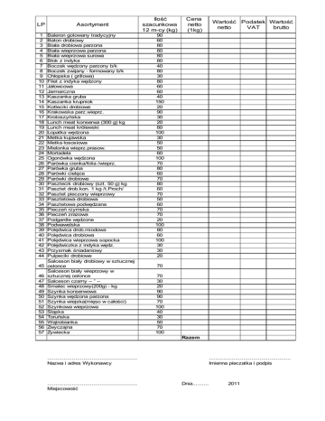 LP 1 2 3 4 5 6 7 8 9 10 11 12 13 14 15 16 17 18 19 20 21 22 23 24 25 26 27 28 29 30 31 32 33 34 35 36 37 38 39 40 41 42 43 44 45 46 47 48 49 50 51 52 53 54 55 56 57 Asortyment Baleron gotowany tradycyjny Baton drobiowy Biała drobiowa parzona Biała wieprzowa parzona Biała wieprzowa surowa Blok z indyka Boczek wędzony parzony b/k Boczek zwijany - formowany b/k Chłopska ( grillowa) Filet z indyka wędzony Jałowcowa Jarmarczna Kaszanka gruba Kaszanka krupniok Kotleciki drobiowe Krakowska parz.wieprz. Krotoszyńska Lunch meat konserwa (300 g) kg Lunch meat królewski Łopatka wędzona Metka kujawska Metka łososiowa Mielonka wieprz.prasow. Mortadela Ogonówka wędzona Parówka cienka/folia /wieprz. Parówka gruba Parówki cielęce Parówki drobiowe Pasztecik drobiowy (szt. 50 g) kg Pasztet drob.kon. 1 kg /t.Proch/ Pasztet pieczony wieprzowy Pasztetowa drobiowa Pasztetowa podwędzana Pieczeń rzymska Pieczeń zrazowa Podgardle wędzone Podwawelska Polędwica drob.miodowa Polędwica drobiowa Polędwica wieprzowa sopocka Polędwiczka z indyka wędz. Przysmak śniadaniowy Pulpeciki drobiowe Salceson biały drobiowy w sztucznej osłonce Salceson biały wieprzowy w sztucznej osłonce Salceson czarny -- ” -Smalec wieprzowy(200g) - kg Szynka konserwowa Szynka wędzona parzona Szynka wiejska(mięso w całości) Szynkowa wieprzowa Śląska Toruńska Wątrobianka Zwyczajna Żywiecka Ilość szacunkowa 12 m-cy (kg) Cena netto (1kg) Wartość Podatek Wartość netto VAT brutto 90 60 80 80 80 80 40 80 30 80 60 60 40 150 20 90 30 20 80 100 30 50 50 60 100 70 80 60 70 80 60 70 50 60 70 70 20 100 80 60 100 30 30 20 70 70 30 20 90 90 70 100 40 30 50 70 100 Razem ....................................................... Nazwa i adres Wykonawcy ....................................................... Miejscowość .................................................. Imienna pieczatka i podpis Dnia...................2010 2011 r. LP 1 2 3 4 5 6 7 8 9 10 11 12 13 14 15 16 17 18 19 20 21 Asortyment Ilość szacunkowa 12 m-cy (kg) Boczek świeży b/s b/ż Flaki krojone gotowane Karkówka bez kości Kości schabowe Kości schabowe wędzone Łopatka bez kości b/skóry Łopatka z kością b/skóry Mieso mielone wp-woł Mięso gulaszowe wiep. Nogi wieprzowe Ozory wieprzowe Ozory wołowe Podgardle świeże Polędwiczki wieprzowe Rostbef bez kości Schab bez kości Schab z kością Słonina bez skóry Szynka bez kości (kulka) Wątróbka wieprzowa Żeberka wieprz.kl1 Cena netto (1kg) Wartość Podate Wartość netto k VAT brutto 20 100 250 30 30 400 100 40 30 70 80 80 20 50 130 130 70 50 70 100 80 Razem ....................................................... Nazwa i adres Wykonawcy ....................................................... Miejscowość .................................................. Imienna pieczatka i podpis Dnia........ 2011 r. LP Asortyment Ilość Cena szacunkow Wartość netto a 12 m-cy netto (1kg) (kg) 6 Ćwiartka tylna kurcz.św. Kurczak świeży Mięso mielone drobiowe Pałka z kurczaka Pierś z indyka b/k św. Pierś z kurczaka b/k św. 7 8 9 10 11 Porcje rosołowe Serca drobiowe Skrzydło z kurczaka Udko z kurczaka Udziec z kurczaka 1100 50 50 200 150 12 13 Watróbka drobiowa św. Żołądki drobiowe Razem 200 150 1 2 3 4 5 Nazwa i adres Wykonawcy Podatek Wartość VAT brutto 200 350 50 50 50 300 Imienna pieczatka i podpis ....................................................... Dnia........ Miejscowość 2011 r. LP 1 2 3 4 5 6 7 8 9 10 11 12 13 14 15 16 17 Asortyment 18 19 20 21 22 23 24 25 26 27 28 29 30 31 32 33 34 35 36 Arbuz kg Banan kg Botwina kg Brokuły mrożone kg Brokuły świeże kg Brukselka kg Brzoskwinie szt. Burak ćwikłowy kg Cebula czerwona kg Cebula zw. kg Chrzan świeży kg Cukinia kg Cytryna kg Czosnek świeży kg Dynia kg Fasola sucha Jaś kg Fasolka szparagowa kg Fasolka szparagowa mroż. Kg Grapefruit biały kg Grapefruit czerwony kg Groch łuskany połówki kg Jabłka deserowe kg Jabłka prażone kg Kabaczki kg Kalafior mrożony kg Kalafior świeży kg Kalarepa kg Kapusta biała kg Kapusta czerwona kg Kapusta kiszona kg Kapusta pekińska kg Kapusta włoska kg Kiwi szt. Koper zielony kg Mandarynka kg Marchew myta kg 37 38 39 40 41 42 43 44 45 46 47 48 Mrożonki warzywne 7-skł.kg Nektarynki kg Ogorek świeży kg Ogórek kiszony kg Papryka świeża kg Pieczarka świeża kg Pietruszka korzeń kg Pietruszka nać kg Pomarańcza kg Pomidor kg Por kg Rabarbar kg Ilość szacunkowa 6 m-cy (kg,szt.) 100 100 30 90 90 20 170 300 20 160 5 30 180 5 10 30 90 90 70 30 50 270 50 20 90 90 20 280 150 100 110 40 600 40 200 1 000 10 90 100 70 10 70 150 40 80 100 40 10 Cena netto Wartość Podatek Wartość (1kg/ netto VAT brutto 1szt.) 49 50 51 52 53 54 55 56 57 58 59 60 61 62 63 64 65 66 67 Rzepa biala kg Rzepa czarna kg Rzodkiewka kg Sałata karbowana szt. Sałata lodowa szt. Sałata zielona szt. Seler kg Seler nać szt. Szczypior szt. Szpinak świeży kg Szpinak mrożony kg Śliwka kg Jagody kg Truskawka kg Winogrona białe kg Winogrona czerwone kg Wiśnia kg Włoszczyzna kg Ziemniak stary kg Ziemniak młody kg 68 /zbiór 01.07-15.08/ Ziemniak młody kg 69 /zbiór po15.08.2011r./ 60 40 20 50 50 180 150 30 150 30 30 20 10 50 60 30 20 20 800 1 000 2 000 Razem ....................................................... Nazwa i adres Wykonawcy ....................................................... Miejscowość .................................................. Imienna pieczatka i podpis Dnia...................2010 ......2011 r. r. LP 1 2 3 4 5 6 7 8 9 10 11 12 13 14 15 16 17 18 19 20 21 22 23 24 25 26 27 Asortyment Drożdze (100 g) - kg Jogurt natur. b/c mały (180 g) kg Jogurt owocowy (150 g) kg Kefir nat.b/c mały (180 g) – kg Lody wielosmakowe (100 g) - kg Margaryna Palma (250 g) – kg Masło eks.82% tł.(200g) kg Masło mix śmiet. (200 g) (Typu Dobry śmietankowy) – kg Maślanka Mrągowska 1 litr Mleko świeże 2 % karton 1 litr Mleko w proszku pełnotł.(500g) kg Napój mleczny (