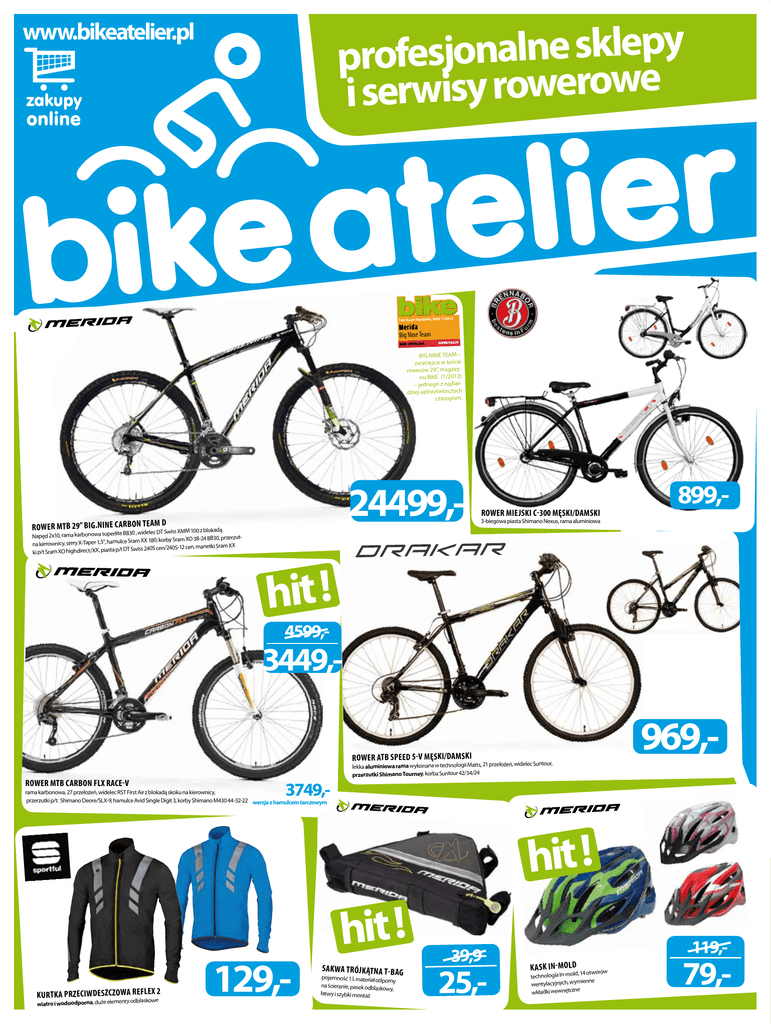 y p le k s e ln a n o j s e f pro e w o r e w o r y is w r i se www.bikeatelier.pl Test Race-Hardtails, BIkE 1/2012 Big Nine Team BIG.NINE TEAM – zwycięzca w teście rowerów 29”, magazynu BIKE (1/2012) – jednego z najbardziej opiniotwórczych czasopism. 24499,- Team D Rower MTB 29” Big.NIne Carbon , widelec DT Swiss XMM 100 z blokadą Rower miejski C-300 męski/damski 899,- 3-biegowa piasta Shimano Nexus, rama aluminiowa BB30 Napęd 2x10, rama karbonowa superlite przerzutce Sram XX 180, korby Sram XO 38‑24 BB30, na kierownicy, stery X-Taper 1,5”, hamul 240S cen/240S‑12 cen, manetki Sram XX Swiss DT p/t piasta X, rect/X highdi XO ki p/t Sram hit ! 4599,- 3449,Rower ATB Speed 5-V męski/damski Rower MTB CARBON FLX Race-V 3749,- 969,- lekka aluminiowa rama wykonana w technologii Matts, 21 przełożeń, widelec przerzutki Shimano Tourney, korba Suntour 42/34/24 Suntour, rama karbonowa, 27 przełożeń, widelec RST First Air z blokadą skoku na kierownicy, przerzutki p/t: Shimano Deore/SLX-9, hamulce Avid Single Digit 3, korby Shimano M430 44-32-22 wersja z hamulcem tarczowym hit ! ex 2 kurtka przeciwdeszczowa Reflkowe odblas wiatro i wodoodporna, duże elementy 129,- hit ! sakwa trójkątna T-Bag pojemność 1 l, materiał odp orny na ścieranie, pasek odblasko wy, łatwy i szybki montaż 39,9- 25,- 119,- Kask in-mold , 14 otworów technologia In-mold ienne wentylacyjnych, wym e wkładki wewnętrzn 79,- www.bikeatelier.pl Rower ATB Matts 5-V Tourney , 21 przełożeń, szerokie aluminiowa rama, osprzęt Shimano Suntour siodełko, gięta kierownica, amortyzator Rower MTB Aim V-brake lekka aluminiowa rama ze stopu 6061, amortyzator Suntour z blokadą skoku, 24 przełożenia, osprzęt Shimano Alivio/Acera Rowery CUBE dostępne tylko w sklepie w Tychach. 1119,- 1799,- 1359,- Rower ATB Speed 20-MD męski/damski rama aluminiowa ze stopu 6061, hamulce tarczowe Hayes, wzmocnione obręcze, 24 przełożenia, widelec Suntour z blokadą skoku, przerzutki p/t: Shimano M190/Acera-X, korba Suntour 42-34-24 1790,Rower MTB Aspect 50 ą skoku, osprzęt Shimano 24 przełożenia, widelec Suntour z blokad lekka aluminiowa rama ze stopu 6061, cu, Dąbrowie Górniczej i Katowicach. Sosnow ch, Gliwica w: ch sklepa w ne Rowery SCOTT dostęp Acera/Altus 1899,- Rower MTB Scale 80 Shimano FC-M430-8 żeń, widelec Suntour z blokadą, korby podwójnie cieniowana rama, 27 przeło tarczowe Shimano M446 ce hamul liczne hydrau , Deore Alivio/ no Octalink 44x32x22T, przerzutki p/t: Shima zej i Katowicach. Górnic wie Dąbro cu, Sosnow ch, Gliwica Rowery SCOTT dostępne w sklepach w: Rower MTB Matts 500-D lekka rama w technologii TFS, amortyzator Suntour z blokadą na kierownicy, 30 biegów, hamulce tarczowe Shimano M446 180/160, korby Shimano M522-10 42-32-24, przerzutki p/t: Shimano Deore/XT-10 2890,- 3349,- 2229,- Rower MTB Matts TFS 100-V lekka rama w technologii TFS, 24 przełożenia, amortyzator Suntour z blokadą skoku, korby Shimano M171 42-34-24 CG, przerzutka p/t M190/Alivio Rower MTB O.Nine Pro XT-D 8, sportowa geometria na kierownicy, lekka karbonowa rama o.nine carbon pro-D, amortyzator FOX z blokadą przerzutki 30 biegów, hamulce tarczowe Shimano M596 180/160, korby Shimano XT 42-32-22, p/t: Shimano XT direct/XT-10, manetki Shimano Deore XT Rapidfire wersja z hamulcem tarczowym Tektro Draco 8399,- www.bikeatelier.pl 949,- Rower BMX Brad ST 5 szybkie tempo 1099,- rotor przeznaczony do dirtu i streetu, pegi i Rower fitness Speeder T1 Rower BMX Brad ST 4 przeznaczony do dirtu i streetu, pegi i rotor 2229,- 24 przełożenia, korby Shimano M171 48-38-28 CG, przerzutki p/t: Shimano M310/Sora, łączy szybkość i lekkość roweru szosowego z wygodą roweru crossowego 2229,- Rower szosowy Race 880-16hamulce Road Dual Pivot, korby FSA lekka rama wykonana w technologii TFS, 2300/Sora, manetki Shimano ST2300 Tempo 53-39, przerzutki p/t: Shimano Rower szosowy Race Lite 901 3349,- Lekka rama wykonana w technologii HFS, karbonowy widelec, 18 przełożeń, hamul ce Shimano Sora, korby Shimano R345 50-34, przerzutki p/t: Shimano Sora D/Sora SS, manetki Shimano Sora, stery X-Taper 1,5” Rower MTB z zawieszeniem One-Twent y 500-D komfortowe zawieszenie idealne na długie górskie trasy, amortyzator Rock Shox damper X-Fusion O2RL, 30 o skoku 120 mm, biegów, korby Shimano w technologii Hollowtech 2 przerzutki p/t: Shimano Deo M522-10 42-32-24, re-10/XT-10, hydrauliczne hamulce tarczowe Shimano M446 180 kobiecy styl 5249,- 8919,- ty-Nine XT-D Rower MTB z zawieszeniem Nine zenia, amortyzator Fox 32 Flotrakcja dzięki nowemu rozwiązaniu zawies ała rama amortyzowana 99mm skoku, doskon 180/160, napęd 2x10, korby Shimano 38 ABS w/remote, hamulce Shimano M596 at RL 100 taper, damper DT Swiss M210 m mediu -10 XT/XT XT 40-28, przerzutka p/t: śnie zachowują do kobiecej sylwetki i estetyki, jednocze są e wan aso dop lnie idea skie dam korz ystny ery Nowe row tek zapewniają wygodną poz ycję, a także mos z ora a ram tsza Kró try. ame par e najlepsze sportow , i efektywna. rozkład sił. Jazda na nich jest i komfortowa hit ! 1119,Juliet 5-V Rower damski ATa,Bosprzęt Shimano ram Lekka aluminiowa tour żeń, amortyzator Sun Tourney, 21 przeło 1999,- Rower damski MTB Juliet 100-V lekka aluminiowa rama w technologii TFS, osprzęt Shimano Alivo/Acera, 24 przełożenia, hamulce Avid Single Digit 3 1449,- Rower damski MTB Access lekka aluminiowa rama ze stopu 7005, 27 przełożeń, amortyzator Suntour z blokadą skoku, osprzęt Shima no Alivo Rowery CUBE dostępne tylko w sklepie w Tychach. 2099,- miejski ruch www.bikeatelier.pl 969,Rower crossowy Cross 5-V męski/damski aluminiowa rama ze stopu 6061, 24 przeło żenia, lekka rama wykonana w technologii Matts, amortyzator Suntour, 21 przełożeń, przerzutki Shimano Rower miejski City 6100 3-biegowa piasta Shimano Nexus, koła 26”, rama aluminiowa ze stopu 6061, przednia piasta z dynamem, kpl. oświetlenia, bagażnik, błotniki Rower crossowy Cross 20-MD męski/dam hamu