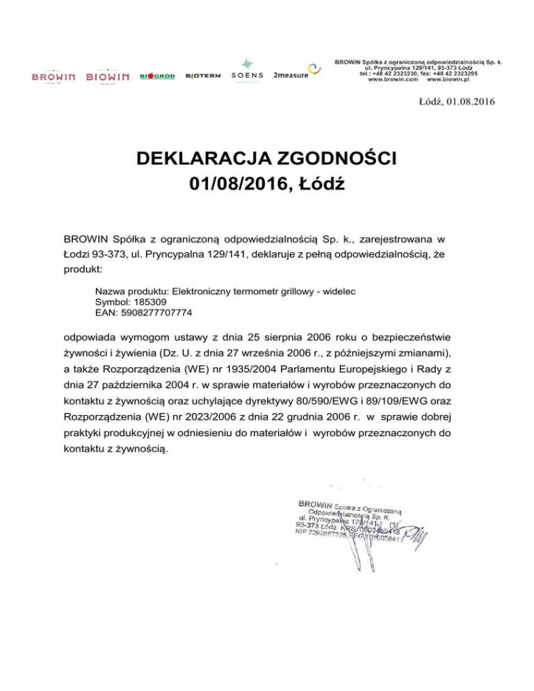 Łódź, 01.08.2016 DEKLARACJA ZGODNOŚCI 01/08/2016, Łódź BROWIN Spółka z ograniczoną odpowiedzialnością Sp. k., zarejestrowana w Łodzi 93-373, ul. Pryncypalna 129/141, deklaruje z pełną odpowiedzialnością, że produkt: Nazwa produktu: Elektroniczny termometr grillowy - widelec Symbol: 185309 EAN: 5908277707774 odpowiada wymogom ustawy z dnia 25 sierpnia 2006 roku o bezpieczeństwie żywności i żywienia (Dz. U. z dnia 27 września 2006 r., z późniejszymi zmianami), a także Rozporządzenia (WE) nr 1935/2004 Parlamentu Europejskiego i Rady z dnia 27 października 2004 r. w sprawie materiałów i wyrobów przeznaczonych do kontaktu z żywnością oraz uchylające dyrektywy 80/590/EWG i 89/109/EWG oraz Rozporządzenia (WE) nr 2023/2006 z dnia 22 grudnia 2006 r. w sprawie dobrej praktyki produkcyjnej w odniesieniu do materiałów i wyrobów przeznaczonych do kontaktu z żywnością. Łódź, 01.08.2016 Declaration of Compliance 01/08/2016, Łódź BROWIN company, placed in Łódź 93-373, 129/141 Pryncypalna Street, declares that following product: Product: Electronic grill thermometer - fork Symbol: 185309 EAN: 5908277707774 is consistent with requirements included in Regulation (EC) No 1935/2004 of the European Parliament and of the Council of 27th October 2004 on materials and articles intended to come into contact with food and repealing Directives 80/590/EEC and 89/109 EEC, and Regulation (EC) No 2023/2006 of 22 December 2006 on good manufacturing practice for materials and articles intended to come into contact with food. 15.03.2016r. DEKLARACJA ZGODNOŚCI 15/03/2016, Łódź BROWIN Spółka z ograniczoną odpowiedzialnością Sp.k., zarejestrowana w Łodzi 93-373, ul. Pryncypalna 129/141, deklaruje z pełną odpowiedzialnością, że produkt: Product: Elektroniczny termometr grillowy - widelec Symbol: 185309 EAN: 5908277707774 Spełnia wymagania zawarte w: Dyrektywie 2004/108/WE Parlamentu Europejskiego i Rady z dnia 15 grudnia 2004 r. w sprawie zbliżenia ustawodawstw Państw Członkowskich odnoszących się do kompatybilności elektromagnetycznej i uchylającej dyrektywę 89/336/EWG; Dyrektywie Parlamentu Europejskiego i Rady 2014/30/UE z dnia 26 lutego 2014 r. w sprawie harmonizacji ustawodawstw państw członkowskich odnoszących się do kompatybilności elektromagnetycznej; Dyrektywie Parlamentu Europejskiego i Rady 2011/65/UE z dnia 8 czerwca 2011 r. w sprawie ograniczenia stosowania niektórych niebezpiecznych substancji w sprzęcie elektrycznym i elektronicznym; Rozporządzeniu (WE) nr 1907/2006 Parlamentu Europejskiego i Rady z dnia 18 grudnia 2006 r. w sprawie rejestracji, oceny, udzielania zezwoleń i stosowanych ograniczeń w zakresie chemikaliów (REACH) i utworzenia Europejskiej Agencji Chemikaliów, zmieniające dyrektywę 1999/45/WE oraz uchylające rozporządzenie Rady (EWG) nr 793/93 i rozporządzenie Komisji (WE) nr 1488/94, jak również dyrektywę Rady 76/769/EWG i dyrektywy Komisji 91/155/EWG, 93/67/EWG, 93/105/WE i 2000/21/WE; Dyrektywie parlamentu europejskiego i rady nr 1999/5/WE z dnia 9 marca 1999 r. w sprawie urządzeń radiowych i końcowych urządzeń telekomunikacyjnych oraz wzajemnego uznawania ich zgodności. JEŻELI BEZPRZEWODOWY 15.03.2016r. Declaration of Compliance 15/03/2016, Łódź BROWIN company, placed in Łódź 93-373, 129/141 Pryncypalna Street, declares that the following product: Product: Electronic grill thermometer - fork Symbol: 185309 EAN: 5908277707774 Is consistent with the requirements included in: Directive 2004/108/EC of the European Parliament and of the Council of 15 December 2004 on the approximation of the laws of the Member States relating to electromagnetic compatibility and repealing Directive 89/336/EEC; Directive 2014/30/EU of the European Parliament and of the Council of 26 February 2014 on the harmonisation of the laws of the Member States relating to electromagnetic compatibility; Directive 2011/65/EU of the European Parliament and of the Council of 8 June 2011 on the restriction of the use of certain hazardous substances in electrical and electronic equipment; Regulation (EC) No 1907/2006 of the European Parliament and of the Council of 18 December 2006 concerning the Registration, Evaluation, Authorisation and Restriction of Chemicals (REACH), establishing a European Chemicals Agency, amending Directive 1999/45/EC and repealing Council Regulation (EEC) No 793/93 and Commission Regulation (EC) No 1488/94 as well as Council Directive 76/769/EEC and Commission Directives 91/155/EEC, 93/67/EEC, 93/105/EC and 2000/21/EC; Directive 1999/5/EC of the European Parliament and of the Council of 9 March 1999 on radio equipment and telecommunications terminal equipment and the mutual recognition of their conformity. JEŻELI BEZPRZEWODOWY