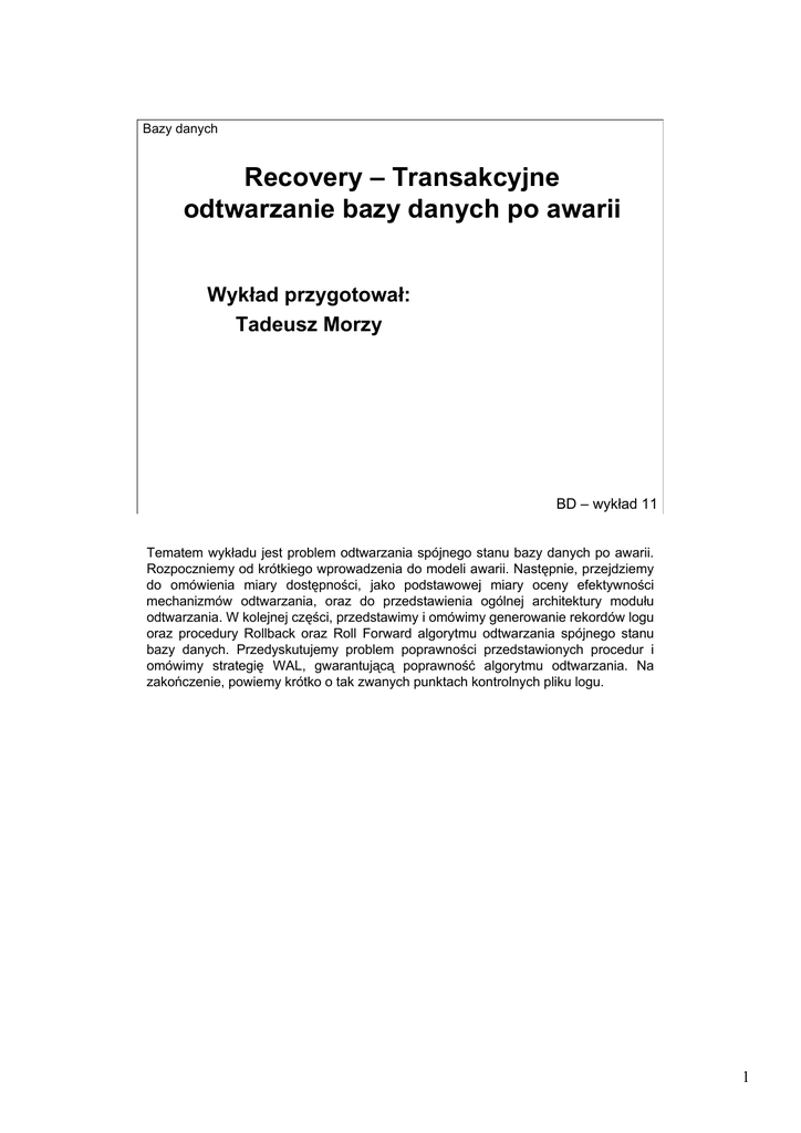 Bazy danych Recovery – Transakcyjne odtwarzanie bazy danych po awarii Wykład przygotował: Tadeusz Morzy BD – wykład 11 Tematem wykładu jest problem odtwarzania spójnego stanu bazy danych po awarii. Rozpoczniemy od krótkiego wprowadzenia do modeli awarii. Następnie, przejdziemy do omówienia miary dostępności, jako podstawowej miary oceny efektywności mechanizmów odtwarzania, oraz do przedstawienia ogólnej architektury modułu odtwarzania. W kolejnej części, przedstawimy i omówimy generowanie rekordów logu oraz procedury Rollback oraz Roll Forward algorytmu odtwarzania spójnego stanu bazy danych. Przedyskutujemy problem poprawności przedstawionych procedur i omówimy strategię WAL, gwarantującą poprawność algorytmu odtwarzania. Na zakończenie, powiemy krótko o tak zwanych punktach kontrolnych pliku logu. 1 Bazy danych Cel odtwarzania • Podstawowym celem mechanizmów transakcyjnego odtwarzania bazy danych po awarii jest odtworzenie spójnego stanu bazy danych • Definicja odtwarzania – wiąże się bezpośrednio z problemem efektywnej implementacji własności atomowości i trwałości transakcji (własności ACID) BD – wykład 11 (2) Podstawowym celem algorytmów transakcyjnego odtwarzania bazy danych po awarii jest odtworzenie spójnego stanu bazy danych sprzed awarii. Pierwsze pytanie, które się nasuwa, to jaki stan spójny chcemy odtworzyć? W trakcie wykonywania setek czy tysięcy transakcji, stan bazy danych, praktycznie, nigdy nie jest spójny! Odpowiedź na postawione pytanie wynika z definicji transakcji. Stan spójny bazy danych, który będzie odtworzony po awarii, to taki stan, który gwarantuje własności atomowości i trwałości wykonywanych transakcji (własności ACID). Do sformułowania poprawnego stanu bazy danych po awarii wrócimy później na wykładzie. 2 Bazy danych Modele awarii • Miękki model awarii – awaria nie niszczy danych w pamięci zewnętrznej • Twardy model awarii - awaria niszczy dane w pamięci zewnętrznej • „Niedeterministyczny” charakter błędów prowadzących do wystąpienia awarii systemu – błędy w oprogramowaniu systemowym (tzw. „Heisenbugs”) • Podejście „Fail-stop crash”: – Wyłącz serwer – Odtwórz spójny stan bazy danych – Restartuj system BD – wykład 11 (3) Zanim przejdziemy do dyskusji i prezentacji procedury odtwarzania bazy danych po awarii, wprowadzimy klasyfikację modeli awarii. Klasyfikacji awarii jest wiele – ta wprowadzona dla potrzeb wykładu wyróżnia dwa podstawowe typy awarii – tak zwane awarie miękkie i awarie twarde. Awaria miękka to awaria, która nie niszczy danych w pamięci zewnętrznej. Innymi słowy, awaria miękka to awaria, która nie niszczy mediów zewnętrznych. Awaria twarda to awaria, która niszczy dane w pamięci zewnętrznej. W dalszej części wykładu zakładamy model awarii miękkich, dla których opracowano systemowe mechanizmy przeciwdziałania. W przypadku awarii twardych, typowe rozwiązania sprowadzają się do replikacji danych i oprogramowania oraz sprzętu. Do grupy awarii miękkich zaliczamy te awarie, które prowadzą do utraty danych w pamięci operacyjnej. Są to, głównie, błędy oprogramowania systemowego i aplikacyjnego, które prowadzą do błędnego działania systemu, oraz zaniki napięcia, których skutki, z punktu wiedzenia działania systemu są podobne. Mówiąc o awariach, najczęściej, jako źródło awarii podaje się zanik napięcia. W praktyce ten rodzaj awarii występuje bardzo rzadko. Najczęstszym typem awarii są błędy w oprogramowaniu. Błędy te mają charakter niedeterministyczny. W przypadku, gdy występuje determinizm zdarzeń prowadzących do awarii, to ich źródło można usunąć. W przypadku błędów o charakterze niedeterministycznym mówimy często o tak zwanych błędach typu „Heisenbug” od nazwiska słynnego niemieckiego fizyka Wernera Heisenberga. Najlepszym sposobem rozwiązania problemów z błędami typu „Heisenbugs” jest podejście nazwane „fail_stop crash”. Polega ono na: wyłączeniu serwera, odtworzeniu poprawnego (spójnego) stanu systemu w oparciu o mechanizm redo/undo w celu zapewnienia własności ACID, i na restarcie serwera. 3 Bazy danych Efektywność odtwarzania • Konieczność minimalizacji czasu odtwarzania po awarii w trakcie odtwarzania serwer i dane są niedostępne • Miara efektywności odtwarzania – dostępność systemu, tj. prawdopodobieństwo, że próbkując losowo użytkownik znajduje system gotowy do realizacji żądań dostępu MTTF MTTF + MTTR MTTF – średni czas do awarii MTTR – średni czas odtworzenia po awarii BD – wykład 11 (4) Mechanizm odtwarzania stanu spójnego powinien być poprawny, ale powinien być również efektywny. W trakcie odtwarzania systemu serwer i dane są niedostępne, stąd, konieczność minimalizacji czasu odtwarzania. Miarą efektywności procedury odtwarzania jest tak zwana dostępność systemu. Dostępność systemu definiuje się jako prawdopodobieństwo, że próbkując losowo system użytkownik znajduje ten system gotowy do realizacji żądań dostępu. 4 Bazy danych Dostępność • Przykład: raz w miesiąca ma miejsce awaria serwera, odtworzenie stanu serwera zajmuje 2 godz., czas niedostępności serwera – 26 godz./rocznie dostępność = (720/722) = 99,7 % • Przykład: awaria serwera ma miejsce raz na 48 godz., odtworzenie stanu serwera zajmuje 30 sek. dostępność = 99,98 % • Wniosek: efektywność odtwarzania ma kluczowe znaczenie z punktu widzenia dostępności systemu • Inna miara efektywności odtwarzania: ilość zasobów niezbędnych, podczas normalnego działania systemu, do tego, aby w razie awarii poprawnie odtworzyć stan systemu BD – wykład 11 (5) Od czego zależy dostępność systemu? Łatwo zauważyć, że podstawowym czynnikiem determinującym dostępność systemu jest czas odtworzenia systemu po awarii. Dla ilustracji rozważmy dwa przypadki. Załóżmy