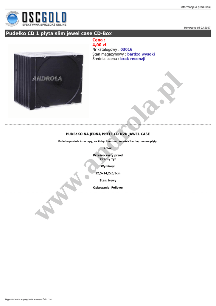 Informacje o produkcie Utworzono 03-03-2017 Pudełko CD 1 płyta slim jewel case CD-Box Cena : 4,00 zł ro la .p l Nr katalogowy : 03016 Stan magazynowy : bardzo wysoki Średnia ocena : brak recenzji PUDEŁKO NA JEDNĄ PŁYTĘ CD DVD JAWEL CASE nd Pudełko posiada 4 zaczepy, na których można zamieścić kartkę z nazwą płyty. Kolor: w .a Przeźroczysty przód Czarny Tył Wymiary: 12,5x14,2x0,5cm Stan: Nowy w w Opkowanie: Foliowe Wygenerowano w programie www.oscGold.com