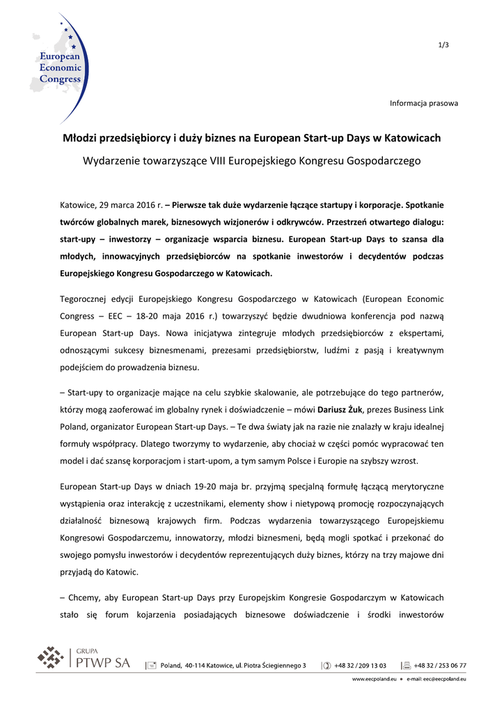 1/3 Informacja prasowa Młodzi przedsiębiorcy i duży biznes na European Start-up Days w Katowicach Wydarzenie towarzyszące VIII Europejskiego Kongresu Gospodarczego Katowice, 29 marca 2016 r. – Pierwsze tak duże wydarzenie łączące startupy i korporacje. Spotkanie twórców globalnych marek, biznesowych wizjonerów i odkrywców. Przestrzeń otwartego dialogu: start-upy – inwestorzy – organizacje wsparcia biznesu. European Start-up Days to szansa dla młodych, innowacyjnych przedsiębiorców na spotkanie inwestorów i decydentów podczas Europejskiego Kongresu Gospodarczego w Katowicach. Tegorocznej edycji Europejskiego Kongresu Gospodarczego w Katowicach (European Economic Congress – EEC – 18-20 maja 2016 r.) towarzyszyć będzie dwudniowa konferencja pod nazwą European Start-up Days. Nowa inicjatywa zintegruje młodych przedsiębiorców z ekspertami, odnoszącymi sukcesy biznesmenami, prezesami przedsiębiorstw, ludźmi z pasją i kreatywnym podejściem do prowadzenia biznesu. – Start-upy to organizacje mające na celu szybkie skalowanie, ale potrzebujące do tego partnerów, którzy mogą zaoferować im globalny rynek i doświadczenie – mówi Dariusz Żuk, prezes Business Link Poland, organizator European Start-up Days. – Te dwa światy jak na razie nie znalazły w kraju idealnej formuły współpracy. Dlatego tworzymy to wydarzenie, aby chociaż w części pomóc wypracować ten model i dać szansę korporacjom i start-upom, a tym samym Polsce i Europie na szybszy wzrost. European Start-up Days w dniach 19-20 maja br. przyjmą specjalną formułę łączącą merytoryczne wystąpienia oraz interakcję z uczestnikami, elementy show i nietypową promocję rozpoczynających działalność biznesową krajowych firm. Podczas wydarzenia towarzyszącego Europejskiemu Kongresowi Gospodarczemu, innowatorzy, młodzi biznesmeni, będą mogli spotkać i przekonać do swojego pomysłu inwestorów i decydentów reprezentujących duży biznes, którzy na trzy majowe dni przyjadą do Katowic. – Chcemy, aby European Start-up Days przy Europejskim Kongresie Gospodarczym w Katowicach stało się forum kojarzenia posiadających biznesowe doświadczenie i środki inwestorów 2/3 Informacja prasowa z formującymi się nowatorskimi inicjatywami czy spółkami, a potem zasilenia tych oryginalnych pomysłów kapitałem rozwojowym i menedżerskim doradztwem – mówi Wojciech Kuśpik, inicjator Europejskiego Kongresu Gospodarczego, prezes Grupy PTWP. Młodzi przedsiębiorcy, osoby z pomysłem i rozwiązaniami, które mogą być przydatne dla korporacji lub biznesu, już teraz mogą zgłaszać się do konkursu pod nazwą Start-up Challenge. Jego laureaci będą mieli okazję zaprezentować się przed inwestorami, uczestnikami European Start-up Days oraz gośćmi Europejskiego Kongresu Gospodarczego. W ciągu European Start-up Days (19-20 maja br.) odbędą się liczne debaty i wykłady obejmujące tematy związane z rozwojem i wspieraniem polskiej przedsiębiorczości, finansowaniem, dialogiem pomiędzy korporacjami a startupami. Zaplanowano również Scale-up Alley – przestrzeń do prezentacji biznesu na autorskich stoiskach. Na potrzeby dwudniowego wydarzenia, w którym jak szacują organizatorzy, udział wziąć może nawet dwa tysiące uczestników, oddany zostanie obiekt wyjątkowy na architektonicznej mapie Katowic. Miejscem spotkań z inwestorami i potencjalnymi partnerami podczas European Start-up Days będzie Hala Widowiskowo-Sportowa Spodek. Startup Pitches i Networking Zone to strefy, w których każdy będzie mógł zaprezentować swój pomysł na biznes przed prezesami spółek, potencjalnymi inwestorami, ekspertami i od razu otrzymać informację zwrotną co do możliwości jego wdrożenia. Pitchingi to 3-minutowe prezentacje, które odbędą się na kilku scenach w Spodku oraz przed praktykami biznesu i ekspertami obecnymi na Europejskim Kongresie Gospodarczym w Międzynarodowym Centrum Kongresowym w Katowicach. Inicjatywa European Start-up Days ma na celu integrację twórców globalnych marek i młodych, biznesowych wizjonerów. Wydarzenie towarzysząc VIII Europejskiemu Kongresowi Gospodarczemu umożliwi budowę sieci kontaktów i długotrwałych relacji pomiędzy potencjalnymi partnerami, reprezentującymi z jednej strony doświadczenie i możliwości dużych korporacji, z drugiej zapał oraz innowacyjność młodych przedsiębiorców. 3/3 Informacja prasowa Ósma edycja organizowanego przez Grupę PTWP Europejskiego Kongresu Gospodarczego odbędzie się w dniach 18-20 maja 2016 r. w Katowicach. Trzydniowy cykl debat, spotkań i wydarzeń towarzyszących zgromadzi ponad siedem tysięcy gości z krajów europejskich, Azji i Afryki, reprezentantów biznesu, prezesów największych firm, decydentów, naukowców i praktyków, przedstawicieli świata polityki i samorządów. Szczegółowe informacje European Start-up Days dostępne są na stronie internetowej: http://www.estartupdays.eu/pl/ Udział w wydarzeniu jest bezpłatny, rejestracja online: https://konto.ptwp.pl/rejestracja/europeanstart-up-days,188.html *** Europejski Kongres Gospodarczy (European Economic Congress – EEC) w Katowicach to trzydniowy cykl debat, spotkań i wydarzeń towarzyszących z udziałem ponad 7 tysięcy gości z Polski, Europy, świata. W blisko 100 sesjach bierze co roku udział kilkuset panelistów, komisarze unijni, premierzy i przedstawiciele rządów państw europejskich, prezesi największych firm, naukowcy i praktycy, decydenci, mający realny wpływ na życie gospodarcze i społeczne. W opiniotwórczym gronie, w formie otwartej debaty publicznej, prowadzone są rozmowy o kwestiach najistotniejszych dla rozwoju Europy. Europejski Kongres Gospodarczy został uznany za forum jednej z najbardziej reprezentatywnych dyskusji o przyszłości Europy. Tezy wystąpień najważniejszych uczestników są często cytowane i szeroko komentowane. Organizatorem Europejskiego Kongresu Gospodarczego
