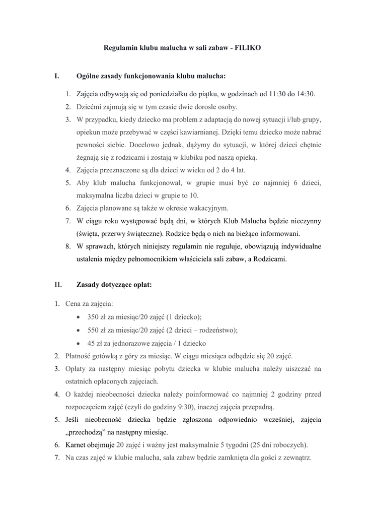 Regulamin klubu malucha w sali zabaw - FILIKO I. Ogólne zasady funkcjonowania klubu malucha: 1. Zajęcia odbywają się od poniedziałku do piątku, w godzinach od 11:30 do 14:30. 2. Dziećmi zajmują się w tym czasie dwie dorosłe osoby. 3. W przypadku, kiedy dziecko ma problem z adaptacją do nowej sytuacji i/lub grupy, opiekun może przebywać w części kawiarnianej. Dzięki temu dziecko może nabrać pewności siebie. Docelowo jednak, dążymy do sytuacji, w której dzieci chętnie żegnają się z rodzicami i zostają w klubiku pod naszą opieką. 4. Zajęcia przeznaczone są dla dzieci w wieku od 2 do 4 lat. 5. Aby klub malucha funkcjonował, w grupie musi być co najmniej 6 dzieci, maksymalna liczba dzieci w grupie to 10. 6. Zajęcia planowane są także w okresie wakacyjnym. 7. W ciągu roku występować będą dni, w których Klub Malucha będzie nieczynny (święta, przerwy świąteczne). Rodzice będą o nich na bieżąco informowani. 8. W sprawach, których niniejszy regulamin nie reguluje, obowiązują indywidualne ustalenia między pełnomocnikiem właściciela sali zabaw, a Rodzicami. II. Zasady dotyczące opłat: 1. Cena za zajęcia: 350 zł za miesiąc/20 zajęć (1 dziecko); 550 zł za miesiąc/20 zajęć (2 dzieci – rodzeństwo); 45 zł za jednorazowe zajęcia / 1 dziecko 2. Płatność gotówką z góry za miesiąc. W ciągu miesiąca odbędzie się 20 zajęć. 3. Opłaty za następny miesiąc pobytu dziecka w klubie malucha należy uiszczać na ostatnich opłaconych zajęciach. 4. O każdej nieobecności dziecka należy poinformować co najmniej 2 godziny przed rozpoczęciem zajęć (czyli do godziny 9:30), inaczej zajęcia przepadną. 5. Jeśli nieobecność dziecka będzie zgłoszona odpowiednio wcześniej, zajęcia „przechodzą” na następny miesiąc. 6. Karnet obejmuje 20 zajęć i ważny jest maksymalnie 5 tygodni (25 dni roboczych). 7. Na czas zajęć w klubie malucha, sala zabaw będzie zamknięta dla gości z zewnątrz. 8. Podczas pobytu dzieci w klubie malucha, rodzic będzie miał możliwość dostępu do kamery internetowej zamieszczonej w naszej sali zabaw – do uzgodnienia z rodzicami. 9. NIE PRZYJMUJEMY DZIECI CHORYCH LUB PODEJRZEWANYCH O CHOROBĘ ORAZ NIE PODAJEMY DZIECIOM LEKARSTW, NAWET W PRZYPADKU WYRAŹNEJ SUGESTII RODZICÓW. 10. Rodzice po otrzymaniu informacji o chorobie dziecka zobowiązani są do jego osobistego odbioru jak najszybciej – do 60 minut. Po tym czasie personel w trosce o zdrowie dziecka wezwie, na koszt rodziców, lekarza lub pogotowie. 11. Jedynymi osobami upoważnionymi do odbioru dziecka są jego rodzice lub opiekunowie prawni lub (osoby pisemnie przez nich upoważnione). 12. Rodzice/Opiekunowie wyrażają zgodę na umieszczenie zdjęć z zajęć prowadzonych z ich dziećmi na stronie internetowej www.filiko.pl oraz na profilu sali zabaw: facebook.com/nasze.filiko. III. Podczas trzech godzin pobytu dziecka w FILIKO: 1. Dzieci mają czas na swobodną zabawę na konstrukcji ze zjeżdżalnią oraz pozostałymi zabawkami dostępnymi w klubiku. 2. Spontaniczna zabawa zachęca dzieci do tego, aby były zaradne i samowystarczalne, a także rozwija ich naturalną, wrodzoną ciekawość świata. Ponadto, zabawa na konstrukcji sprzyja rozwojowi motorycznemu. 3. Dzieci jedzą drugie śniadanie / przekąskę, które przynoszą ze sobą. 4. W zależności od dnia tygodnia, dzieci biorą udział w zajęciach dodatkowych takich jak – rytmika, ruch rozwijający Weroniki Sherborne, zajęcia plastyczno – techniczne, sportowe z elementami tańca i jogi, gimnastyka buzi i języka i inne. 5. W okresie wiosennym i letnim, zajęcia dla dzieci będą odbywały się też w naszym ogródku. 6. Poglądowy plan dnia: 11:30 – 12:00 Oczekiwanie na wszystkie dzieci. Powitanie. 12:00 – 12:30 Zajęcia (jeśli na ten dzień tygodnia są zaplanowane). 12:30 – 12:50 Mycie rąk i przekąska. 12:50 – 14:20 Zabawa (w tym także czytanie bajek, słuchanie muzyki i inne). 14:30 Pożegnanie IV. Obowiązki rodziców lub opiekunów prawnych. Rodzice zobowiązani są do: 1. Wypełnienia karty informacyjnej. 2. Współpracy i przestrzegania regulaminu klubu malucha w procesie opiekuńczo – wychowawczym i dydaktycznym. 3. Przestrzegania zarządzeń klubu malucha mających na celu dbałość o bezpieczeństwo i zdrowie wszystkich dzieci uczęszczających do placówki, w tym zasad związanych z przyprowadzaniem zdrowych dzieci do klubu i informowaniem personelu klubu o aktualnym stanie zdrowia dziecka w momencie przyprowadzania go do klubu. 4. Przygotowanie wyprawki dla dziecka: Wyprawka powinna zawierać: a) II śniadanie/ przekąskę i picie dla dziecka. Może to być owoc, jogurt, serek, mus owocowy, kanapka; b) skarpety ANTYPOŚLIZGOWE; c) ubranie na zmianę w przypadku zamoczenia tj. długie spodnie (najlepiej dresowe lub leginsy, ponieważ w tym dzieci czują się najswobodniej i mogą w pełni korzystać z zajęć i zabawy), podkoszulkę, bluzkę z długim rękawem oraz majtki; d) pieluchy i mokre chusteczki (jeśli dziecko jest pieluszkowe); Przeczytałem regulamin i zgadzam się z jego warunkami. ………………………. (data, miejscowość) Właścicielem sali zabaw FILIKO jest firma: BADINO Maciej Wierzbowski, ul. Batorego 20/10, 81-366 Gdynia, NIP 7181715834. Pełnomocnik: Karina Wierzbowska. ………………………. (podpis pełnomocnika) Karta informacyjna (Imię i nazwisko dziecka) (Imię i nazwisko rodzica/opiekuna) (Numery telefonów do rodziców/opiekunów) (Adres zamieszkania dziecka) (Osoby upoważnione do odbioru dziecka: imię, nazwisko i PESEL) (Inne informacje np. alergie, poziom opanowania czynności samoobsługowych, choroby przewlekłe) Wyrażam zgodę na pomoc dziecku w toalecie: TAK NIE (data, podpis rodzica/opiekuna)