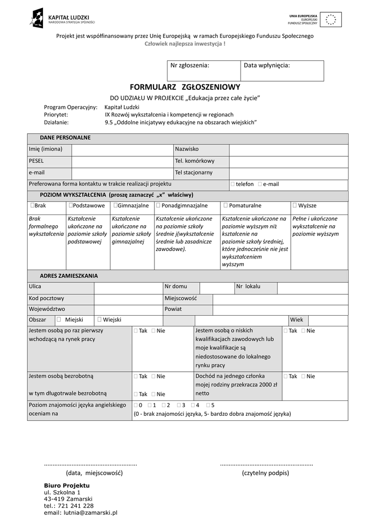 Projekt jest współfinansowany przez Unię Europejską w ramach Europejskiego Funduszu Społecznego Człowiek najlepsza inwestycja ! Nr zgłoszenia: Data wpłynięcia: FORMULARZ ZGŁOSZENIOWY DO UDZIAŁU W PROJEKCIE „Edukacja przez całe życie” Program Operacyjny: Priorytet: Działanie: Kapitał Ludzki IX Rozwój wykształcenia i kompetencji w regionach 9.5 „Oddolne inicjatywy edukacyjne na obszarach wiejskich” DANE PERSONALNE Imię (imiona) Nazwisko PESEL Tel. komórkowy e-mail Tel stacjonarny Preferowana forma kontaktu w trakcie realizacji projektu telefon e-mail POZIOM WYKSZTAŁCENIA (proszę zaznaczyć „x” właściwy) Brak Podstawowe Brak Kształcenie formalnego ukończone na wykształcenia poziomie szkoły podstawowej Gimnazjalne Ponadgimnazjalne Pomaturalne Wyższe Kształcenie ukończone na poziomie szkoły gimnazjalnej Kształcenie ukończone na poziomie szkoły średnie j(wykształcenie średnie lub zasadnicze zawodowe). Kształcenie ukończone na Pełne i ukończone poziomie wyższym niż wykształcenie na kształcenie na poziomie wyższym poziomie szkoły średniej, które jednocześnie nie jest wykształceniem wyższym ADRES ZAMIESZKANIA Ulica Nr domu Kod pocztowy Miejscowość Województwo Powiat Obszar Miejski Nr lokalu Wiejski Wiek Jestem osobą po raz pierwszy wchodzącą na rynek pracy Tak Nie Jestem osobą o niskich kwalifikacjach zawodowych lub moje kwalifikacje są niedostosowane do lokalnego rynku pracy Tak Nie Jestem osobą bezrobotną Tak Nie Tak Nie w tym długotrwale bezrobotną Tak Nie Dochód na jednego członka mojej rodziny przekracza 2000 zł netto Poziom znajomości języka angielskiego oceniam na 0 1 2 3 4 5 (0 - brak znajomości języka, 5- bardzo dobra znajomość języka) ...................................................... (data, miejscowość) Biuro Projektu ul. Szkolna 1 43-419 Zamarski tel.: 721 241 228 email: [email protected] ...................................................... (czytelny podpis) Projekt jest współfinansowany przez Unię Europejską w ramach Europejskiego Funduszu Społecznego Człowiek najlepsza inwestycja ! Oświadczenia kandydata/tki projektu: „Edukacja przez całe życie” Oświadczam, że : 1. zostałem poinformowany(-a), że Projekt jest współfinansowany ze środków Unii Europejskiej z Europejskiego Funduszu Społecznego w ramach Programu Operacyjnego Kapitał Ludzki, IX Rozwój wykształcenia i kompetencji w regionach, Działanie 9.5 „Oddolne inicjatywy edukacyjne na obszarach wiejskich” 2. zapoznałem/am się z Regulaminem projektu „Edukacja przez całe życie” i wyrażam zgodę na udział w postępowaniu rekrutacyjnym; 3. informacje zawarte w Formularzu zgłoszeniowym do projektu „Edukacja przez całe życie” są zgodne z prawdą; 4. nie jestem skazany/a prawomocnym wyrokiem za przestępstwo składania fałszywych zeznań przekupstwa, karno-skarbowe oraz przeciwko mieniu, wiarygodności dokumentów, obrotowi pieniędzmi i papierami wartościowymi, obrotowi gospodarczemu, systemowi bankowemu, albo inne związane z wykonywaniem działalności gospodarczej lub popełnione w celu osiągnięcia korzyści majątkowych; 5. zostałem poinformowany o fakcie, iż o przyjęciu decydują założenia projektowe oraz kolejność zgłoszeń; 6. mam świadomość, że zajęcia mogą odbywać się w miejscowości innej od mojego miejsca zamieszkania; 7. zobowiązuje się do podpisywania listy obecności oraz innych, niezbędnych list kontrolnych; 8. wyrażam zgodę na wypełnienie dokumentów związanych z projektem (np. ankiety oceny szkolenia itp.); 9. wyrażam zgodę na wykorzystanie mojego wizerunku do celów informacyjno-promocyjnych Oświadczenie o przetwarzaniu danych osobowych: W zawiązku z przystąpieniem do projektu „Edukacja przez całe życie” realizowanego w ramach Programu Operacyjnego Kapitał Ludzki wyrażam zgodę na przetwarzanie moich danych osobowych. Oświadczam, iż przyjmuję do wiadomości, że: 1. Administratorem tak zebranych danych osobowych jest Minister Rozwoju Regionalnego pełniący funkcję Instytucji Zarządzającej dla Programu Operacyjnego Kapitał Ludzki ul. Wspólna 2/4, 00-926 Warszawa; 2. Moje dane osobowe będą przetwarzane wyłącznie w celu udzielenia wsparcia, realizacji projektu „Edukacja przez całe życie” ewaluacji, kontroli, monitoringu i sprawozdawczości w ramach Programu Operacyjnego Kapitał Ludzki; 3. Moje dane osobowe mogą zostać udostępnione innym podmiotom wyłącznie w celu udzielenia wsparcia, realizacji projektu „Edukacja przez całe życie” ewaluacji, kontroli, monitoringu i sprawozdawczości w ramach Programu Operacyjnego Kapitał Ludzki; 4. Podanie danych jest dobrowolne, aczkolwiek odmowa ich podania jest równoznaczna z brakiem możliwości udzielenia wsparcia w ramach Projektu; 5. Mam prawo dostępu do treści swoich danych i ich poprawiania. Miejscowość i data: .............................................................................. Czytelny podpis: ……..……………………………………..…... Załączniki: Kserokopia dowodu osobistego Oświadczenie o dochodach lub Zaświadczenie z PUP o bezrobociu Biuro Projektu ul. Szkolna 1 43-419 Zamarski tel.: 721 241 228 email: [email protected] Projekt jest współfinansowany przez Unię Europejską w ramach Europejskiego Funduszu Społecznego Człowiek najlepsza inwestycja ! OŚWIADCZENIE O DOCHODACH Imię i nazwisko: ……………………………………………………. Adres: ………………………………………………………………… W związku z rekrutacją do projektu „Edukacja przez całe życie" realizowanego w ramach Programu Operacyjnego Kapitał Ludzki oświadczam, iż: wysokość dochodu netto przypadająca na jednego członka mojej rodziny w poprzednim miesiącu wynosi do 2 000 zł netto: wysokość dochodu netto przypadająca na jednego członka mojej rodziny w poprzednim miesiącu wynosi powyżej 2 000 zł netto: jeste