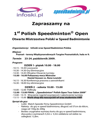 Zapraszamy na 1st Polish Speedminton® Open Otwarte Mistrzostwa Polski w Speed Badmintonie Organizatorzy: Infoski oraz Speed Badminton Polska Miejsce: Poznań - tereny Międzynarodowych Targów Poznańskich, hala nr 9. Termin: 23-24. październik 2009. Program: DZIEŃ 1- piątek 10.00 - 18.00 · 10.15 - 10.30 Losowanie · 10.30 - 14.30 Gry Eliminacyjne · 14.30 - 14.45 Oficjalne Otwarcie turnieju · 15.00 - 16.00 Pokazowy mecz Mistrzów Daniel Gossen vs. Rene Lewicki · 16.15 - 16.30 Konferencja prasowa z zawodnikami · 16.30 - 18.00 Gry eliminacyjne DZIEŃ 2 - sobota 10.00 - 15.00 · 10.00 - 12.00 Półfinały · 12.00 - 13.00 FINAŁ - „Speedminton® Polish Open Tour Salon 2009” · 13.00 - 13.15 Wręczenie nagród zwycięzcom i zakończenie turnieju · 13.15 - 15.00 Work-shop dla nauczycieli wf oraz studentów AWF Sprzęt do gry: - Lotki: Match Speeder firmy Speedminton GmbH - Rakiety: do gry w speed badmintona, długość od 57cm do 60cm, waga od 150g do 200g - Boisko: oryginalne wymiary kortu do gry w speed badmintona, dwa pola o wymiarach 5,5m x 5,5m oddalone od siebie na odległość 12,8m. Konkurencje: gry pojedyncze Kategorie: kobiety, mężczyźni ( podział, tylko gdy będzie min. 6 osób zgłoszonych w danej kategorii) System rozgrywek: na początku w grupach, a potem systemem KO Uczestnicy: zaprasza się wszystkich chętnych powyżej 12 roku życia Zgłoszenia: do 23.10.2009 godz 10.30 osobiście lub na [email protected]; [email protected] Nagrody: ZWYCIĘZCY OTRZYMAJĄ ATRAKCYJNE NAGRODY RZECZOWE ! (za 1, 2 i 3 miejsce) Uwagi: organizatorzy zastrzegają sobie prawo do zmian w programie.