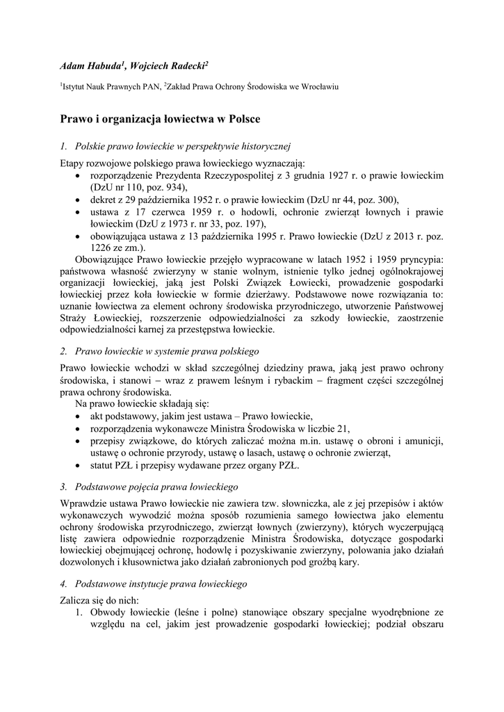 Adam Habuda1, Wojciech Radecki2 1 Istytut Nauk Prawnych PAN, 2Zakład Prawa Ochrony Środowiska we Wrocławiu Prawo i organizacja łowiectwa w Polsce 1. Polskie prawo łowieckie w perspektywie historycznej Etapy rozwojowe polskiego prawa łowieckiego wyznaczają: rozporządzenie Prezydenta Rzeczypospolitej z 3 grudnia 1927 r. o prawie łowieckim (DzU nr 110, poz. 934), dekret z 29 października 1952 r. o prawie łowieckim (DzU nr 44, poz. 300), ustawa z 17 czerwca 1959 r. o hodowli, ochronie zwierząt łownych i prawie łowieckim (DzU z 1973 r. nr 33, poz. 197), obowiązująca ustawa z 13 października 1995 r. Prawo łowieckie (DzU z 2013 r. poz. 1226 ze zm.). Obowiązujące Prawo łowieckie przejęło wypracowane w latach 1952 i 1959 pryncypia: państwowa własność zwierzyny w stanie wolnym, istnienie tylko jednej ogólnokrajowej organizacji łowieckiej, jaką jest Polski Związek Łowiecki, prowadzenie gospodarki łowieckiej przez koła łowieckie w formie dzierżawy. Podstawowe nowe rozwiązania to: uznanie łowiectwa za element ochrony środowiska przyrodniczego, utworzenie Państwowej Straży Łowieckiej, rozszerzenie odpowiedzialności za szkody łowieckie, zaostrzenie odpowiedzialności karnej za przestępstwa łowieckie. 2. Prawo łowieckie w systemie prawa polskiego Prawo łowieckie wchodzi w skład szczególnej dziedziny prawa, jaką jest prawo ochrony środowiska, i stanowi wraz z prawem leśnym i rybackim fragment części szczególnej prawa ochrony środowiska. Na prawo łowieckie składają się: akt podstawowy, jakim jest ustawa – Prawo łowieckie, rozporządzenia wykonawcze Ministra Środowiska w liczbie 21, przepisy związkowe, do których zaliczać można m.in. ustawę o obroni i amunicji, ustawę o ochronie przyrody, ustawę o lasach, ustawę o ochronie zwierząt, statut PZŁ i przepisy wydawane przez organy PZŁ. 3. Podstawowe pojęcia prawa łowieckiego Wprawdzie ustawa Prawo łowieckie nie zawiera tzw. słowniczka, ale z jej przepisów i aktów wykonawczych wywodzić można sposób rozumienia samego łowiectwa jako elementu ochrony środowiska przyrodniczego, zwierząt łownych (zwierzyny), których wyczerpującą listę zawiera odpowiednie rozporządzenie Ministra Środowiska, dotyczące gospodarki łowieckiej obejmującej ochronę, hodowlę i pozyskiwanie zwierzyny, polowania jako działań dozwolonych i kłusownictwa jako działań zabronionych pod groźbą kary. 4. Podstawowe instytucje prawa łowieckiego Zalicza się do nich: 1. Obwody łowieckie (leśne i polne) stanowiące obszary specjalne wyodrębnione ze względu na cel, jakim jest prowadzenie gospodarki łowieckiej; podział obszaru województw na obwody łowieckie nie jest zależny od stosunków własnościowych na nieruchomościach wchodzących w skład obwodów. 2. Planowanie łowieckie obejmujące roczne plany łowieckie i wieloletnie łowieckie plany hodowlane. 3. Wykonywanie polowania, uzależnione w zasadzie przynależnością do PZŁ (z wyjątkami co do cudzoziemców), posiadaniem stosownych uprawnień i dokumentów, uzyskaniem zgody (upoważnienia) dzierżawcy lub zarządcy obwodu łowieckiego. 5. Odpowiedzialność prawna w łowiectwie Odpowiedzialność taka występuje w postaci: 1) odpowiedzialności o charakterze cywilnym dzierżawcy lub zarządcy obwodu: a) za szkody wyrządzone w uprawach i płodach rolnych przez dziki, łosie, jelenie i sarny, b) za szkody wyrządzone przy wykonywaniu polowania; 2) odpowiedzialności karnej: a) za wykroczenia z art. 51 Prawa łowieckiego, b) za przestępstwa z art. 52 i 53 Prawa łowieckiego; 3) odpowiedzialności dyscyplinarnej członków PZŁ będących osobami fizycznymi za przewinienia dyscyplinarne (naruszenia ustawy i wydanych na jej podstawie aktów wykonawczych, naruszenia statutu lub innych uchwał organów PZŁ, wykonywanie polowania w sposób sprzeczny z etyką łowiecką) przed sądami łowieckimi; 4) odpowiedzialności porządkowej za naruszenie zasad selekcji osobniczej. 6. Organizacja łowiectwa W obszarze łowiectwa działają: Polski Związek Łowiecki i jego podstawowe jednostki organizacyjne w postaci kół łowieckich, które gospodarują w obwodach łowieckich na podstawie umów dzierżawy, państwowa administracja łowiecka, na której czele stoi minister właściwy do spraw środowiska, wykonywana w terenie przez samorząd województwa jako zadanie z zakresu administracji rządowej, ze znaczącym udziałem starostów oraz organów Państwowego Gospodarstwa Leśnego Lasy Państwowe, straż łowiecka kontrolująca przestrzeganie przepisów ustawy, złożona z dwóch komponentów: Państwowej Straży Łowieckiej jako umundurowanej, uzbrojonej i wyposażonej w środki transportu formacji o charakterze policyjnym podległej wojewodzie, upoważnionej do stosowania środków przymusu bezpośredniego, a w skrajnych sytuacjach także broni palnej, strażników łowieckich powoływanych lub zatrudnianych przez dzierżawców i zarządców obwodów łowieckich. Strażnikom Państwowej Straży Łowieckiej ustawodawca przyznał uprawnienia Państwowej Straży Rybackiej w zakresie kontroli legalności połowów oraz uprawnienia strażników leśnych w zakresie zwalczania szkodnictwa leśnego, przyznając odpowiednio strażnikom Państwowej Straży Rybackiej oraz strażnikom leśnym uprawnienia Państwowej Straży Łowieckiej w zakresie zwalczania kłusownictwa.