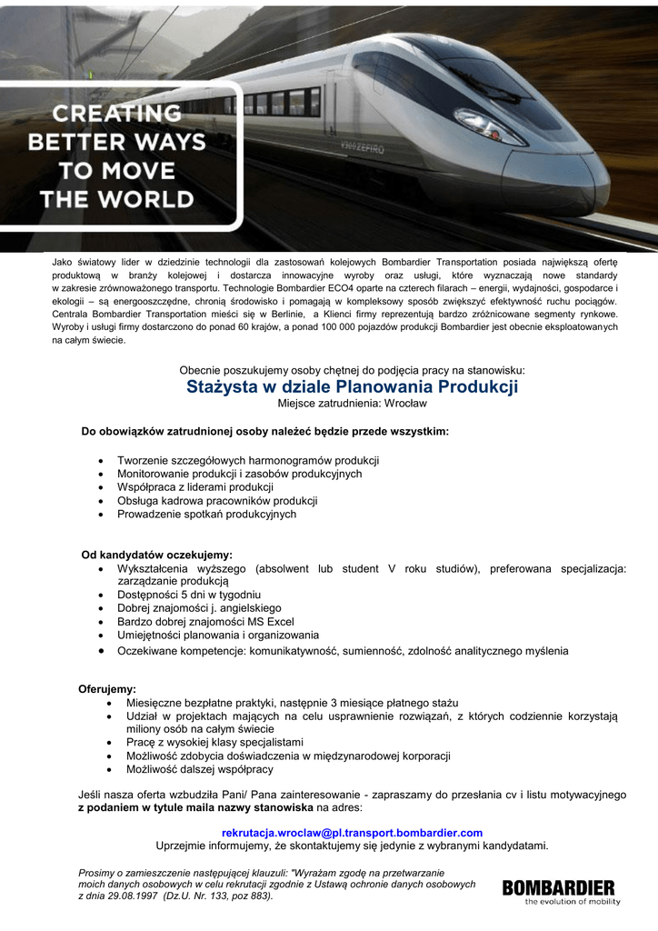 Jako światowy lider w dziedzinie technologii dla zastosowań kolejowych Bombardier Transportation posiada największą ofertę produktową w branży kolejowej i dostarcza innowacyjne wyroby oraz usługi, które wyznaczają nowe standardy w zakresie zrównoważonego transportu. Technologie Bombardier ECO4 oparte na czterech filarach – energii, wydajności, gospodarce i ekologii – są energooszczędne, chronią środowisko i pomagają w kompleksowy sposób zwiększyć efektywność ruchu pociągów. Centrala Bombardier Transportation mieści się w Berlinie, a Klienci firmy reprezentują bardzo zróżnicowane segmenty rynkowe. Wyroby i usługi firmy dostarczono do ponad 60 krajów, a ponad 100 000 pojazdów produkcji Bombardier jest obecnie eksploatowanych na całym świecie. Obecnie poszukujemy osoby chętnej do podjęcia pracy na stanowisku: Stażysta w dziale Planowania Produkcji Miejsce zatrudnienia: Wrocław Do obowiązków zatrudnionej osoby należeć będzie przede wszystkim: Tworzenie szczegółowych harmonogramów produkcji Monitorowanie produkcji i zasobów produkcyjnych Współpraca z liderami produkcji Obsługa kadrowa pracowników produkcji Prowadzenie spotkań produkcyjnych Od kandydatów oczekujemy: Wykształcenia wyższego (absolwent lub student V roku studiów), preferowana specjalizacja: zarządzanie produkcją Dostępności 5 dni w tygodniu Dobrej znajomości j. angielskiego Bardzo dobrej znajomości MS Excel Umiejętności planowania i organizowania Oczekiwane kompetencje: komunikatywność, sumienność, zdolność analitycznego myślenia Oferujemy: Miesięczne bezpłatne praktyki, następnie 3 miesiące płatnego stażu Udział w projektach mających na celu usprawnienie rozwiązań, z których codziennie korzystają miliony osób na całym świecie Pracę z wysokiej klasy specjalistami Możliwość zdobycia doświadczenia w międzynarodowej korporacji Możliwość dalszej współpracy Jeśli nasza oferta wzbudziła Pani/ Pana zainteresowanie - zapraszamy do przesłania cv i listu motywacyjnego z podaniem w tytule maila nazwy stanowiska na adres: [email protected] Uprzejmie informujemy, że skontaktujemy się jedynie z wybranymi kandydatami. Prosimy o zamieszczenie następującej klauzuli: "Wyrażam zgodę na przetwarzanie moich danych osobowych w celu rekrutacji zgodnie z Ustawą ochronie danych osobowych z dnia 29.08.1997 (Dz.U. Nr. 133, poz 883).