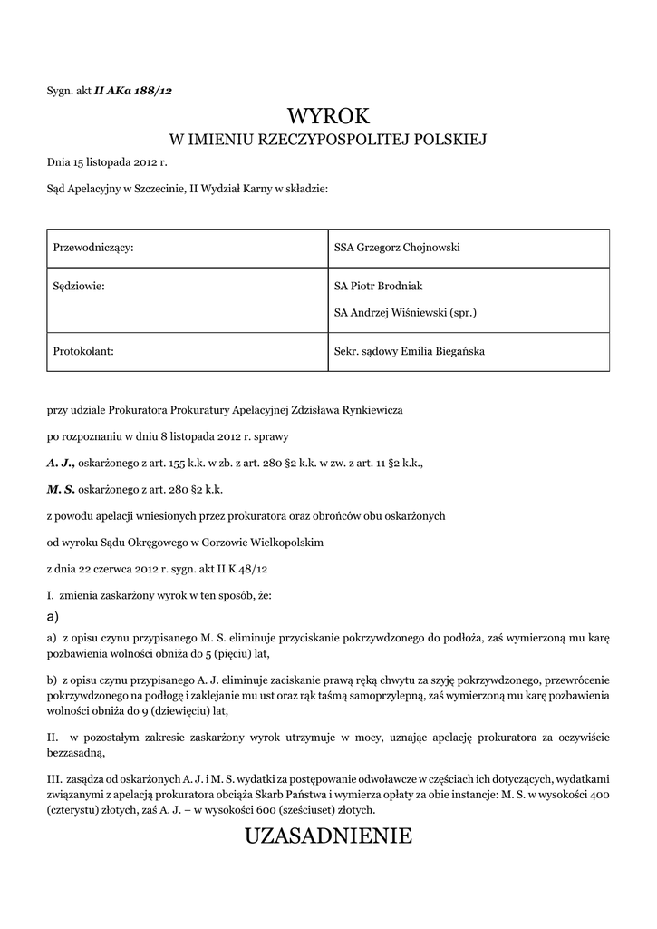 Sygn. akt II AKa 188/12 WYROK W IMIENIU RZECZYPOSPOLITEJ POLSKIEJ Dnia 15 listopada 2012 r. Sąd Apelacyjny w Szczecinie, II Wydział Karny w składzie: Przewodniczący: SSA Grzegorz Chojnowski Sędziowie: SA Piotr Brodniak SA Andrzej Wiśniewski (spr.) Protokolant: Sekr. sądowy Emilia Biegańska przy udziale Prokuratora Prokuratury Apelacyjnej Zdzisława Rynkiewicza po rozpoznaniu w dniu 8 listopada 2012 r. sprawy A. J., oskarżonego z art. 155 k.k. w zb. z art. 280 §2 k.k. w zw. z art. 11 §2 k.k., M. S. oskarżonego z art. 280 §2 k.k. z powodu apelacji wniesionych przez prokuratora oraz obrońców obu oskarżonych od wyroku Sądu Okręgowego w Gorzowie Wielkopolskim z dnia 22 czerwca 2012 r. sygn. akt II K 48/12 I. zmienia zaskarżony wyrok w ten sposób, że: a) a) z opisu czynu przypisanego M. S. eliminuje przyciskanie pokrzywdzonego do podłoża, zaś wymierzoną mu karę pozbawienia wolności obniża do 5 (pięciu) lat, b) z opisu czynu przypisanego A. J. eliminuje zaciskanie prawą ręką chwytu za szyję pokrzywdzonego, przewrócenie pokrzywdzonego na podłogę i zaklejanie mu ust oraz rąk taśmą samoprzylepną, zaś wymierzoną mu karę pozbawienia wolności obniża do 9 (dziewięciu) lat, II. w pozostałym zakresie zaskarżony wyrok utrzymuje w mocy, uznając apelację prokuratora za oczywiście bezzasadną, III. zasądza od oskarżonych A. J. i M. S. wydatki za postępowanie odwoławcze w częściach ich dotyczących, wydatkami związanymi z apelacją prokuratora obciąża Skarb Państwa i wymierza opłaty za obie instancje: M. S. w wysokości 400 (czterystu) złotych, zaś A. J. – w wysokości 600 (sześciuset) złotych. UZASADNIENIE Prokurator oskarżył A. J. i M. S. o to, że: I. w dniu 18 lutego 2009r. w miejscowości K. (...) gmina D. działając wspólnie i w porozumieniu z bezpośrednim zamiarem osiągnięcia korzyści majątkowej poprzez zabór samochodu marki P. i pieniędzy z dziennego utargu ze sklepu należącego do S. K. dokonali zaboru pieniędzy w kwocie nie mniejszej niż 5.000 PLN działając w sposób bezpośrednio zagrażający życiu S. K. i w tym zakresie wspólnie z P. S., a nadto z zamiarem ewentualnym pozbawienia życia S. K. i tak A. J. używając przemocy poprzez zastosowanie chwytu przedramieniem za szyję, a M. S. owijając pokrzywdzonemu twarz i krępując ręce z tyłu ciała taśmą samoprzylepną, a następnie wspólnie zadając uderzenia po całym ciele spowodowali obrażenia wewnętrzne u pokrzywdzonego w postaci ostrej niewydolności oddechowej z urazem krtani z dodatkowym upośledzeniem wentylacji płuc z powodu zaklejenia ust taśmą samoprzylepną, zadaniu uderzeń i ułożeniu go na plecach ze skrępowanymi rękoma, które to obrażenia spowodowały jego zgon, a także osiągnęli korzyść majątkową w kwocie co najmniej 2.500 PLN każdy z nich, tj. o czyn z art. 148 § 1 k.k. w zb. z art. 280 § 2 k.k. w zw. z art. 11 § 2 k.k. Sąd Okręgowy w Gorzowie Wielkopolskim wyrokiem z dnia 22 czerwca 2012r. uznał A. J. i M. S. za winnych tego, że w dniu 18 lutego 2009r. w miejscowości K. (...), gmina D. wspólnie i w porozumieniu, w celu dokonania uzgodnionej wcześniej z P. S. kradzieży samochodu marki P. i pieniędzy z dziennego utargu ze sklepu należącego do S. K., dokonali rozboju polegającego na tym, że A. J. i M. S., działając w sposób bezpośrednio zagrażający życiu S. K. polegający na tym, że A. J. po wejściu do sklepu chwycił pokrzywdzonego lewym przedramieniem za szyję, zaciskając chwyt swoją prawą ręką, następnie doprowadził do jego przewrócenia na posadzkę, po czym obaj oskarżeni wspólnie szarpiąc pokrzywdzonego i przyciskając go do podłoża a A. J. siedząc na nim obezwładnili go poprzez zaklejenie mu ust oraz skrępowanie rąk ułożonych z tyłu jego tułowia taśmą i pozostawili go w pozycji leżącej, co utrudniało mu oddychanie, dokonując zaboru pieniędzy w kwocie nie mniejszej niż 5000 zł, przy czym A. J. chwytając we wskazany powyżej sposób pokrzywdzonego lewym przedramieniem za szyję i zaciskając ten chwyt nieumyślnie doprowadził do uszkodzenia krtani, skutkującego ostrą niewydolnością oddechową, konsekwencją której była śmierć pokrzywdzonego i czyn ten zakwalifikował wobec oskarżonego A. J. jako zbrodnię z art. 280 §2 k.k. w zb. z art. 155 k.k. w zw. z art. 11 §2 k.k., a wobec oskarżonego M. S. jako zbrodnię z art. 280 §2 k.k. i za to na podstawie art. 280 §2 k.k. w zw. z art. 11 §3 k.k. wymierzył oskarżonemu A. J. karę 14 lat pozbawienia wolności, a na podstawie art. 280 §2 k.k. wymierzył oskarżonemu M. S. karę 6 lat pozbawienia wolności. Na podstawie art. 46 §1 k.k. Sąd orzekł wobec oskarżonego A. J. środki karne w postaci obowiązku naprawienia części szkody wyrządzonej przestępstwem poprzez zapłatę na rzecz K. K. (1), L. K. i J. S. (1) solidarnie kwoty 2533,33 zł i zadośćuczynienia poprzez zapłatę na rzecz L. K. kwoty 30.000 zł oraz na rzecz K. K. (1) i J. S. (1) kwot po 10.000 zł. Na podstawie art. 46 §1 k.k. Sąd orzekł wobec oskarżonego M. S. środek karny w postaci obowiązku naprawienia części szkody wyrządzonej przestępstwem poprzez zapłatę na rzecz K. K. (1), L. K. i J. S. (1) solidarnie kwoty 2533,33 zł. Na podstawie art. 63 §1 k.k. Sąd na poczet orzeczonych kar pozbawienia wolności zaliczył oskarżonemu A. J. okres rzeczywistego pozbawienia wolności od dnia 15 maja 2009r. do dnia 5 października 2009r. i od dnia 5 marca 2010r. do dnia 22 czerwca 2012r., a oskarżonemu M. S. okres rzeczywistego pozbawienia wolności od dnia 15 maja 2009r. do dnia 22 czerwca 2012r. Sąd rozstrzygnął również o kosztach sądowych. Wyrok zaskarżyli: prokurator, obaj obrońcy oskarżonego A. J. oraz obrońca oskarżonego M. S.. Obrońca oskarżonego A. J., adw. J. W. zaskarżył wyrok w całości. Wyrokowi zarzucił: 1) błąd w ustaleniach faktycznych przyjętych za podstawę orzeczenia a mający nań wpływ,