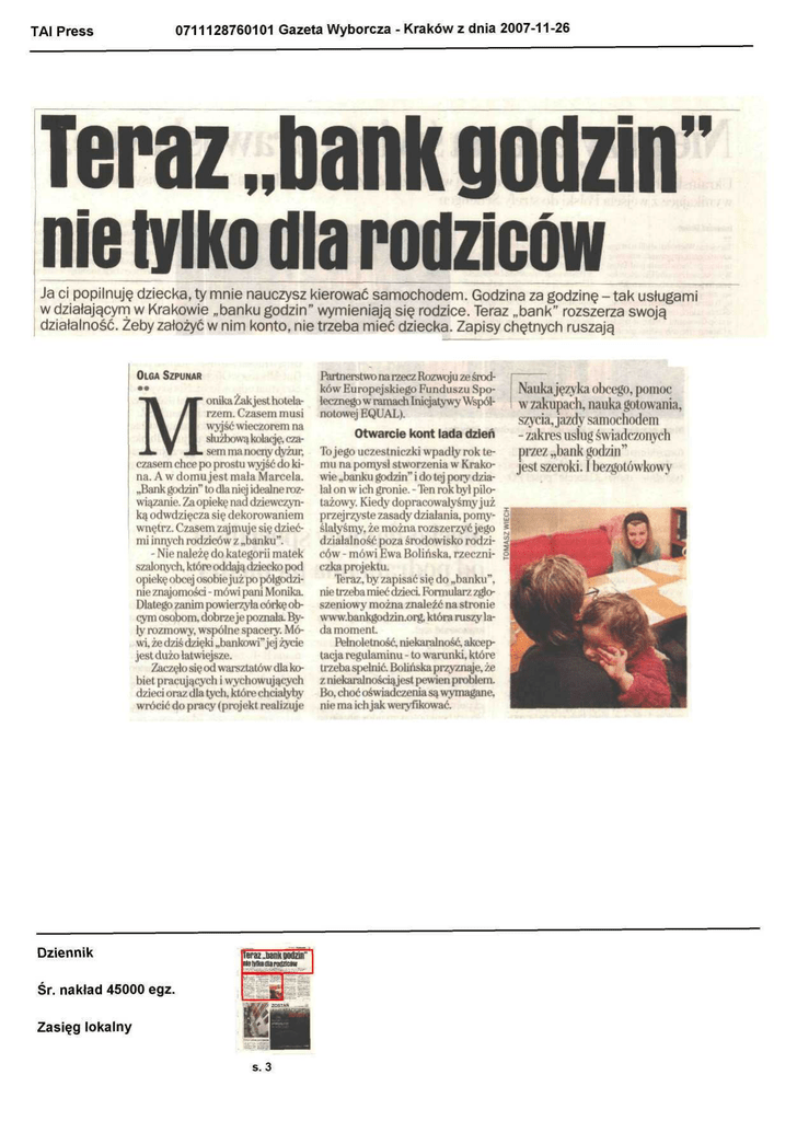 0711128760101 Gazeta Wyborcza - Kraków z dnia 2007-11 -26 TAI Press Teraz „bank godzin 99 nie tylko dla rodziców Ja ci popilnuję dziecka, ty mnie nauczysz kierować samochodem. Godzina za godzinę -tak usługami w działającym w Krakowie „banku godzin" wymieniają się rodzice. Teraz „bank" rozszerza swoją działalność. Żeby założyć w nim konto, nie trzeba mieć dziecka. Zapisy chętnych ruszają OLGA SZPUNAR *• onika Żakjest hotelarzem. Czasem musi wyjść wieczorem na służbową kolacje, czasem ma nocny dyżur, czasem chce po prostu wyjść do kina. A w domu jest mała Marcela. „Bank godzin" to dla niej idealne rozwiązanie. Za opiekę nad dziewczynką odwdzięcza się dekorowaniem wnętrz. Czasem zajmuje się dziećmi innych rodziców z „banku". - Nie należę do kategorii matek szalonych, które oddają dziecko pod opiekę obcej osobie już po półgodzinie znajomości - mówi pani Monika. Dlatego zanim powierzyła córkę obcym osobom, dobrzeje poznała Były rozmowy, wspólne spacery. Mówi, że dziś dzięki „bankowi" jej życie jest dużo łatwiejsze. Zaczęło się od warsztatów dla kobiet pracujących i wychowujących dzieci oraz dla tych, które chciafyby wrócić do pracy (projekt realizuje M Dziennik Śr. nakład 45000 egz. Zasięg lokalny s. 3 Partnerstwo na rzecz Rozwoju ze środków Europejskiego Funduszu Społecznego w ramach Inicjatywy Wspólnotowej EQUAL). Otwarcie kont lada dzień To jego uczestniczki wpadły rok temu na pomysł stworzenia w Krakowie „banku godzin" i do tej pory działał on w ich gronie. - Ten rok był pilotażowy. Kiedy dopracowałyśmy już przejrzyste zasady działania, pomyślałyśmy, że można rozszerzyć jego działalność poza środowisko rodziców - mówi Ewa Bolińska, rzeczniczka projektu. Teraz, by zapisać się do „banku", nie trzeba mieć dzieci. Formularz zgłoszeniowy można znaleźć na stronie www.bankgodzin.org, która ruszy lada moment. Pełnoletność, niekaralność, akceptacja regulaminu - to warunki, które trzeba spełnić. Bolińska przyznaje, że z niekaralnościąjest pewien problem. Bo, choć oświadczenia są wymagane, nie ma ich jak weryfikować. Nauka języka obcego, pomoc w zakupach, nauka gotowania, szycia, jazdy samochodem - zakres usług świadczonych przez „bank godzin" jest szeroki. I bezgotówkowy TAI Press 0711128760102 Gazeta Wyborcza - Kraków z dnia 2007-11 -26 - Dlatego sprawdzamy wszystkich bardzo dokładnie w inny sposób - zapewnia. - Chętny musi wypełnić formularz zgłoszeniowy, przyjść do nas na bardzo szczegółową rozmowę, pokazać dowód osobisty i wskazać dwie osoby, które mogą go zarekomendować - opowiada Anna Styszko, koordynatorka projektu. Zapewnia, że przez rok funkcjonowania projektu nikt się nie rozczarował. Naukajęzyka obcego, pomoc w zakupach, nauka gotowania, szycia, jazdy samochodem, pisanie listu motywacyjnego, podwożenie - zakres usług świadczonych przez „bank" jest szeroki. I bezgotówkowy. Zasadajest prosta. Jego uczestnicy wymieniają się między sobą usługami. Na przykład godzina nauki języka za godzinę kursu jazdy. Jeżeli udzielamy pomocyjednemu z członków „banku", to liczba godzin jest zapisywana na naszym osobistym koncie, powiększając jego stan. Natomiast każda liczba Dziennik Teraz ..bank godzin" metylko ma rodziców Śr. nakład 45000 egz. Zasięg lokalny s. 3 godzin przyjętej pomocy pomniejsza stan konta. Rodzice rodzicom w internecie Niezależnie od rozwoju „banku" koordynatorki projektu wpadły na pomysł stworzenia internetowego serwisu dla rodziców, w którym będzie można znaleźć wszelkie usługi ułatwiające godzenie życia rodzinnego z zawodowym. - Tu nie chodzi tylko o namiary na temat „świetlice, gdzie można zostawić dziecko", ale na przykład adresy ciekawych kursów dla najmłodszych. Chciałybyśmy, aby taką bazę stworzyli sami rodzice i liczymy na ich pomoc - mówi Styszko. Swoje propozycje można wpisywać do formularza, który dzisiaj powinien pojawić się na strome www.pracujacyrodzice.pl. Baza danych zostanie zweryfikowana i będzie dostępna pod tym adresem od stycznia przyszłego roku. O [email protected]