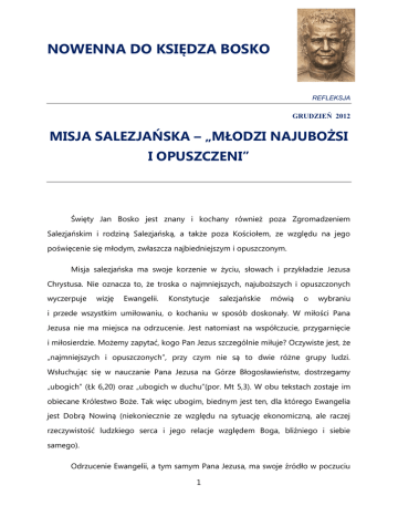 NOWENNA DO KSIĘDZA BOSKO REFLEKSJA GRUDZIEŃ 2012 MISJA SALEZJAŃSKA – „MŁODZI NAJUBOŻSI I OPUSZCZENI” Święty Jan Bosko jest znany i kochany również poza Zgromadzeniem Salezjańskim i rodziną Salezjańską, a także poza Kościołem, ze względu na jego poświęcenie się młodym, zwłaszcza najbiedniejszym i opuszczonym. Misja salezjańska ma swoje korzenie w życiu, słowach i przykładzie Jezusa Chrystusa. Nie oznacza to, że troska o najmniejszych, najuboższych i opuszczonych wyczerpuje wizję Ewangelii. Konstytucje salezjańskie mówią o wybraniu i przede wszystkim umiłowaniu, o kochaniu w sposób doskonały. W miłości Pana Jezusa nie ma miejsca na odrzucenie. Jest natomiast na współczucie, przygarnięcie i miłosierdzie. Możemy zapytać, kogo Pan Jezus szczególnie miłuje? Oczywiste jest, że „najmniejszych i opuszczonych”, przy czym nie są to dwie różne grupy ludzi. Wsłuchując się w nauczanie Pana Jezusa na Górze Błogosławieństw, dostrzegamy „ubogich” (Łk 6,20) oraz „ubogich w duchu”(por. Mt 5,3). W obu tekstach zostaje im obiecane Królestwo Boże. Tak więc ubogim, biednym jest ten, dla którego Ewangelia jest Dobrą Nowiną (niekoniecznie ze względu na sytuację ekonomiczną, ale raczej rzeczywistość ludzkiego serca i jego relacje względem Boga, bliźniego i siebie samego). Odrzucenie Ewangelii, a tym samym Pana Jezusa, ma swoje źródło w poczuciu 1 samowystarczalności, w postawie nacechowanej pychą, ufaniu własnej władzy i dobrom materialnym. W Magnificat - słowa Maryi głoszą, że ci, którzy odrzucili Boże zaproszenie: pyszniący się zamysłami serc swoich, władcy na tronach i bogacze zostali przez Boga rozproszeni, zrzuceni z tronów, odprawieni z niczym (por. Łk 1,51-53). Może współcześnie nowe, trudne sytuacje staną się przyczyną wołania o pomoc Bożą. Dobrze ukazuje to księga Przysłów (30, 8-9): „Kłamstwo i fałsz oddalaj ode mnie, nie dawaj mi bogactwa ni nędzy, żyw mnie chlebem niezbędnym, bym syty nie stał się niewiernym, nie rzekł: «A któż jest Pan?» lub z biedy nie począł kraść i imię mego Boga znieważać”. Człowiek, który wszystko posiada, może sobie zadawać pytanie: do czego jest mi potrzebny Pan Bóg, skoro niczego mi nie brakuje? Z drugiej strony biedak zaczyna niekiedy wątpić w miłość Bożą, jeśli nie ma wystarczających środków do życia. Co ma na myśli Ewangelia przywołując słowa Pana Jezusa o najmniejszych? Otóż mówi nam, że jeśli nie staniemy się jak dzieci, nie wejdziemy do królestwa niebieskiego. W Ewangelii według świętego Marka powiedziane jest jasno: „Zaprawdę, powiadam wam: kto nie przyjmie królestwa Bożego jak dziecko, ten nie wejdzie do niego».” (Mk 10,15). Kluczem jest słowo „przyjmować” (w języku greckim dexhtai). Ono prowadzi nas do pytania: w jaki sposób dziecko przyjmuje dar? Odpowiedź jest bardzo prosta: z radością i wdzięcznością, ponieważ nie „zasługuje” na to, co otrzymuje. Niestety, kiedy wkraczamy powoli w dorosłe życie, tracimy poczucie, że nic tak naprawdę nam się nie należy, pozbawiając się przy tym również radości oraz poczucia wdzięczności. Prostota w Nowym Testamencie nie jest niczym innym, jak „wiarą w miłość”. Ksiądz Bosko miał szczególne upodobanie i bezgraniczne współczucie wobec biednych, chorych, wyrzuconych na margines społeczeństwa, solidaryzując się z nimi całkowicie. Zawsze poszukiwał grzeszników, bo właśnie oni, będąc daleko od Pana Boga, potrzebują miłości i Jego przebaczenia. Oni też z radością i poczuciem wdzięczności przyjmują dary. Wobec otrzymywanego miłosierdzia i Bożego zbawienia ich radość jest podobna do radości dziecka. Podobną postawę możemy dostrzec u Zacheusza w Ewangelii wg św. Łukasza (19, 1-10). 2 Trud pracy salezjańskiej ma na celu zbawienie młodego człowieka i jego integralny rozwój, gdyż wiek dorastania niesie niebezpieczeństwo zagubienia samego siebie. Troska o integralny rozwój staje się trudniejsza w dobie przemian społecznych naznaczonych niesprawiedliwością, kultem władzy i pieniądza. Zło, z którym chcemy się zmierzyć, nie wypływa jednak ze struktur społecznych, politycznych lub ekonomicznych, ale z serca człowieka (por. Mk 7, 20). Dlatego tylko miłość jest w stanie przemienić w sposób radykalny relacje między ludźmi Wraz z Księdzem Bosko wychodzimy do młodzieży najuboższej (konst. 26). Poświęcamy się przede wszystkim ludziom młodym, których prawidłowy rozwój może być zagrożony poprzez ubóstwo ekonomiczne, społeczne i kulturalne. Ksiądz Bosko posyła swoich duchowych synów do tych, którzy zmagają się z ubóstwem uczuciowym, moralnym i duchowym, chroniąc ich przed obojętnością, utratą wiary i drogą przestępczą Nasz charyzmat ukazuje wyraźnie ubóstwo, do którego jesteśmy posłani, a jednocześnie wyjaśnia, dlaczego poświęcamy się młodym, żyjącym w trudnej sytuacji. W takim wieku bowiem podejmuje się zasadnicze decyzje życiowe, przygotowujące przyszłość własną, a także społeczeństwa i Kościoła. Należy zauważyć, że wybór Księdza Bosko służenia najuboższym nie wypływał tylko z wielkoduszności jego ojcowskiego serca lub z fatalnej sytuacji młodego człowieka w tamtych czasach czy też z rzeczywistości społeczno-politycznej. Była to przede wszystkim Boża misja zbawienia młodzieży: „Bóg wskazał Księdzu Bosko chłopców, szczególnie tych najuboższych, jako pierwszych i głównych odbiorców jego posłannictwa” (konst. 26). Trzeba tu przypomnieć, że stało się to „przy matczynym udziale Maryi” (konst. 1). Ona bowiem „wskazała Księdzu Bosko pole działania wśród młodzieży oraz nieustannie prowadziła go i wspierała, zwłaszcza przy zakładaniu naszego zgromadzenia” (konst. 8). Stojąc przed wyborem pracy z młodzieżą pochodzącą z dobrego środowiska i ułożonych rodzin, zdecydo