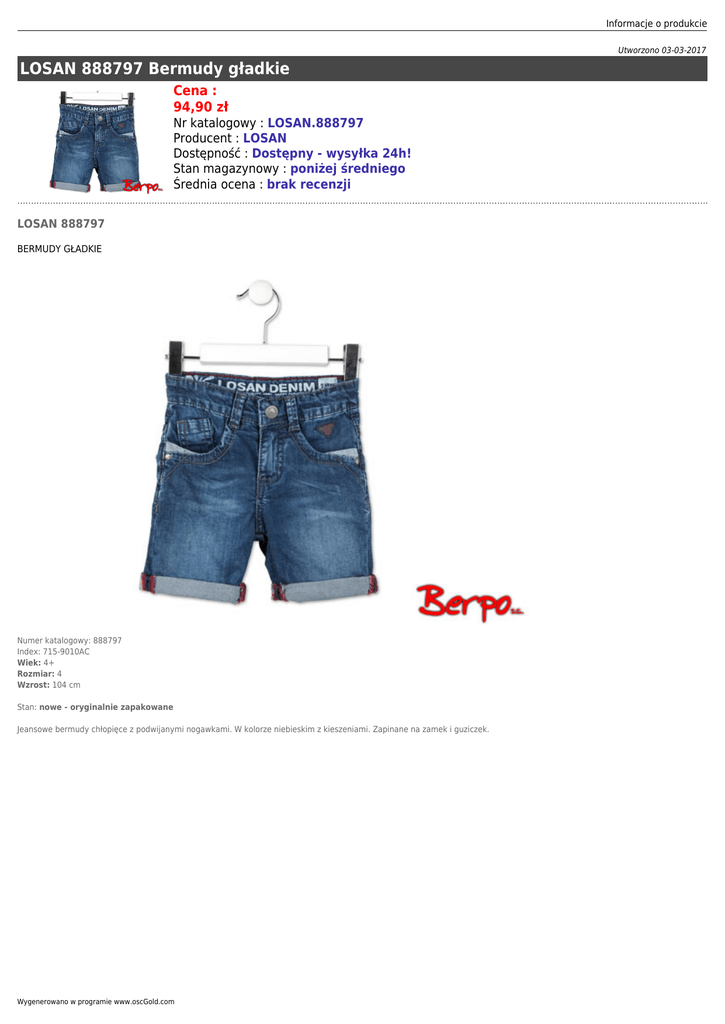 Informacje o produkcie Utworzono 03-03-2017 LOSAN 888797 Bermudy gładkie Cena : 94,90 zł Nr katalogowy : LOSAN.888797 Producent : LOSAN Dostępność : Dostępny - wysyłka 24h! Stan magazynowy : poniżej średniego Średnia ocena : brak recenzji LOSAN 888797 BERMUDY GŁADKIE Numer katalogowy: 888797 Index: 715-9010AC Wiek: 4+ Rozmiar: 4 Wzrost: 104 cm Stan: nowe - oryginalnie zapakowane Jeansowe bermudy chłopięce z podwijanymi nogawkami. W kolorze niebieskim z kieszeniami. Zapinane na zamek i guziczek. Wygenerowano w programie www.oscGold.com Informacje o produkcie Dostępność w salonach: Ilość: Sklep - Złotniki: 3 Sklep - zlikwidowany: 0 Sklep - Szczepankowo: 0 Dostępne opcje LOSAN 888797 Bermudy gładkie » Wiek: 3 - 4 lat. Wygenerowano w programie www.oscGold.com