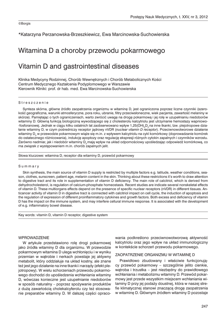 Postępy Nauk Medycznych, t. XXV, nr 3, 2012 ©Borgis *Katarzyna Perzanowska-Brzeszkiewicz, Ewa Marcinowska-Suchowierska Witamina D a choroby przewodu pokarmowego Vitamin D and gastrointestinal diseases Klinika Medycyny Rodzinnej, Chorób Wewnętrznych i Chorób Metabolicznych Kości Centrum Medycznego Kształcenia Podyplomowego w Warszawie Kierownik Kliniki: prof. dr hab. med. Ewa Marcinowska-Suchowierska Streszczenie Synteza skórna, główne źródło zaopatrzenia organizmu w witaminę D, jest ograniczona poprzez liczne czynniki (szerokość geograficzna, warunki atmosferyczne, pora roku, ubranie, filtry przeciwsłoneczne, wiek pacjenta, zawartość melaniny w skórze). Pamiętając o tych ograniczeniach, warto zwrócić uwagę na drogę pokarmową i jej rolę w uzupełnianiu niedoborów witaminy D. Główną funkcją biologiczną wywodzącego się z cholesterolu kalcytriolu jest utrzymanie hemostazy wapniowo-fosforanowej. Jednak w ciągu kilku ostatnich lat zaobserwowano wpływ 1,25(OH)2D3 na inne tkanki, tzw. plejotropowe działanie witaminy D, w czym pośredniczy receptor jądrowy nVDR (nuclear vitamin D receptor). Przeciwnowotworowe działanie witaminy D3 w przewodzie pokarmowym wiąże się m.in. z wpływem kalcytriolu na cykl komórkowy (doprowadzanie komórek do ostatecznego różnicowania), indukcję apoptozy oraz regulację ekspresji różnych cytokin zapalnych i czynników wzrostu. Zarówno nadmiar, jak i niedobór witaminy D3 mają wpływ na układ odpornościowy upośledzając odpowiedź komórkową, co ma związek z występowaniem m.in. chorób zapalnych jelit. Słowa kluczowe: witamina D, receptor dla witaminy D, przewód pokarmowy Summary Skin synthesis, the main source of vitamin D supply is restricted by multiple factors e.g. latitude, weather conditions, season, clothes, sunscreen, patient age, melanin content in the skin. Thinking about these restrictions it’s worth to draw attention to digestive tract and its role in supplementation of vitamin D deficiency. The main role of calcitriol, which is derived from dehydrocholesterol, is regulation of calcium-phosphate homeostasis. Recent studies are indicate several nonskeletal effects of vitamin D. These multiorgans effects depend on the presence of specific nuclear receptors (nVDR) in different tissues. Anticancer activity of vitamin D in digestive tract is connected with calcitriol impact on cell cycle, the induction of apoptosis and the regulation of expression of different proinflammatory cytokines and growth factors. Both excess and deficiency of vitamin D has the impact on the immune system, and may interfere cellural immune response. It is associated with the development of e.g. inflammatory bowel disease. Key words: vitamin D, vitamin D receptor, digestive system WPROWADZENIE W artykule przedstawiono rolę drogi pokarmowej jako źródła witaminy D dla organizmu. W przewodzie pokarmowym witamina D ulega wchłonięciu i w wyniku przemian w wątrobie i nerkach powstaje jej aktywny metabolit, który oddziałuje na układ kostny, ale znane też jest jego działanie na inne tkanki i narządy (efekt plejotropowy). W wielu schorzeniach przewodu pokarmowego dochodzi do upośledzenia wchłaniania witaminy D, wówczas konieczne jest uzupełnianie niedoborów w sposób naturalny – poprzez spożywanie produktów z dużą zawartością cholekalcyferolu czy też stosowanie preparatów witaminy D. W dalszej części opraco- wania podkreślono przeciwnowotworową aktywność kalcytriolu oraz jego wpływ na układ immunologiczny w kontekście schorzeń przewodu pokarmowego. ZAOPATRZENIE ORGANIZMU W WITAMINĘ D Prawidłowo zbudowany i właściwie funkcjonujący przewód pokarmowy – szczególnie jelito cienkie, wątroba i trzustka – jest niezbędny do prawidłowego wchłaniania i metabolizmu witaminy D. Przewód pokarmowy jest przede wszystkim miejscem wchłaniania witaminy D przy jej podaży doustnej, która w naszej strefie klimatycznej stanowi znaczącą drogę zaopatrzenia w witaminę D. Głównym źródłem witaminy D pozostaje 247 Katarzyna Perzanowska-Brzeszkiewicz, Ewa Marcinowska-Suchowierska synteza skórna, jednak powszechne dziś stosowanie kremów z filtrami przeciwsłonecznymi może zmniejszać wydajność syntezy skórnej pod wpływem promieniowania UBV nawet o 90% (1). Sposoby dostarczania witaminy D do organizmu to spożywanie produktów bogatych w witaminę D lub suplementacja z zastosowaniem preparatów cholekalcyferolu (2). Zawartość witaminy D w polskich produktach żywnościowych: Produkt Zawartość witaminy D Węgorz świeży 1200 IU/100 g Śledź marynowany 480 IU/100 g Śledź w oleju 808 IU/100 g Dorsz świeży 40 IU/100 g Gotowany/pieczony łosoś 540 IU/100 g Gotowana/pieczona makrela 152 IU/100 g Ryby z puszki (tuńczyk, sardynki) 200 IU/100 g Żółtko jajka 54 IU/żółtko Ser żółty Mleko krowie 7,6-28 IU/100 g 0,4-1,2 IU/100 ml Witamina D należy do witamin rozpuszczalnych w tłuszczach, dlatego ich jednoczesne spożywanie ułatwia jej wchłanianie i odwrotnie, u osób unikających tłuszczów w diecie lub stosujących leki utrudniające wchłanianie tłuszczów niedobory witaminy D będą częstsze. W wielu sytuacjach jednak jedynym pewnym źródłem zaopatrzenia organizmu w witaminę D pozostaje suplementacja drogą doustną. Dla osób dorosłych podaż witaminy D w żywności i/lub preparatach farmaceutycznych powinna wynosić 800-1000 IU/dobę w okresie od października do marca, a także w miesiącach letnich, jeżeli nie jest zapewniona wystarczająca synteza skórna witaminy D. Natomiast u osób po 65. roku życia, ze względu na obniżoną syntezę skórną oraz udowodnione działanie przeciwzłamaniowe i przeciwupadkowe witaminy D zaleca się suplementację witaminą D w dawce 800-1000 IU/dobę przez cały rok (3). W Polsce w profilaktyce i w leczeniu stosuje się głównie cholekalcyferol (witaminę D3), a np. w USA ergokalcyferol (witaminę D2). Dostępne są obecnie dwie pos