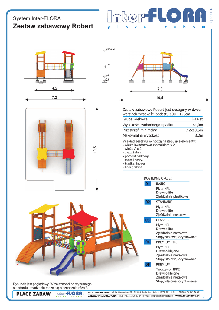 sp z o.o. System Inter-FLORA Zestaw zabawowy Robert Max.3,2 1,0 0,0 -0,6 4,2 7,0 7,2 10,5 Zestaw zabawowy Robert jest dostępny w dwóch wersjach wysokości podestu 100 - 125cm. Grupa wiekowa 3-14lat 10,5 Wysokość swobodnego upadku Przestrzeń minimalna Maksymalna wysokość ≤1,0m 7,2x10,5m 3,2m W skład zestawu wchodzą następujące elementy: - wieża kwadratowa z daszkiem x 2, - wieża A x 2, - zjeżdżalnia, - pomost belkowy, - most linowy, - kładka linowa, - koci grzbiet. DOSTĘPNE OPCJE: 01 BASIC Płyta HPL Drewno lite Zjeżdżalnia plastikowa 02 STANDARD Płyta HPL Drewno lite Zjeżdżalnia metalowa 03 CLASSIC Płyta HPL Drewno lite Zjeżdżalnia metalowa Stopy stalowe, ocynkowane 04 PREMIUM HPL Płyta HPL Drewno klejone Zjeżdżalnia metalowa Stopy stalowe, ocynkowane 05 PREMIUM Tworzywo HDPE Drewno klejone Zjeżdżalnia metalowa Stopy stalowe, ocynkowane PLACE ZABAW sp z o.o. Rysunek jest poglądowy. W zależności od wybranego standardu urządzenie może się nieznacznie różnić. BIURO HANDLOWE: ul. W. Grabskiego 22 55-011 Siechnice tel.: +48/71 364 42 34 +48/fax: 71 364 42 29 ZAKŁAD PRODUKCYJNY: tel.: +48/71 364 42 34 e-mail: [email protected] www.inter-flora.pl
