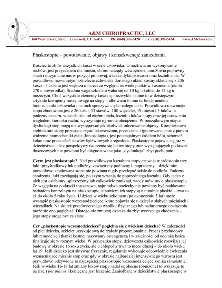 A&M CHIROPRACTIC, LLC 160 West Street, Ste C Cromwell, CT 06416 Ph: (860) 398-5420 Fx: (860) 398-5424 www.AMchiro.com Płaskostopie – powstawanie, objawy i konsekwencje zaniedbania Kościec to zbiór wszystkich kości w ciele człowieka. Umożliwia on wykonywanie ruchów, jest przyczepem dla mięśni, chroni narządy wewnętrzne, umożliwia poprawny słuch i utrzymanie nas w pozycji pionowej, a także dyktuje wzrost oraz kształt ciała. W prawidłowo rozwiniętym szkielecie człowieka dorosłego układ kostny składa się z 206 kości – liczba ta jest większa u dzieci ze względu na wiele punktów kostnienia (około 270 u noworodka). Średnia waga szkieletu waha się od 10 kg u kobiet do 12 kg u mężczyzn. Choć wszystkie elementy kośca są niezwykle istotne to w dzisiejszym artykule kierujemy naszą uwagę na stopy – albowiem to one są fundamentem biomechaniki człowieka i na nich spoczywa ciężar całego ciała. Prawidłowo rozwinięta stopa zbudowana jest z 26 kości, 33 stawów, 100 więzadeł, 19 mięśni i 3 łuków, a podczas spaceru, w zależności od ciężaru ciała, kształtu łuków stopy oraz jej ustawienia względem kierunku ruchu, wytrzymuje ogromne obciążenie. W początkowym etapie dysfunkcji stóp mogą nie występować jakiekolwiek odczuwalne objawy. Kompleksowa architektura stopy pozostaje często lekceważona, przeaczana i ignorowana choć z punktu widzenia biomechaniki ciała (kinesjologia), jest potencjalnym źródłem bólu, schorzeń kolan oraz przeciążeń stawów lędźwiowych kręgosłupa. Płaskostopie pojawia się już w dzieciństwie, ale z perspektywy tworzenia się łuków stopy oraz występujących poduszek tłuszczowych nie powinno być diagnozowane jako „dysfunkcja” zbyt pochopnie. Czym jest płaskostopie? Nad prawidłowym kształtem stopy czuwają w śródstopiu trzy łuki: przyśrodkowy łuk podłużny, zewnętrzny podłużny i poprzeczny – dzięki nim prawidłowo zbudowana stopa nie powinna nigdy przylegać ściśle do podłoża. Podczas chodzenia, łuki rozciągają się, po czym wracają do poprzedniego kształtu. Gdy jeden z nich jest osłabiony, spłaszczony lub całkowicie zaniknął, wtedy mówimy o płaskostopiu. Ze względu na poduszki tłuszczowe, najmłodsze pociechy nie powinny być poddawane badaniom kontrolnym na płaskostopie, albowiem ich stopy są naturalnie płaskie – trwa to aż do około 5 roku życia. U dzieci w wieku szkolnym (po ukończeniu 5 lat) może wystąpić płaskostopie wczesnodziecięce, które pojawia się u dzieci o słabych mięśniach i więzadłach. Na skutek przedwczesnego wysiłku fizycznego lub nadmiernego obciążenia może się ono pogłębiać. Dlatego nie zmuszaj dziecka do zbyt wczesnego chodzenia – jego stopy mogą być za słabe. Czy „płaskostopie wczesnodziecięce” pogłębia się z wiekiem dziecka? W zależności od płci dziecka, szkielet uzyskuje swą dojrzałość proporcjonalnie. Proces przebudowy lub remodelacji tkanki kostnej nazywamy osteogenezą i w zależności od odcinka kośca finalizuje się w różnym wieku. W przypadku stopy, dziewczęta całkowicie rozwijają jej budowę w okresie 16 roku życia, ale u chłopców trwa to nieco dłużej – do około wieku lat 19. Jeśli dziecko jest aktywne fizycznie, regularnie wykonuje odpowiednie ćwiczenia wzmacniające mięśnie stóp oraz gdy w okresie najbardziej intensywnego wzrostu jest prawidłowo odżywione to najczęściej płaskostopie wczesnodziecięce zanika samoistnie. Jeśli w wieku 16-19 lat zmiany łuków stopy nadal są obecne (obniżone) to wskazuje to na (łac.) pes planus i konieczne jest leczenie. Zaniedbane w dzieciństwie płaskostopie w późniejszym okresie życia często powoduje długą listę problemów: począwszy od bólu i dyskomfortu chodzenia, poprzez tworzenie sie „koślawych paluchów”, a kończąc na dolegliwościach stóp, stawów skokowych, kolanowych, biodrowych oraz kręgosłupa. Najskuteczniejszą metodą utrzymania prawidłowego profilu stopy są systematycznie i prawidłowo wykonywane ćwiczenia: powolne chwytanie i podnoszenie z podłogi ręcznika lub szmatki, zwijanie i prostowanie stopy w pojemniku z ryżem, rysowanie w powietrzu wszystkich liter alfabetu, chodzenie z podwiniętymi palcami na zewnętrznych krawędziach stóp. Ponad to dzieci powinny chodzić boso – doskonale pobudza to propiocepsję czyli zmysł orientacji i ułożenia ciała, albowiem właśnie wtedy aktywowane są receptory odbierające bodźce związane z uciskiem, rozciągnięciem, ustawieniem i ruchem ciała. Największe zagęszczenie tych receptorów występuje na opuszkach palcy rąk, powierzchni języka, gałki oka i na stopach. Doskonałym dodatkiem do ćwiczeń są wkładki ortopedyczne, które podczas chodzenia w wygodnym obuwiu podtrzymują łuki stopy. W zależności od indywidualnej potrzeby pacjenta oraz po dokładnej analizie wszystkich trzech łuków obu stóp, wkładki powinny być dobrane bardzo starannie. Istotnym jest podkreślenie iż wkładki tzw „żelowe” (np Dr. Scholls) preferują zdradliwy komfort a nigdy wsparcie opuszczonych łuków stóp. Po więcej informacji i bezpłatną konsultację prosimy o kontakt z A&M Chiropractic, LLC. Lekarze i personel gabinetu płynnie mówi po polsku