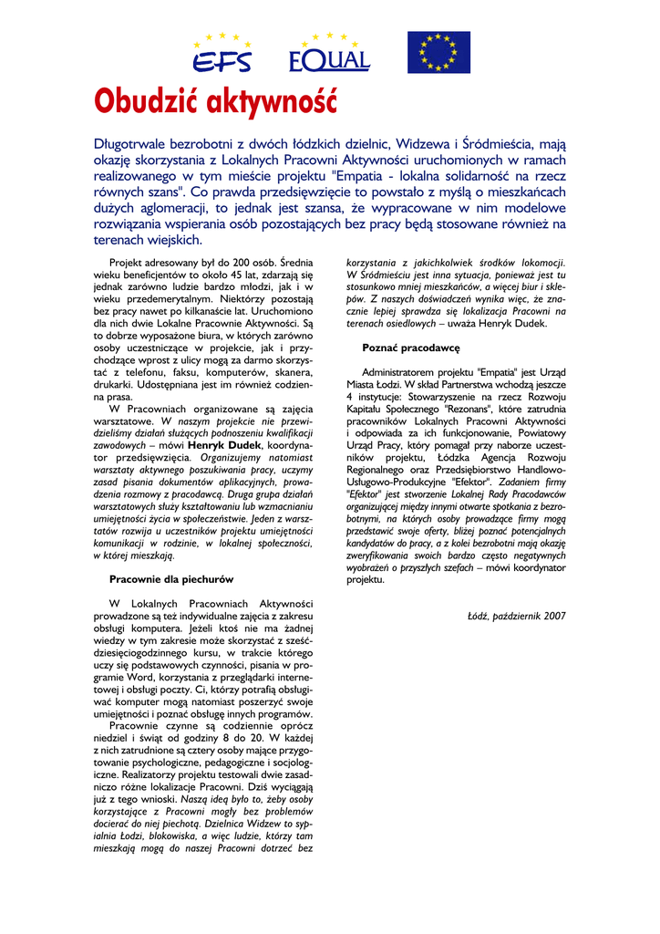 Obudzić aktywność Długotrwale bezrobotni z dwóch łódzkich dzielnic, Widzewa i Śródmieścia, mają okazję skorzystania z Lokalnych Pracowni Aktywności uruchomionych w ramach realizowanego w tym mieście projektu "Empatia - lokalna solidarność na rzecz równych szans". Co prawda przedsięwzięcie to powstało z myślą o mieszkańcach dużych aglomeracji, to jednak jest szansa, że wypracowane w nim modelowe rozwiązania wspierania osób pozostających bez pracy będą stosowane również na terenach wiejskich. Projekt adresowany był do 200 osób. Średnia wieku beneficjentów to około 45 lat, zdarzają się jednak zarówno ludzie bardzo młodzi, jak i w wieku przedemerytalnym. Niektórzy pozostają bez pracy nawet po kilkanaście lat. Uruchomiono dla nich dwie Lokalne Pracownie Aktywności. Są to dobrze wyposażone biura, w których zarówno osoby uczestniczące w projekcie, jak i przychodzące wprost z ulicy mogą za darmo skorzystać z telefonu, faksu, komputerów, skanera, drukarki. Udostępniana jest im również codzienna prasa. W Pracowniach organizowane są zajęcia warsztatowe. W naszym projekcie nie przewidzieliśmy działań służących podnoszeniu kwalifikacji zawodowych – mówi Henryk Dudek, koordynator przedsięwzięcia. Organizujemy natomiast warsztaty aktywnego poszukiwania pracy, uczymy zasad pisania dokumentów aplikacyjnych, prowadzenia rozmowy z pracodawcą. Druga grupa działań warsztatowych służy kształtowaniu lub wzmacnianiu umiejętności życia w społeczeństwie. Jeden z warsztatów rozwija u uczestników projektu umiejętności komunikacji w rodzinie, w lokalnej społeczności, w której mieszkają. Pracownie dla piechurów W Lokalnych Pracowniach Aktywności prowadzone są też indywidualne zajęcia z zakresu obsługi komputera. Jeżeli ktoś nie ma żadnej wiedzy w tym zakresie może skorzystać z sześćdziesięciogodzinnego kursu, w trakcie którego uczy się podstawowych czynności, pisania w programie Word, korzystania z przeglądarki internetowej i obsługi poczty. Ci, którzy potrafią obsługiwać komputer mogą natomiast poszerzyć swoje umiejętności i poznać obsługę innych programów. Pracownie czynne są codziennie oprócz niedziel i świąt od godziny 8 do 20. W każdej z nich zatrudnione są cztery osoby mające przygotowanie psychologiczne, pedagogiczne i socjologiczne. Realizatorzy projektu testowali dwie zasadniczo różne lokalizacje Pracowni. Dziś wyciągają już z tego wnioski. Naszą ideą było to, żeby osoby korzystające z Pracowni mogły bez problemów docierać do niej piechotą. Dzielnica Widzew to sypialnia Łodzi, blokowiska, a więc ludzie, którzy tam mieszkają mogą do naszej Pracowni dotrzeć bez korzystania z jakichkolwiek środków lokomocji. W Śródmieściu jest inna sytuacja, ponieważ jest tu stosunkowo mniej mieszkańców, a więcej biur i sklepów. Z naszych doświadczeń wynika więc, że znacznie lepiej sprawdza się lokalizacja Pracowni na terenach osiedlowych – uważa Henryk Dudek. Poznać pracodawcę Administratorem projektu "Empatia" jest Urząd Miasta Łodzi. W skład Partnerstwa wchodzą jeszcze 4 instytucje: Stowarzyszenie na rzecz Rozwoju Kapitału Społecznego "Rezonans", które zatrudnia pracowników Lokalnych Pracowni Aktywności i odpowiada za ich funkcjonowanie, Powiatowy Urząd Pracy, który pomagał przy naborze uczestników projektu, Łódzka Agencja Rozwoju Regionalnego oraz Przedsiębiorstwo HandlowoUsługowo-Produkcyjne "Efektor". Zadaniem firmy "Efektor" jest stworzenie Lokalnej Rady Pracodawców organizującej między innymi otwarte spotkania z bezrobotnymi, na których osoby prowadzące firmy mogą przedstawić swoje oferty, bliżej poznać potencjalnych kandydatów do pracy, a z kolei bezrobotni mają okazję zweryfikowania swoich bardzo często negatywnych wyobrażeń o przyszłych szefach – mówi koordynator projektu. Łódź, październik 2007