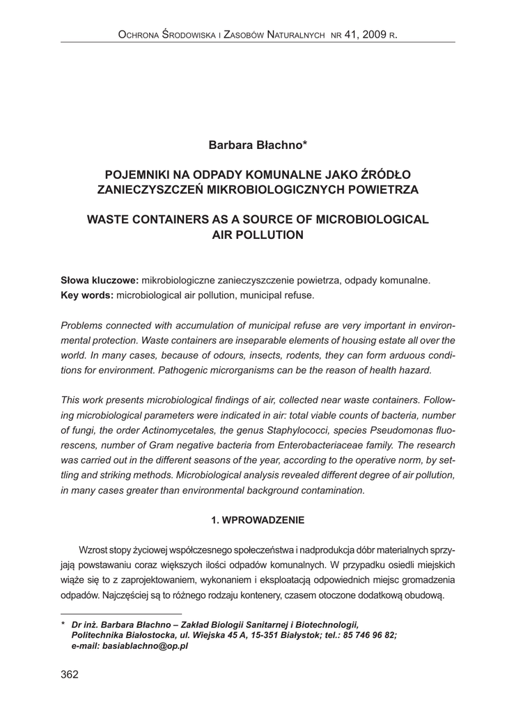 Ochrona Środowiska i Zasobów Naturalnych nr 41, 2009 r. Barbara Błachno* POJEMNIKI NA ODPADY KOMUNALNE JAKO ŹRÓDŁO ZANIECZYSZCZEŃ MIKROBIOLOGICZNYCH POWIETRZA WASTE CONTAINERS AS A SOURCE OF MICROBIOLOGICAL AIR POLLUTION Słowa kluczowe: mikrobiologiczne zanieczyszczenie powietrza, odpady komunalne. Key words: microbiological air pollution, municipal refuse. Problems connected with accumulation of municipal refuse are very important in environmental protection. Waste containers are inseparable elements of housing estate all over the world. In many cases, because of odours, insects, rodents, they can form arduous conditions for environment. Pathogenic microrganisms can be the reason of health hazard. This work presents microbiological findings of air, collected near waste containers. Following microbiological parameters were indicated in air: total viable counts of bacteria, number of fungi, the order Actinomycetales, the genus Staphylococci, species Pseudomonas fluorescens, number of Gram negative bacteria from Enterobacteriaceae family. The research was carried out in the different seasons of the year, according to the operative norm, by settling and striking methods. Microbiological analysis revealed different degree of air pollution, in many cases greater than environmental background contamination. 1. WPROWADZENIE Wzrost stopy życiowej współczesnego społeczeństwa i nadprodukcja dóbr materialnych sprzyjają powstawaniu coraz większych ilości odpadów komunalnych. W przypadku osiedli miejskich wiąże się to z zaprojektowaniem, wykonaniem i eksploatacją odpowiednich miejsc gromadzenia odpadów. Najczęściej są to różnego rodzaju kontenery, czasem otoczone dodatkową obudową. * Dr inż. Barbara Błachno – Zakład Biologii Sanitarnej i Biotechnologii, Politechnika Białostocka, ul. Wiejska 45 A, 15-351 Białystok; tel.: 85 746 96 82; e-mail: [email protected] 362 Pojemniki na odpady komunalne jako źródło zanieczyszczeń mikrobiologicznych powietrza Wprawdzie gromadzenie odpadów w miejscu ich powstawania jest etapem krótkotrwałym i przejściowym, to jednak może być uciążliwe dla mieszkańców osiedli miejskich a niejednokrotnie może też stanowić zagrożenie sanitarne. Uciążliwości są spowodowane zwykle powstawaniem nieprzyjemnych zapachów a zagrożenia sanitarne wynikają z niewłaściwego stanu higienicznego pojemników, powodującego rozwój mikroorganizmów, pojawienie się insektów i gryzoni. Pomimo, że powietrze nie jest środowiskiem sprzyjającym rozwojowi drobnoustrojów, to jednak mogą one utrzymywać się w tych warunkach przez pewien czas, tym dłuższy, im jest większa ich odporność na wysychanie i brak substancji odżywczych. Przenoszone z wiatrem na znaczne odległości mogą być przyczyną licznych zakażeń aerogennych. Celem pracy była ocena stopnia mikrobiologicznego zanieczyszczenia powietrza w pobliżu wybranych pojemników na odpady komunalne na terenie Białegostoku. 2. TEREN BADAŃ I METODYKA BADAŃ Mikrobiologiczne badania powietrza atmosferycznego wykonywano w okresie od października do maja, przy zróżnicowanych warunkach meteorologicznych, w pobliżu dwudziestu czterech pojemników na odpady usytuowanych na terenie osiedli mieszkaniowych Białegostoku. Badania prowadzono metodą sedymentacyjną zgodnie z normą PN-89/Z-04111/01,02,03. Dziewięciokrotnie, oprócz metody sedymentacyjnej, zastosowano metodę zderzeniową przy użyciu próbnika powietrza Mass-100 Eco firmy Merck. Próby powietrza pobierano wzdłuż osi wiatru (w tzw. smudze). Przy każdym pojemniku wyznaczano cztery punkty pomiarowe: ● 0 (tło) – punkt usytuowany po stronie nawietrznej, w odległości ok.10 m od pojemnika, ● 1 – punkt po stronie zawietrznej, w bezpośrednim sąsiedztwie pojemnika (w odległości ok. 1 m), ● 2 – punkt po stronie zawietrznej, w odległości ok. 10 m, ● 3 – punkt położony w odległości ok. 30 m od pojemnika. Jednocześnie z badaniami mikrobiologicznymi oznaczano aktualne wartości wybranych parametrów meteorologicznych: ● kierunek i prędkość wiatru, ● temperaturę i wilgotność powietrza, ● ciśnienie atmosferyczne oraz ● nasłonecznienie. Analizy mikrobiologiczne obejmowały: ● ogólną liczbę bakterii psychrofilnych i mezofilnych na agarze odżywczym, ● liczbę grzybów na podłożu Sabourauda, ● liczbę gronkowców na podłożu Chapmana, 363 Barbara Błachno ● liczbę promieniowców na podłożu Pochona, ● liczbę Pseudomonas fluorescens na podłożu Kinga B, ● liczbę pałeczek Gram-ujemnych z rodziny Enterobacteriaceae na podłożu Mac Conkeya. 3. WYNIKI BADAŃ I DYSKUSJA W tabeli 1 przedstawiono zakresy zmienności oraz średnie wartości badanych parametrów mikrobiologicznych w pobliżu dwudziestu czterech pojemników na odpady, w wyznaczonych czterech punktach pomiarowych. Oceny stanu mikrobiologicznego powietrza dokonano według kryteriów zamieszczonych w normach PN-89/Z-04111/02 i PN-89/Z-04-111/03 z uwzględnieniem aktualizacji proponowanych przez Instytut Systemów Inżynierii Środowiska Politechniki Warszawskiej. Tabela 1.Zakresy zmienności i średnie wielkości badanych parametrów mikrobiologicznych Table 1. The variability levels and average values of microbiological parameters Drobnoustroje Bakterie psychrofilne Bakterie mezofilne Grzyby Promieniowce Pseudomonas fluorescens Gronkowce Pałeczki Gramujemne 0 318 – 1465 703 111 – 1306 754 425 – 2654 1274 0 – 149 88 0 – 276 <106 0 – 84 22 0 – 26 <4 Liczebność drobnoustrojów na stanowisku 1 2 382 – 2230 573 – 2548 890 1287 159 – 1879 191 – 2739 920 1113 510 – 3376 531 – 3631 1468 1561 32 – 382 30 – 318 173 146 0 – 382 21 – 340 <217 201 0 – 318 0 – 420 <81 <132 0 – 79 0 – 79 <27 <30 3 382 – 2038 900 96 – 2771 1004 318 – 3439 1296 16 – 255 118 0 – 361 <135 0 – 255 <77 0 – 52 <15 W otoczeniu dwudziestu trzech pojemników, w żadnym z punktów pomiarowyc