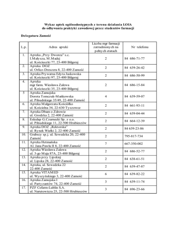 Wykaz aptek ogólnodostępnych z terenu działania LOIA do odbywania praktyki zawodowej przez studentów farmacji Delegatura Zamość L.p. Adres apteki 1. Apteka „Przy Dworcu” s.c. I.M ałysza, M .M adej ul. Kościuszki 77, 23-400 Biłgoraj Apteka DOZ ul. Orlicz-Dreszera 8, 22-400 Zamość Apteka Prywatna Edyta Jaskowska ul. Kościuszki 97, 23-400 Biłgoraj Apteka mgr farm. Wiesława Zalewa ul. Kościuszki 35, 23-400 Biłgoraj Apteka Zamojska Dorota Tomczuk-M ańkowska ul. Piłsudskiego 35/49, 22-400 Zamość Apteka M ałgorzata Kościółko ul. Kościelna 34, 22-630 Tyszowce Apteka Dbam o Zdrowie ul. Grodzka 2, 22-400 Zamość Eskulap G.Czarnecki Sp. z o.o. ul. Piłsudskiego 11, 22-500 Hrubieszów Apteka DOZ „Rektorska” ul. Rynek Wielki 2, 22-400 Zamość Grabscy sp.j. ul. Szwedzka 20, 22-400 Zamość Apteka Hetmańska Al. Jana Pawła II 8, 22-400 Zamość Apteka Wiesława Zalewa ul. 3-go M aja 87A, 23-400 Biłgoraj Apteka przy Lipskiej ul. Lipska 28, 22-400 Zamość Apteka, ul. Szwedzka 22 22-400 Zamość Apteka VITAM ED ul. Wyszyńskiego 3, 22-400 Zamość Apteka Zamojska I ul. Partyzantów 74, 22-400 Zamość PZF Cefarm-Lublin S.A. ul. Narutowicza 25, 22-500 Hrubieszów 2. 3. 4. 5 6. 7. 8. 9. 10. 11. 12. 13. 14. 15. 16. 17. Liczba mgr farmacji zatrudnionych na pełnych etatach Nr telefonu 2 84 686-71-77 2 84 639-26-42 2 84 686-50-99 2 84 686-15-84 4 84 639-59-07 2 84 661-93-11 2 84 639-04-44 2 84 664-12-39 2 84 639-23-86 2 795-817-734 7 667-350-002 2 84 686-52-77 2 84 638-61-51 2 84 639-47-87 6 84 639-82-22 3 84 639-11-74 3 84 696-23-66