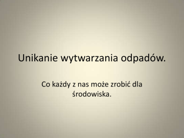 Unikanie wytwarzania odpadów. Co każdy z nas może zrobić dla środowiska. Większość nas nie zastanawia się, jaki los spotyka zwykłą „reklamówkę” po wyrzuceniu jej do kosza… Wtedy uważamy że nie jest to już nasz problem. Lecz tak naprawdę problem dopiero się zaczyna. Z dnia na dzień góra różnorakich odpadów rośnie. Znaczną część tych odpadów możemy wyeliminować, przyjmując postawę przyjazną środowisku, czyli próbując prowadzić tzw. ekologiczny tryb życia Sposoby zmniejszania ilości odpadów 1. Segregacja odpadów Segregacja odpadów polega na oddzieleniu surowców wtórnych od tych, które nie nadają się do recyklingu, czyli powtórnego wykorzystania. Segregujemy papier, metale, szkło i plastik. Przeznaczone są do tego specjalne kontenery, które możemy spotkać na naszych osiedlach. Występują w następujących kolorach: Kontener niebieski Przeznaczony jest papieru, wrzucamy niego: -gazety -listy -papier notatkowy -zeszyty -torebki papierowe -karton -pudełka tekturowe. do do Kontener zielony Przeznaczony jest do szkła wrzucany do niego: -butelki -słoiki bez nakrętek Kontener czerwony Przeznaczony jest do metali, wrzucamy do niego: -kapsle -metalowe nakrętki -puszki po konserwach -puszki po napojach -folje metalowe -stare naczynia kuchenne -armatury -rury -taśmy stalowe. Kontener żółty Przeznaczony jest do plastiku, wrzucamy do niego: -puste butelki typu PET -torebki po zakupach -folie z tworzywa -folie budowlane -pojemniki z tworzywa sztucznego -folie opakowaniowe. Papier Wyrzucając papier, przyczyniamy się do niszczenia lasów tropikalnych Zagrażamy równowadze życiowej ziemi Wielkie połacie lasów zostały wycięte tylko po to, aby zaspokoić nasze zapotrzebowanie na papier. Zamiast wyrzucać papier po jednorazowym użyciu, możemy wykorzystać go jako surowiec wtórny. Oto przykłady naszych działań, które zapobiegają wytwarzaniu ogromnej ilości śmieci w postaci makulatury: -wszystkie kartki zanim wyrzucisz, zapisz po obu stronach -zużyty papier wkładaj do niebieskiego pojemnika -dużą ilość makulatury możesz odnieść do punktu jej skupu -kupuj papier do notatek oraz papier toaletowy wykonany z makulatury -używaj chusteczek bawełnianych, a nie jednorazowych -do wycierania naczyń używaj materiałowych ścierek , zamiast papierowych ręczników -czytaj gazety przeczytane już przez kogoś innego -korzystaj ze zbiorów biblioteki -poproś pocztę o wstrzymanie reklamy do twojej skrzynki. Aluminium i inne metale. Głównymi przedmiotami wykonanymi z metali, z którymi mamy do czynienia na co dzień są puszki, spinacze, gwoździe, śrubki itp. Te wszystkie przedmioty możemy wykorzystać jako surowce wtórne. Oto kilka pomysłów na zmniejszenie metalowych odpadów: Metalowe odpady -wszystkie metalowe części i przedmioty wrzucaj do czerwonego pojemnika -jeśli w pobliżu nie ma pojemników, zgromadzony złom zanieś do punktu jego skupu -wszystkie puszki zgniataj przed wyrzuceniem Szkło Szkło może zostać wykorzystane jako surowiec wtórny, albo powtórnie napełnione. Szkło z punktów skupu butelek lub odpadów fabrycznych jest powtórnie przetapiane. Sami możemy zadbać zmniejszenie ilości szkła, które ląduje na wysypisku śmieci Szkło -szkło zawsze wyrzucaj do zielonego pojemnika -zebrane, szklane butelki możesz zanieść do punktu ich skupu -niektóre butelki możesz sprzedać w sklepie, posiadają one tzw. kaucje -gdy kupujesz napój wybierz w szklanej butelce -kupuj nieco droższe, lecz bardziej wydajne żarówki energooszczędne. Żywotność jednej takiej żarówki jest 10-krotnie dłuższa niż okres świecenia tradycyjnej żarówki. Plastik i folia Plastik jest bardzo niebezpieczny dla środowiska, ponieważ nie ulega biodegradacji. Oznacza to, że nie rozkłada się w glebie na „nieszkodliwą” dla środowiska substancje. Dlatego bardzo ważne jest, aby przede wszystkim ograniczyć jego produkcję. Co możemy uczynić żeby było go mniej? -plastik zawsze wrzucaj do żółtego pojemnika -unikaj jednorazowych sztućców, kubków, talerzyków itp. -wyrobów z plastiku używaj więcej niż jeden raz. Plastikowe pudełka mogą służyć do przechowywania żywności, hodowania sadzonek kwiatów lub przetrzymywania drobiazgów -przyniesione do domu worki foliowe możesz wykorzystać do pakowania lub użyć ich jako worków na śmieci -unikaj kupowania napojów w plastikowych butelkach. 2. Kompostowanie Kompostowanie jest kolejnym sposobem na zmniejszenie ilości odpadów. Kompostowaniu podlegają wszystkie szczątki organiczne. W twoim kompostowniku powinny się znaleźć: -skorupki od jajek -obierki po owocach i warzywach, -skórki od bananów, resztki owoców cytrusowych -resztki produktów mleczarskich -stary chleb -fusy po herbacie i kawie z filtrem jeśli jest papierowy, herbata ekspresowa -ścięta trawa, liście, gałęzie, chwasty, małe kawałki drewna -spadłe owoce. Do kompostowania nie powinny być przeznaczane: • • • • • kości, mięso zepsuta żywność, gotowane warzywa odchody zwierzęce lakierowane drewno papierosy Kompostowanie Aby móc rozpocząć kompostowanie, jest ci potrzeba tylko drewniana skrzynia i zacieniony kat w ogrodzie. Po pewnym czasie wszystkie odpady, które się w niej znajdą, zaczną ulegać rozkładowi. Powstały nawóz jest ekologiczny i nie szkodzi środowisku. Dzięki niemu zaoszczędzisz pieniądze (nie będziesz musiał kupować gotowych nawozów) i zdrowie (wyhodowane warzywa i owoce będą zdrowsze). 3. Ekologiczne zakupy Codziennie robisz zakupy. Produkty, które kupujesz są zapakowane w różnego rodzaju pudełka, kartoniki i woreczki, które po przyjściu do domu wyrzucasz, ponieważ nie są ci potrzebne. W ten sposób produkujesz odpady. Jak ich uniknąć? Dzięki przestrzeganiu kilku, prostych zasad możemy skutecznie obniżyć ilość opakowań, które wyrzucamy: -kiedy tylko możesz, nie kupuj żywności pakowanej. -sięgaj 