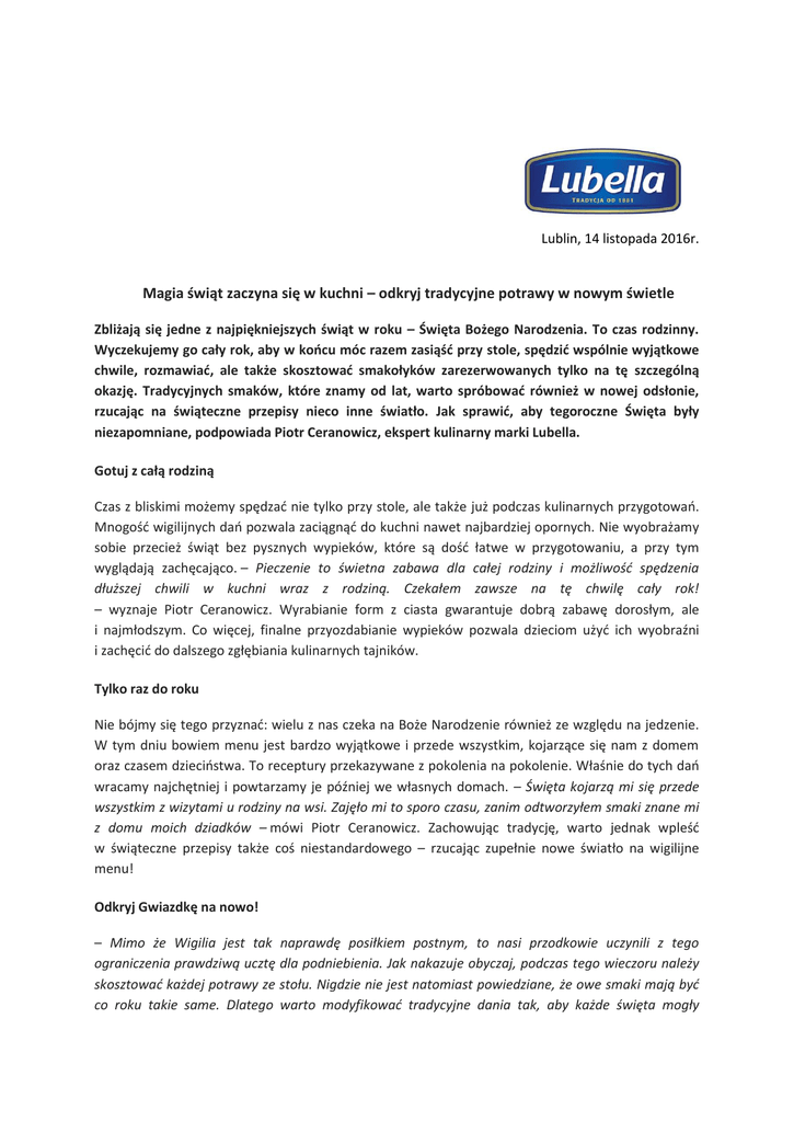 Lublin, 14 listopada 2016r. Magia świąt zaczyna się w kuchni – odkryj tradycyjne potrawy w nowym świetle Zbliżają się jedne z najpiękniejszych świąt w roku – Święta Bożego Narodzenia. To czas rodzinny. Wyczekujemy go cały rok, aby w końcu móc razem zasiąść przy stole, spędzić wspólnie wyjątkowe chwile, rozmawiać, ale także skosztować smakołyków zarezerwowanych tylko na tę szczególną okazję. Tradycyjnych smaków, które znamy od lat, warto spróbować również w nowej odsłonie, rzucając na świąteczne przepisy nieco inne światło. Jak sprawić, aby tegoroczne Święta były niezapomniane, podpowiada Piotr Ceranowicz, ekspert kulinarny marki Lubella. Gotuj z całą rodziną Czas z bliskimi możemy spędzać nie tylko przy stole, ale także już podczas kulinarnych przygotowań. Mnogość wigilijnych dań pozwala zaciągnąć do kuchni nawet najbardziej opornych. Nie wyobrażamy sobie przecież świąt bez pysznych wypieków, które są dość łatwe w przygotowaniu, a przy tym wyglądają zachęcająco. – Pieczenie to świetna zabawa dla całej rodziny i możliwość spędzenia dłuższej chwili w kuchni wraz z rodziną. Czekałem zawsze na tę chwilę cały rok! – wyznaje Piotr Ceranowicz. Wyrabianie form z ciasta gwarantuje dobrą zabawę dorosłym, ale i najmłodszym. Co więcej, finalne przyozdabianie wypieków pozwala dzieciom użyć ich wyobraźni i zachęcić do dalszego zgłębiania kulinarnych tajników. Tylko raz do roku Nie bójmy się tego przyznać: wielu z nas czeka na Boże Narodzenie również ze względu na jedzenie. W tym dniu bowiem menu jest bardzo wyjątkowe i przede wszystkim, kojarzące się nam z domem oraz czasem dzieciństwa. To receptury przekazywane z pokolenia na pokolenie. Właśnie do tych dań wracamy najchętniej i powtarzamy je później we własnych domach. – Święta kojarzą mi się przede wszystkim z wizytami u rodziny na wsi. Zajęło mi to sporo czasu, zanim odtworzyłem smaki znane mi z domu moich dziadków – mówi Piotr Ceranowicz. Zachowując tradycję, warto jednak wpleść w świąteczne przepisy także coś niestandardowego – rzucając zupełnie nowe światło na wigilijne menu! Odkryj Gwiazdkę na nowo! – Mimo że Wigilia jest tak naprawdę posiłkiem postnym, to nasi przodkowie uczynili z tego ograniczenia prawdziwą ucztę dla podniebienia. Jak nakazuje obyczaj, podczas tego wieczoru należy skosztować każdej potrawy ze stołu. Nigdzie nie jest natomiast powiedziane, że owe smaki mają być co roku takie same. Dlatego warto modyfikować tradycyjne dania tak, aby każde święta mogły smakować inaczej. Co więcej, takie zmiany umożliwią nam przygotowywanie owych przysmaków nie tylko 24 grudnia, ale także podczas całego roku – mówi Ceranowicz. Boże Narodzenie to w końcu nie tylko 12 potraw. Dlatego my proponujemy zamienić znane dotychczas pierniczki np. na świąteczne biscotti. Jest ono niemal tak samo łatwe w przyrządzeniu, a na pewno mile zaskoczy pistacjowym smakiem wszystkich gości. Inna propozycja to przygotowanie popularnego makaronu z makiem ale… w wersji zapiekanej pod koglem moglem. Lekko wyczuwalna nuta rumowa uczyni z niego danie smaczne, ale także wykwintne. Nowa forma podania tego popularnego przysmaku na długo zostanie w pamięci – może aż do kolejnych świąt? Jak widać, do wigilijnych przysmaków najczęściej stosowane są produkty zbożowe. – Mowa tu nie tylko o słodkich wypiekach czy makaronie. Często zapominamy o najpowszechniejszym przysmaku, czyli chlebie, który również powinien być obecny na świątecznym stole – ma on bowiem zapewnić pomyślność w nadchodzącym roku – dodaje kucharz. Podczas kulinarnych eksperymentów, w świątecznej gorączce przygotowań, warto pamiętać przede wszystkim o jakości wybieranych produktów. Wszystkie składniki, których używamy powinny być nie tylko smaczne, ale także bogate w wartości odżywcze. Obie te cechy posiadają produkty od Lubelli, która oferuje wszystko, co do świąt niezbędne – czyli pyszne i polskie makarony, kasze, mąki, a także płatki, które pomogą urozmaicić świąteczne wypieki. – Są one tak uniwersalne, że idealnie sprawdzą się zarówno podczas przygotowań wigilijnych nowości, jak i tradycyjnych dań regionalnych na bazie produktów zbożowych. Na Mazowszu prym wiedzie barszcz czerwony z mącznymi uszkami, Małopolska to z kolei zupa grzybowa z makaronem łazanki. Jeśli chodzi o desery – na Podlasiu i Dolnym Śląsku króluje zazwyczaj pszeniczna kutia, na Lubelszczyźnie najczęściej spotkamy struclę z dodatkiem maku i rodzynek a Opolszczyzna upodobała sobie śliszki – małe bułeczki drożdżowe w makowym sosie. Niezmiennie od województwa występują oczywiście także pierogi z grzybowymi, mięsnymi i rybnymi farszami, domowe kluski oraz kopytka – wylicza Piotr Ceranowicz. Jest taki dzień… Wieczerza 24 grudnia zasługuje także na wyjątkową oprawę pod względem nakrycia stołu. Stanowi on bowiem bardzo istotny element w czasie Świąt Bożego Narodzenia, a szczególnie w Wigilię, kiedy cała rodzina zasiada do niego i spędza przy nim większość wieczoru. Powinien być przystrojony śnieżnobiałym, eleganckim obrusem, na którym wedle tradycji mają znajdować się zielone gałązki igliwia, sianko i czerwone wstążeczki. Na samym już stole znajduje się pełna zastawa stołowa z dodatkowym kompletem dla zbłądzonego, nieznanego gościa. Wybierając naczynia warto postawić na tradycyjną biel, która sprawdza się zarówno w klasycznych, jak i nowoczesnych aranżacjach. Elegancji dodają jej często delikatne złote lub srebrne zdobienia. Dobrze prezentują się też zestawienia białego szkła lub porcelany z elementami wykonanymi z przezroczystego materiału. Elementy dekoracyjne możemy z kolei zapożyczyć z choinki, na przykład wypełniając bombkami półmisek lub rozkładając na stole choinkowe oświetlenie, kt