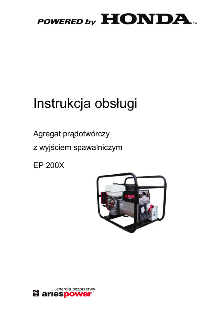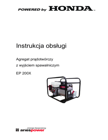 Instrukcja obsługi Agregat prądotwórczy z wyjściem spawalniczym EP 200X 2 SPIS TREŚCI 1 ZALECENIA BEZPIECZEŃSTWA..........................................................................................................................................3 2 IDENTYFIKACJA ELEMENTÓW STERUJĄCYCH ...............................................................................................................4 2.1 3 4 5 Sterowanie silnika ..................................................................................................................... 4 2.1.1 Rozrusznik ręczny ............................................................................................................. 4 2.1.2 Zawór paliwowy ................................................................................................................. 4 2.1.3 Alarm niskiego poziomu oleju ............................................................................................ 4 2.1.4 Cięgno ssania .................................................................................................................... 4 2.2 Sterowanie prądnicy ................................................................................................................. 5 2.3 Elementy sterujące.................................................................................................................... 5 2.4 Wyjście prądu stałego............................................................................................................... 5 2.5 Pokrętło regulacji prądu spawania ............................................................................................ 5 EKSPLOATACJA AGREGATU..............................................................................................................................................6 3.1 Połączenie z instalacją elektryczną budynku............................................................................ 6 3.2 Kontrola przed uruchomieniem ................................................................................................. 7 3.2.1 Kontrola poziomu oleju ...................................................................................................... 7 3.2.2 Kontrola poziomu paliwa................................................................................................... 7 3.3 Uruchomienie agregatu............................................................................................................. 7 3.4 Spawanie .................................................................................................................................. 8 3.5 Wybór natężenia prądu spawania i przewodów spawalniczych ............................................... 9 3.6 Cykl spawania ........................................................................................................................... 9 3.7 Problemy podczas spawania .................................................................................................... 9 3.8 Zatrzymanie silnika ................................................................................................................. 10 PRZEGLĄDY I KONSERWACJA.........................................................................................................................................10 4.1 Tabela przeglądów.................................................................................................................. 10 4.2 Wymiana oleju silnikowego..................................................................................................... 11 4.3 Filtr powietrza.......................................................................................................................... 11 4.4 Czyszczenie odstojnika paliwa ............................................................................................... 12 4.5 Świeca zapłonowa .................................................................................................................. 13 4.6 Łapacz iskier ........................................................................................................................... 14 4.7 Transport i przechowywanie ................................................................................................... 14 DANE TECHNICZNE ............................................................................................................................................................16 3 1 Zalecenia bezpieczeństwa Zapoznaj się z niniejszą instrukcją obsługi, oraz z instrukcją obsługi silnika agregatu i stosuj się do zawartych tam zaleceń! Zawsze przed uruchomieniem sprawdź urządzenie. Przeczytaj instrukcję obsługi silnika, aby zapoznać się z jego obsługą. Ustaw agregat na płaskiej powierzchni, przynajmniej 1 m od budynków. Nigdy nie wykorzystuj urządzenia w zamkniętym pomieszczeniu. Zarówno silnik, jak i prądnica muszą mieć zapewnioną dostateczną wentylację. Spaliny silnika zawierają toksyczny tlenek węgla. Upewnij się, że wiesz jak szybko zatrzymać pracę agregatu oraz, że znasz funkcjonowanie elementów sterujących urządzenia. Agregat nie może być obsługiwany przez osobę, która nie umie się nim posłużyć. Nie zbliżaj się do agregatu z mokrymi rękoma. Nie używaj agregatu podczas opadów deszczu i śniegu. Benzyna jest łatwopalna. Opary benzyny również są bardzo łatwopalne. Uzupełniaj paliwo tylko na zewnątrz, ewentualnie w dobrze wentylowanych pomieszczeniach, przy wyłączonym i schłodzonym silniku. Podłączenie do sieci budynku może być wykonane wyłącznie przez wykwalifikowane osoby! Nieprofesjonalne podłączenie do sieci budynku może spowodować wsteczny przepływ prądu do linii zawodowej a także porazić pracowników obsługujących te linie. Może również zniszczyć sam agregat i zasilane odbiory. Tłumik silnika rozgrzewa się podczas pracy i pozostaje gorący przez pewien czas po wyłączeniu s