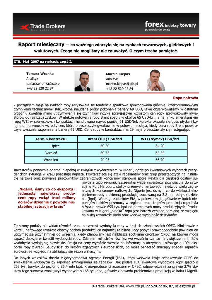 Raport miesięczny — co ważnego zdarzyło się na rynkach towarowych, giełdowych i walutowych. Czego nie mogliśmy nie zauważyć. O czym trzeba pamiętać. XTB. Maj 2007 na rynkach, część I. Tomasz Wronka Analityk [email protected] +48 22 520 22 84 Marcin Kiepas Analityk [email protected] +48 22 520 22 84 Ropa naftowa Z początkiem maja na rynkach ropy zarysowała się tendencja spadkowa spowodowana głównie krótkoterminowymi czynnikami technicznymi. Kilkukrotne nieudane próby pokonania bariery 69 USD, jakie obserwowaliśmy w ostatnim tygodniu kwietnia mimo utrzymywania się czynników ryzyka sprzyjającym wzrostom cen ropy sprowokowały inwestorów do realizacji zysków. W efekcie notowania ropy Brent spadły w okolice 65 USD/brl., a na rynku amerykańskim ropą WTI w czerwcowych kontraktach handlowano nawet poniżej 61 USD/brl. Korekta okazała się dość płytka i kolejne dni przynosiły wzrosty cen, które przyspieszyły gwałtownie w połowie miesiąca, kiedy cena ropy Brent przekroczyła wyraźnie wspomniana barierę 69 USD. Ceny ropy w kontraktach na 29 maja przedstawiały się następująco: Termin kontraktu Brent (ICE) USD/brl WTI (Nymex) USD/brl 69.30 64.20 Sierpień 69.65 65.55 Wrzesień 70.05 66.70 Lipiec Inwestorów ponownie ogarnął niepokój w związku z wydarzeniami w Nigerii, gdzie po kwietniowych wyborach prezydenckich sytuacja w kraju pozostaje napięta. Powtarzające się ataki rebeliantów oraz grup przestępczych na instalacje naftowe oraz porwania pracowników zagranicznych koncernów stanowią spore ryzyko dla ciągłości dostaw surowca z tego regionu. Szczególną wagę inwestorzy przywiązują do sytuacji w Port Harcourt, stolicy przemysłu naftowego i siedziby wielu zagra„Nigeria, ósmy co do eksportu i nicznych koncernów naftowych. Nigeria jest ósmym co do wielkości eksjedenasty największy produporterem ropy z dzienną produkcją szacowaną na 2.8 mln baryłek dziencent ropy wciąż traci miliony nie (bpd). Według szacunków EIA, w połowie maja, głównie wskutek niedolarów dziennie z powodu niepokojów i aktów przemocy w regionie oraz strajków produkcja ropy była stabilnej sytuacji w kraju” niższa o prawie 695 tys. bpd od normalnych mocy produkcyjnych. Produkowana w Nigerii „słodka” ropa jest bardzo cenioną odmianą ze względu na niską zawartość siarki oraz wysoką wydajność destylatów. Ze strony podaży nie widać również szans na wzrost wydobycia ropy w krajach członkowskich OPEC. Ministrowie z kartelu naftowego uważają obecny poziom produkcji co najmniej za bilansujący popyt i prawdopodobnie powinien on utrzymać się przynajmniej do września, kiedy planowany jest najbliższe spotkanie członków OPEC, na którym mogą zapaść decyzje w kwestii wydobycia ropy. Zdaniem ministrów również we wrześniu szanse na zwiększenie limitów wydobycia wydają się niewielkie. Presja na ceny wyraźnie wzrosła po informacji o utrzymaniu niższego o 10% eksportu ropy z Arabii Saudyjskiej do krajów azjatyckich i europejskich, co może oznaczać znaczący spadek zapasów surowca, ze względu na zbliżający się sezon wakacyjny. Do innych wniosków doszła Międzynarodowa Agencja Energii (IEA), która wezwała kraje członkowskie OPEC do zwiększenia wydobycia by zapobiec zmniejszaniu się zapasów Jak podała IEA, światowe wydobycie ropy spadło o 265 tys. baryłek do poziomu 85.4 mln bpd. Kraje-producenci zrzeszeni w OPEC, odpowiedzialni za prawie 37% dostaw tego surowca zmniejszyli wydobycie o 165 tys. bpd, głównie z powodu problemów z produkcją w Iraku i Nigerii. X-Trade Brokers DM, www.xtb.pl, 22 520 22 86, 87, [email protected] Wykres notowań ropy Brend, kwiecień-maj 2007, źródło X-Trader Zdaniem Agencji obecny poziom wydobycia nie gwarantuje możliwości tworzenia zapasów surowca, jakie ma miejsce zwykle na wiosnę przed sezonem wakacyjnym, kiedy zużycie paliw znacznie rośnie. Wstępne dane o zapasach w krajach zrzeszonych w OECD mówią o ich spadku w pierwszym kwartale o 1 mln bpd. W lutym zapasy stopniały o ponad 80 mln baryłek. Podobnie jak poprzedni miesiąc maj upłynął pod znakiem „Zdaniem przedstawicieli OPEC podaż spekulacji odnośnie zapasów paliw i ich perspektyw w ropy jest na odpowiednim poziomie, związku ze zbliżającym się szybkimi krokami sezonem waa nawet go przewyższa. Wysokie ceny kacyjnym. Mimo, iż przez przeważającą część maja zapasy rosły w dość przyzwoitym tempie to obawy o odpowiednią surowca to zdaniem OPEC efekt napięcia podaż w okresie wzmożonej konsumpcji wyraźnie pchnęły geopolitycznego” ceny paliw w kierunku wzrostów. W maju wzrosło wykorzystanie mocy produkcyjnych w rafineriach, które w tygodniu kończącym się w dniu 18 maja wzrosło do 91,1% z 88,3% w ostatnim tygodniu kwietnia, dzięki czemu zmniejszył się deficyt produkcji w stosunku do bieżącego spożycia. Wyraźny wzrost importu benzyny i jej półproduktów, 370,00 350,00 330,00 310,00 290,00 270,00 250,00 230,00 210,00 190,00 Zapasy ropy (m ln brl) 07 -0 5- 20 07 20 07 -0 3- 07 07 07 -0 1- 20 07 -1 1- 07 20 06 -0 9- 07 -0 7- 20 06 20 06 20 06 -0 5- 07 07 07 -0 3- 20 06 -0 1- 20 06 -1 1- 07 07 -0 9- 20 05 20 05 20 05 -0 7- 07 07 07 -0 5- 20 05 -0 3- 20 05 20 05 -0 1- 07 170,00 Zapasy benzyny (m ln brl) X-Trade Brokers DM, www.xtb.pl, 22 520 22 86, 87, [email protected], 2 którego wielkość w pierwszych trzech tygodniach maja wyniosła średnio 1,35 mln bpd, pozwolił również na wzrost stanu zapasów. Pomimo to jest on o prawie 15 mln brl. niższy niż przed rokiem. Na rynku hurtowym ceny benzyny RBOB w maju wzrosły z 2.26 USD do ponad 2.40 USD za galon (3.785 litra), pozostając od połowy stycznia w bardzo mocnym trendzie. Od początku roku ceny hurtowe wzrosły o ponad 50%, przy rosnącej zmienności oraz zaangażowaniu inwestorów spekulacyjnych. Jednocześnie rekordowe poziomy osiągnęły „ Wyjątkowo niskie zapasy benzyny winceny detaliczne, w kategoriach realn
