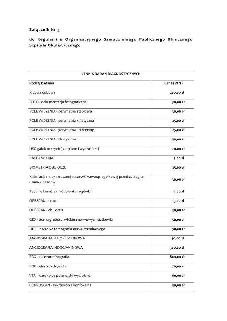 Załącznik Nr 3 do Regulaminu Org anizacyjnego Samodzie lnego Publicznego Klinicznego Szpitala Okulistycznego CENNIK BADAŃ DIAGNOSTYCZNYCH Rodzaj badania Krzywa dobowa Cena (PLN) 200,00 zł FOTO - dokumentacja fotograficzna 30,00 zł POLE WIDZENIA - perymetria statyczna 30,00 zł POLE WIDZENIA - perymetria kinetyczna 25,00 zł POLE WIDZENIA - perymetria - screening 25,00 zł POLE WIDZENIA - blue yellow 50,00 zł USG gałek ocznych ( z opisem i wydrukiem) 20,00 zł PACHYMETRIA 15,00 zł BIOMETRIA OBU OCZU 25,00 zł Kalkulacja mocy sztucznej soczewki wewnątrzgałkowej przed zabiegiem usunięcia zaćmy 30,00 zł Badanie komórek śródbłonka rogówki 15,00 zł ORBSCAN - 1 oko 15,00 zł ORBSCAN - obu oczu 30,00 zł GDX - ocena grubości włókien nerwowych siatkówki 50,00 zł HRT - laserowa tomografia nerwu wzrokowego 50,00 zł ANGIOGRAFIA FLUORESCEINOWA 150,00 zł ANGIOGRAFIA INDOCJANINOWA 300,00 zł ERG - elektroretinografia 800,00 zł EOG - elektrokulografia 70,00 zł VER - wzrokowe potencjały wywołane 60,00 zł CONFOSCAN - mikroskopia konfokalna 50,00 zł UBM - biomikroskopia ultradźwiękowa (1 oko) 45,00 zł UBM - biomikroskopia ultradźwiękowa (obu oczu) 90,00 zł Badanie OCT 100,00 zł Pomiar ciśnienia wewnątrzgałkowego z uwzględnieniem grubości rogówki 15,00 zł CENNIK PROCEDUR AMBULATORYJNYCH Rodzaj procedury Cena (PLN) Porada w Poradni Okulistycznej 110,00 zł Zabieg laserem YAG - kapsulotomia (przecięcie torebki tylnej) 200,00 zł Zabieg laserem YAG - iridektomia laserowa 200,00 zł Zabieg laserem argonowym - laseroterapia ogniskowa 200,00 zł Zabieg laserem argonowym - panfotokoagulacja 200,00 zł Usunięcie ciała obcego rogówki 100,00 zł Szycie rany spojówki 600,00 zł Szycie małej rany powieki 620,00 zł Usunięcie szwów spojówkowych 400,00 zł Usunięcie szwów powiekowych 400,00 zł CENNIK PROCEDUR ZABIEGOWYCH OKULISTYCZNYCH * Nazwa procedury Cena (PLN) Usunięcie zaćmy, z jednoczesnym wszczepem sztucznej soczewki 3150,00 zł Fakoemulsyfikacja zaćmy bez wszczepu soczewki 2850, 00 zł Wszczep wtórny soczewki z fiksacją śródskleralną 2000,00 zł Wszczep wtórny soczewki 2000,00 zł Operacje przeciwjaskrowe: - Trabekulektomia 5600,00 zł - Kanaloplastyka 4500,00 zł Zabiegi wieloproceduralne: usunięcie zaćmy, wszczepienie sztucznej soczewki i operacja przeciwjaskrowa (kanaloplastyka) 7650,00 zł Zabiegi wieloproceduralne: usunięcie zaćmy, wszczepienie sztucznej soczewki i operacja przeciwjaskrowa (trabekulektomia) 8750,00 zł Zaopatrzenie chirurgiczne ran powierzchownych spojówki i aparatu ochronnego oka 660,00 zł Usunięcie gałki ocznej z implantem: - z siateczką 3340,00 zł - bez siateczki 2320,00 zł Chirurgiczne leczenie odwarstwienia siatkówki (założenie opaski i/lub plomby) 1650,00 zł Witrektomia tylna 6760,00 zł Wieloproceduralne zabiegi witreoretinalne (fakowitrektomia z wszczepieniem sztucznej soczewki) 9910,00 zł Uraz twardówki, rogówki – chirurgiczne zaopatrzenie ran 770,00 zł Naszycie owodni 870,00 zł Cyklofotokoagulacja 470,00 zł Endocyklofotokoagulacja 2400,00 zł Stawka za 1 osobodzień pobytu w szpitalu wynosi 904 zł. * Za świadczenia medyczne udzielane w warunkach szpitalnych pobiera się opłatę stanowiącą iloczyn liczby dni pobytu oraz stawki za osobodzień, powiększoną o wartość zużytych na rzecz pacjenta leków oraz wykonanych procedur medycznych. Stawkę za osobodzień przyjmuje się z ostatniego dnia roku poprzedzającego wykonanie świadczenia, koszt leków wylicza się z aktualnie obowiązujących cen w dniu wykonania świadczenia, koszt wykonanych procedur medycznych na podstawie jednostkowego kosztu własnego sprzedaży ostatniego dnia roku poprzedzającego wykonanie świadczenia. przyjmuje się z Koszty świadczeń medycznych nie ujętych w cenniku wyliczane są indywidualnie. CENNIK OPŁAT ZA TRANSPORT SANITARNY Przewóz pacjenta bez powrotu na terenie Warszawy: bez sanitariusza 35,42 zł z sanitariuszem 50,92 zł Przewóz pacjenta poza teren Warszawy: bez sanitariusza 59,04 zł + 1,32 zł za każdy kilometr od granicy administracyjnej Warszawy z sanitariuszem 59,04 zł + 1,47 zł za każdy kilometr od granicy administracyjnej Warszawy CENNIK OPŁAT ZA UDOSTĘPNIENIE DOKUMENTACJI MEDYCZNEJ Za jedną stronę wyciągu lub odpisu dokumentacji medycznej 6,00 zł Za jedną stronę kserokopii dokumentacji medycznej 0,75 zł Podane ceny są cenami orientacyjnymi i nie stanowią oferty handlowej w świetle prawa. Ustalone przed operacją ceny mogą ulec zmianie z uwagi na ewentualną konieczność rozszerzenia zakresu procedur medycznych.