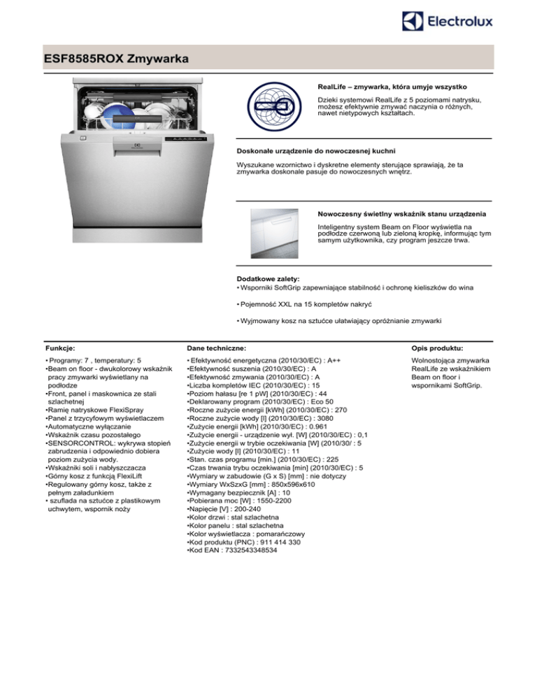 ESF8585ROX Zmywarka RealLife – zmywarka, która umyje wszystko Dzieki systemowi RealLife z 5 poziomami natrysku, możesz efektywnie zmywać naczynia o różnych, nawet nietypowych kształtach. Doskonałe urządzenie do nowoczesnej kuchni Wyszukane wzornictwo i dyskretne elementy sterujące sprawiają, że ta zmywarka doskonale pasuje do nowoczesnych wnętrz. Nowoczesny świetlny wskaźnik stanu urządzenia Inteligentny system Beam on Floor wyświetla na podłodze czerwoną lub zieloną kropkę, informując tym samym użytkownika, czy program jeszcze trwa. Dodatkowe zalety: • Wsporniki SoftGrip zapewniające stabilność i ochronę kieliszków do wina • Pojemność XXL na 15 kompletów nakryć • Wyjmowany kosz na sztućce ułatwiający opróżnianie zmywarki Funkcje: Dane techniczne: Opis produktu: • Programy: 7 , temperatury: 5 •Beam on floor - dwukolorowy wskaźnik pracy zmywarki wyświetlany na podłodze •Front, panel i maskownica ze stali szlachetnej •Ramię natryskowe FlexiSpray •Panel z trzycyfowym wyświetlaczem •Automatyczne wyłączanie •Wskaźnik czasu pozostałego •SENSORCONTROL: wykrywa stopień zabrudzenia i odpowiednio dobiera poziom zużycia wody. •Wskaźniki soli i nabłyszczacza •Górny kosz z funkcją FlexiLift •Regulowany górny kosz, także z pełnym załadunkiem • szuflada na sztućce z plastikowym uchwytem, wspornik noży • Efektywność energetyczna (2010/30/EC) : A++ •Efektywność suszenia (2010/30/EC) : A •Efektywność zmywania (2010/30/EC) : A •Liczba kompletów IEC (2010/30/EC) : 15 •Poziom hałasu [re 1 pW] (2010/30/EC) : 44 •Deklarowany program (2010/30/EC) : Eco 50 •Roczne zużycie energii [kWh] (2010/30/EC) : 270 •Roczne zużycie wody [l] (2010/30/EC) : 3080 •Zużycie energii [kWh] (2010/30/EC) : 0.961 •Zużycie energii - urządzenie wył. [W] (2010/30/EC) : 0,1 •Zużycie energii w trybie oczekiwania [W] (2010/30/ : 5 •Zużycie wody [l] (2010/30/EC) : 11 •Stan. czas programu [min.] (2010/30/EC) : 225 •Czas trwania trybu oczekiwania [min] (2010/30/EC) : 5 •Wymiary w zabudowie (G x S) [mm] : nie dotyczy •Wymiary WxSzxG [mm] : 850x596x610 •Wymagany bezpiecznik [A] : 10 •Pobierana moc [W] : 1550-2200 •Napięcie [V] : 200-240 •Kolor drzwi : stal szlachetna •Kolor panelu : stal szlachetna •Kolor wyświetlacza : pomarańczowy •Kod produktu (PNC) : 911 414 330 •Kod EAN : 7332543348534 Wolnostojąca zmywarka RealLife ze wskaźnikiem Beam on floor i wspornikami SoftGrip. ESF8585ROX Zmywarka