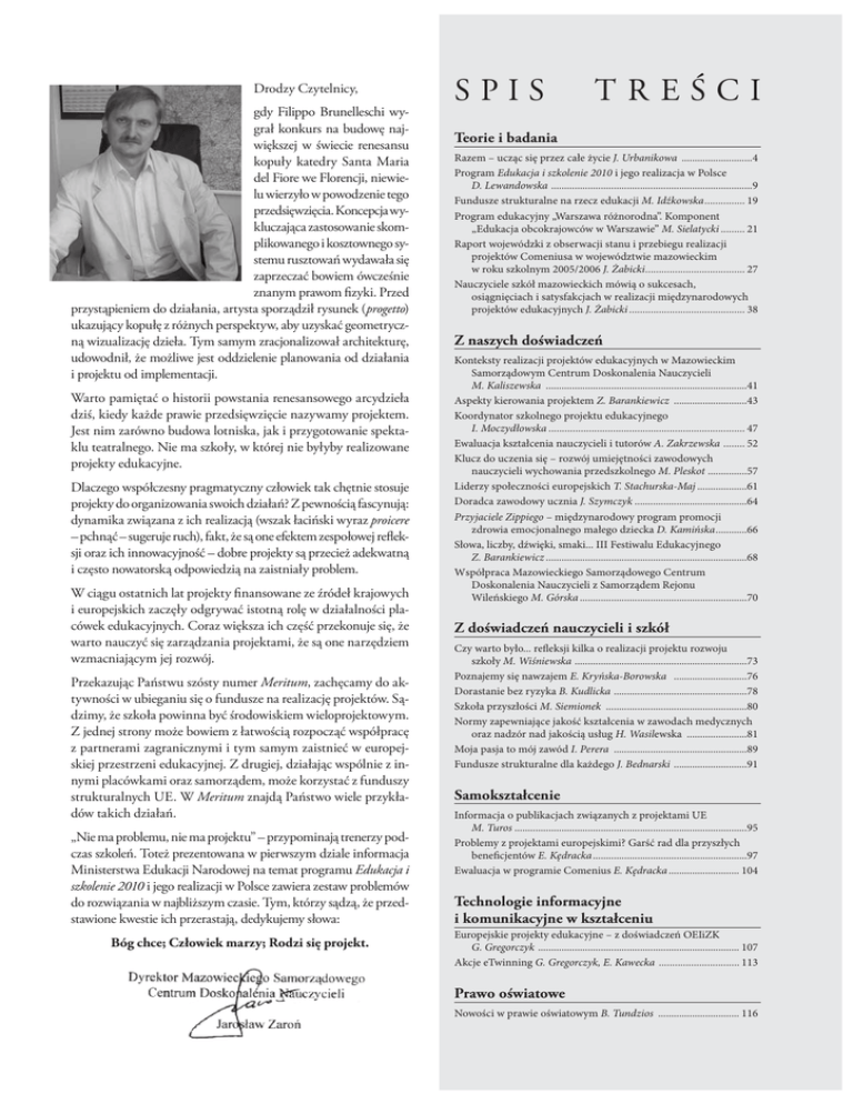 Drodzy Czytelnicy, gdy Filippo Brunelleschi wygrał konkurs na budowę największej w świecie renesansu kopuły katedry Santa Maria del Fiore we Florencji, niewielu wierzyło w powodzenie tego przedsięwzięcia. Koncepcja wykluczająca zastosowanie skomplikowanego i kosztownego systemu rusztowań wydawała się zaprzeczać bowiem ówcześnie znanym prawom fizyki. Przed przystąpieniem do działania, artysta sporządził rysunek (progetto) ukazujący kopułę z różnych perspektyw, aby uzyskać geometryczną wizualizację dzieła. Tym samym zracjonalizował architekturę, udowodnił, że możliwe jest oddzielenie planowania od działania i projektu od implementacji. Warto pamiętać o historii powstania renesansowego arcydzieła dziś, kiedy każde prawie przedsięwzięcie nazywamy projektem. Jest nim zarówno budowa lotniska, jak i przygotowanie spektaklu teatralnego. Nie ma szkoły, w której nie byłyby realizowane projekty edukacyjne. Dlaczego współczesny pragmatyczny człowiek tak chętnie stosuje projekty do organizowania swoich działań? Z pewnością fascynują: dynamika związana z ich realizacją (wszak łaciński wyraz proicere – pchnąć – sugeruje ruch), fakt, że są one efektem zespołowej refleksji oraz ich innowacyjność – dobre projekty są przecież adekwatną i często nowatorską odpowiedzią na zaistniały problem. W ciągu ostatnich lat projekty finansowane ze źródeł krajowych i europejskich zaczęły odgrywać istotną rolę w działalności placówek edukacyjnych. Coraz większa ich część przekonuje się, że warto nauczyć się zarządzania projektami, że są one narzędziem wzmacniającym jej rozwój. Przekazując Państwu szósty numer Meritum, zachęcamy do aktywności w ubieganiu się o fundusze na realizację projektów. Sądzimy, że szkoła powinna być środowiskiem wieloprojektowym. Z jednej strony może bowiem z łatwością rozpocząć współpracę z partnerami zagranicznymi i tym samym zaistnieć w europejskiej przestrzeni edukacyjnej. Z drugiej, działając wspólnie z innymi placówkami oraz samorządem, może korzystać z funduszy strukturalnych UE. W Meritum znajdą Państwo wiele przykładów takich działań. „Nie ma problemu, nie ma projektu” – przypominają trenerzy podczas szkoleń. Toteż prezentowana w pierwszym dziale informacja Ministerstwa Edukacji Narodowej na temat programu Edukacja i szkolenie 2010 i jego realizacji w Polsce zawiera zestaw problemów do rozwiązania w najbliższym czasie. Tym, którzy sądzą, że przedstawione kwestie ich przerastają, dedykujemy słowa: Bóg chce; Człowiek marzy; Rodzi się projekt. SPIS TREŚCI Teorie i badania Razem – ucząc się przez całe życie J. Urbanikowa ...........................4 Program Edukacja i szkolenie 2010 i jego realizacja w Polsce D. Lewandowska .............................................................................9 Fundusze strukturalne na rzecz edukacji M. Idźkowska ............... 19 Program edukacyjny „Warszawa różnorodna”. Komponent „Edukacja obcokrajowców w Warszawie” M. Sielatycki ......... 21 Raport wojewódzki z obserwacji stanu i przebiegu realizacji projektów Comeniusa w województwie mazowieckim w roku szkolnym 2005/2006 J. Żabicki ..................................... 27 Nauczyciele szkół mazowieckich mówią o sukcesach, osiągnięciach i satysfakcjach w realizacji międzynarodowych projektów edukacyjnych J. Żabicki ........................................... 38 Z naszych doświadczeń Konteksty realizacji projektów edukacyjnych w Mazowieckim Samorządowym Centrum Doskonalenia Nauczycieli M. Kaliszewska .............................................................................41 Aspekty kierowania projektem Z. Barankiewicz ............................43 Koordynator szkolnego projektu edukacyjnego I. Moczydłowska ......................................................................... 47 Ewaluacja kształcenia nauczycieli i tutorów A. Zakrzewska ........ 52 Klucz do uczenia się – rozwój umiejętności zawodowych nauczycieli wychowania przedszkolnego M. Pleskot ...............57 Liderzy społeczności europejskich T. Stachurska-Maj ...................61 Doradca zawodowy ucznia J. Szymczyk ...........................................64 Przyjaciele Zippiego – międzynarodowy program promocji zdrowia emocjonalnego małego dziecka D. Kamińska ............66 Słowa, liczby, dźwięki, smaki... III Festiwalu Edukacyjnego Z. Barankiewicz .............................................................................68 Współpraca Mazowieckiego Samorządowego Centrum Doskonalenia Nauczycieli z Samorządem Rejonu Wileńskiego M. Górska ................................................................70 Z doświadczeń nauczycieli i szkół Czy warto było... refleksji kilka o realizacji projektu rozwoju szkoły M. Wiśniewska ..................................................................73 Poznajemy się nawzajem E. Kryńska-Borowska ............................76 Dorastanie bez ryzyka B. Kudlicka ...................................................78 Szkoła przyszłości M. Siemionek ......................................................80 Normy zapewniające jakość kształcenia w zawodach medycznych oraz nadzór nad jakością usług H. Wasilewska .......................81 Moja pasja to mój zawód I. Perera ...................................................89 Fundusze strukturalne dla każdego J. Bednarski ............................91 Samokształcenie Informacja o publikacjach związanych z projektami UE M. Turos .........................................................................................95 Problemy z projektami europejskimi? Garść rad dla przyszłych beneficjentów E. Kędracka ...........................................................97 Ewaluacja w programie Comenius E. Kędracka ........................... 104 Technologie informacyjne i komunikacyjne w kształceniu Europejskie pr