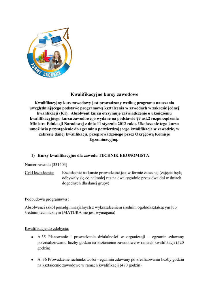 Kwalifikacyjne kursy zawodowe Kwalifikacyjny kurs zawodowy jest prowadzony według programu nauczania uwzględniającego podstawę programową kształcenia w zawodach w zakresie jednej kwalifikacji (K1). Absolwent kursu otrzymuje zaświadczenie o ukończeniu kwalifikacyjnego kursu zawodowego wydane na podstawie §9 ust.2 rozporządzenia Ministra Edukacji Narodowej z dnia 11 stycznia 2012 roku. Ukończenie tego kursu umożliwia przystąpienie do egzaminu potwierdzającego kwalifikacje w zawodzie, w zakresie danej kwalifikacji, przeprowadzonego przez Okręgową Komisje Egzaminacyjną. 1) Kursy kwalifikacyjne dla zawodu TECHNIK EKONOMISTA Numer zawodu [331403] Cykl kształcenia: Kształcenie na kursie prowadzone jest w formie zaocznej (zajęcia będą odbywały się co najmniej raz na dwa tygodnie przez dwa dni w dniach dogodnych dla danej grupy) Podbudowa programowa : Absolwenci szkół ponadgimnazjalnych z wykształceniem średnim ogólnokształcącym lub średnim technicznym (MATURA nie jest wymagana) Kwalifikacje do zdobycia: A.35 Planowanie i prowadzenie działalności w organizacji – egzamin zdawany po zrealizowaniu liczby godzin na kształcenie zawodowe w ramach kwalifikacji (520 godzin) A. 36 Prowadzenie rachunkowości - egzamin zdawany po zrealizowaniu liczby godzin na kształcenie zawodowe w ramach kwalifikacji (470 godzin) Absolwent kwalifikacyjnego kursu zawodowego w ramach kwalifikacji A.35.otrzymuje zaświadczenie potwierdzające przygotowanie do wykonywania następujących zadań zawodowych: planowanie i prowadzenie działalności gospodarczej, obliczanie podatków, prowadzenie spraw kadrowo-płacowych, organizowanie współpracy z kontrahentami i innymi podmiotami, prowadzenie spraw związanych z obrotem materiałami, towarami i wyrobami gotowymi oraz środkami pieniężnymi, korzystanie z programów komputerowych wspomagających prowadzenie działalności gospodarczej i rozliczeń podatkowych, prowadzenie dokumentacji dotyczącej rekrutacji, zatrudnienia i przebiegu pracy pracowników, sporządzanie dokumentacji w sprawach emerytalno-rentowych pracowników, obliczanie wynagrodzeń według różnych systemów płac i z tytułu różnych umów, sporządzanie list płac. Absolwent kwalifikacyjnego kursu zawodowego w ramach kwalifikacji A.36.otrzymuje zaświadczenie potwierdzające przygotowanie do wykonywania następujących zadań zawodowych: wykonywanie czynności związanych z prowadzeniem rachunkowości w różnego rodzaju podmiotach z wykorzystaniem najnowszych księgowych programów komputerowych , prowadzenie ewidencji podatkowych, dokumentowanie i ewidencjonowanie operacji gospodarczych, przeprowadzanie i rozliczanie inwentaryzacji, sporządzanie sprawozdań finansowych, przeprowadzanie analiz finansowych. Słuchacz po uzupełnieniu kwalifikacji A.65. może uzyskać tytuł: technik rachunkowości Rekrutacja: Będzie prowadzona od 1-go marca do 15 lipca 2016 roku w Sekretariacie Szkoły ul. Plac Mickiewicza 13. Zadzwoń lub odwiedź nas osobiście, od poniedziałku do piątku w godzinach od 8.30 do 15.30. Wymagane dokumenty: świadectwo ukończenia szkoły średniej (lub świadectwo dojrzałości), dowód osobisty, zaświadczenie od lekarza medycyny pracy o braku przeciwskazań do praktycznej nauki zawodu, podanie o przyjęcie (dostępne w sekretariacie lub stronie internetowej). 2) Kursy kwalifikacyjne dla zawodu TECHNIK HANDLOWIEC Kwalifikacja A.18. Prowadzenie sprzedaży. Obejmuje: 1. Organizowanie sprzedaży. 2. Sprzedaż towarów. Egzamin z kwalifikacji A.18 jest podstawą uzyskania zawodu sprzedawcy (522301). Predyspozycje psychofizyczne, kompetencje społeczne i personalne sprzedawcy. Organizowanie pracy własnej, umiejętność pracy zespołowej, komunikatywność, asertywność, uczciwość, przestrzeganie zasad etyki, dobra pamięć wzrokowa, znajomość zasad prowadzenia rozmowy sprzedażowej. Charakterystyka środowiska pracy Praca sprzedawcy odbywa się każdego dnia tygodnia, najczęściej w systemie zmianowym. Praca ma charakter stojący, ale należy do średnio uciążliwych pod względem fizycznym, ponieważ istnieje możliwość chwilowej zmiany stanowiska na komputerowe o charakterze siedzącym, w momencie sporządzania niezbędnych dokumentów. Wymaga ciągłego kontaktu z klientem, informowania, doradzania jak również orientowania się w jego potrzebach. Sprzedawca odpowiedzialny jest także za monitorowanie asortymentu, by w odpowiednim momencie zamówić brakujący. Najczęściej wykonywanie tego zawodu związane jest z pracą w sklepie, dyskoncie, supermarkecie lub hurtowni. Możliwości uzyskania dodatkowych kwalifikacji w innych zawodach Kwalifikacja A.18 umożliwia uzyskanie zawodu technik handlowiec Kwalifikacja A.22 - Prowadzenie działalności handlowej. Uzyskanie kwalifikacji A.18 i A.22 umożliwia zdobycie tytułu technik handlowiec Predyspozycje psychofizyczne, kompetencje społeczne i personalne handlowca. Komunikatywność, odpowiedzialność, uczciwość, umiejętność pracy zespołowej, stosowanie technik negocjacyjnych, umiejętności analityczne i selekcyjne, prawo jazdy, znajomość języków obcych. Charakterystyka środowiska pracy Praca handlowca wiąże się z prezentacją towarów na potrzeby partnerów handlowych (przedstawiciel handlowy) lub sprzedażą bezpośrednią. Charakteryzuje się koniecznością przemieszczania się, wykonywania zadań pod presją czasu oraz wymaga umiejętności obsługi komputera i sprzętu biurowego, znajomości technik negocjacyjnych. Egzamin z kwalifikacji A.22 składa się z dwóch etapów: a) etap pisemny – 40 pytań testowych (60 minut); warunkiem zaliczenia jest co najmniej 50% prawidłowych odpowiedzi. b) etap praktyczny – 180 minut; warunkiem zaliczenia jest co najmniej 75% możliwych punktów do uzyskania. Możliwości uzyskania dodatkowych kwalifikacji w innych zawodach Dla zawodu technik handlowiec przykładowe ścieżki rozwoju zawodowego mogą prowadzić do następujących 
