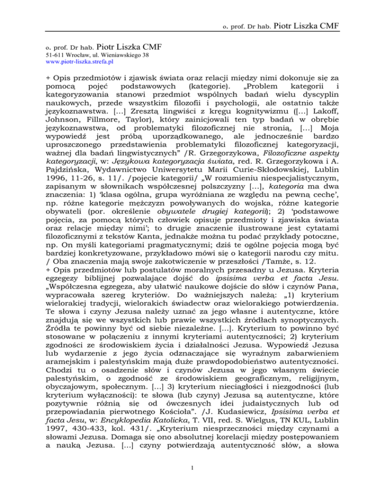 o. prof. Dr hab. Piotr Liszka CMF o. prof. Dr hab. Piotr Liszka CMF 51-611 Wrocław, ul. Wieniawskiego 38 www.piotr-liszka.strefa.pl + Opis przedmiotów i zjawisk świata oraz relacji między nimi dokonuje się za pomocą pojęć podstawowych (kategorie). „Problem kategorii i kategoryzowania stanowi przedmiot wspólnych badań wielu dyscyplin naukowych, przede wszystkim filozofii i psychologii, ale ostatnio także językoznawstwa. […] Zresztą lingwiści z kręgu kognitywizmu ([…] Lakoff, Johnson, Fillmore, Taylor), który zainicjowali ten typ badań w obrębie językoznawstwa, od problematyki filozoficznej nie stronią, […] Moja wypowiedź jest próbą uporządkowanego, ale jednocześnie bardzo uproszczonego przedstawienia problematyki filozoficznej kategoryzacji, ważnej dla badań lingwistycznych” /R. Grzegorzykowa, Filozoficzne aspekty kategoryzacji, w: Językowa kategoryzacja świata, red. R. Grzegorzykowa i A. Pajdzińska, Wydawnictwo Uniwersytetu Marii Curie-Skłodowskiej, Lublin 1996, 11-26, s. 11/. /pojęcie kategorii/ „W rozumieniu niespecjalistycznym, zapisanym w słownikach współczesnej polszczyzny […], kategoria ma dwa znaczenia: 1) ‘klasa ogólna, grupa wyróżniana ze względu na pewną cechę’, np. różne kategorie mężczyzn powoływanych do wojska, różne kategorie obywateli (por. określenie obywatele drugiej kategorii); 2) ‘podstawowe pojęcia, za pomocą których człowiek opisuje przedmioty i zjawiska świata oraz relacje między nimi’; to drugie znaczenie ilustrowane jest cytatami filozoficznymi z tekstów Kanta, jednakże można tu podać przykłady potoczne, np. On myśli kategoriami pragmatycznymi; dziś te ogólne pojęcia mogą być bardziej konkretyzowane, przykładowo mówi się o kategorii narodu czy mitu. / Oba znaczenia mają swoje zakotwiczenie w przeszłości /Tamże, s. 12. + Opis przedmiotów lub postulatów moralnych przesadny u Jezusa. Kryteria egzegezy biblijnej pozwalające dojść do ipsisima verba et facta Jesu. „Współczesna egzegeza, aby ułatwić naukowe dojście do słów i czynów Pana, wypracowała szereg kryteriów. Do ważniejszych należą: „1) kryterium wielorakiej tradycji, wielorakich świadectw oraz wielorakiego potwierdzenia. Te słowa i czyny Jezusa należy uznać za jego własne i autentyczne, które znajdują się we wszystkich lub prawie wszystkich źródłach synoptycznych. Źródła te powinny być od siebie niezależne. [...]. Kryterium to powinno być stosowane w połączeniu z innymi kryteriami autentyczności; 2) kryterium zgodności ze środowiskiem życia i działalności Jezusa. Wypowiedź Jezusa lub wydarzenie z jego życia odznaczające się wyraźnym zabarwieniem aramejskim i palestyńskim mają duże prawdopodobieństwo autentyczności. Chodzi tu o osadzenie słów i czynów Jezusa w jego własnym świecie palestyńskim, o zgodność ze środowiskiem geograficznym, religijnym, obyczajowym, społecznym. [...] 3) kryterium nieciągłości i niezgodności (lub kryterium wyłączności): te słowa (lub czyny) Jezusa są autentyczne, które pozytywnie różnią się od ówczesnych idei judaistycznych lub od przepowiadania pierwotnego Kościoła”. /J. Kudasiewicz, Ipsisima verba et facta Jesu, w: Encyklopedia Katolicka, T. VII, red. S. Wielgus, TN KUL, Lublin 1997, 430-433, kol. 431/. „Kryterium niesprzeczności między czynami a słowami Jezusa. Domaga się ono absolutnej korelacji między postępowaniem a nauką Jezusa. [...] czyny potwierdzają autentyczność słów, a słowa 1 o. prof. Dr hab. Piotr Liszka CMF wyjaśniają najgłębszy sens czynów. W ten sposób harmonia słów i czynów stanowi kryterium autentyczności […]. Autentyczne słowa Pana mają własną i sobie tylko właściwą specyfikę stylistyczną i treściową. Do najważniejszych cech należą: świadome i dosyć częste stosowanie hiperboli, czyli przesady w opisie przedmiotów lub postulatów moralnych (Mt 10, 30; Mk 4, 8; 8, 34; 9, 35.41-43.45.47; 10. 44; Łk 16, 17) w celu zwrócenia uwagi słuchaczy i zaakcentowania ważności przekazywanych treści, enigmatyczność formuł chrystologicznych (Mt 11, 11-15; Mk 14, 58; Łk 11, 49; 13, 32-33), radykalizm wymagań etycznych (Mt 5, 29-30.39-42.44-45). Wyrażenia samoobjawieniowe, tzw. Ich-Worte (szczególną wymowę ma zwrot „Jam jest”, J 6, 41; 8, 58; 11, 25) oraz zabarwienie eschatologiczne (Mt 24, 1 – 25, 46; Mk 13, 1-37; Łk 17, 20-37)” /Tamże, s. 432. + Opis przedmiotów nieznanych (ale możliwych!) zapewnione poprzez metodę aksjomatyczną. „Pojęcia matematyczne powstają w wyniku procesu idealizacji i abstrahowania z otaczającej nas rzeczywistości materialnej. To też wyjaśnia, dlaczego twierdzenia matematyki stosują się do opisu świata poznawalnego zmysłowo. W matematyce spotykamy kilka sposobów abstrahowania. Mamy więc w szczególności: abstrakcję uogólniającą (utożsamiającą), abstrakcję potencjalnego urzeczywistniania i abstrakcję nieskończoności aktualnej. Z pierwszą mamy do czynienia wtedy, gdy różne indywidualne obiekty spełniające te same funkcje są traktowane jako identyczne. Abstrakcja potencjalnego urzeczywistniania polega na oderwaniu się od realnych ograniczeń ludzkich możliwości konstrukcyjnych i przekroczeniu ich (dzięki temu możemy na przykład wprowadzić pojęcie nieskończoności potencjalnej). Trzeci typ abstrakcji prowadzi do ważnego w matematyce pojęcia nieskończoności aktualnej. Oczywiście, różne metody idealizacji i abstrahowania są z sobą ściśle powiązane i wzajemnie się uzupełniają” /R. Murawski, Filozofia matematyki, Zarys dziejów, Wydawnictwo naukowe PWN, Warszawa 1995, s. 145/. Najlepszą metodą wypracowaną w matematyce jest metoda aksjomatyczna. Zapewnia ona nie tylko logiczną ścisłość, ale także „możliwość opisywania (...) nieznanych (ale możliwych!) przedmiotów, ich własności i możliwych powiązań istniejących między nimi” /por. L. Baże