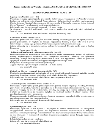 Zamek Królewski na Wawelu - MUZEALNE ZAJĘCIA EDUKACYJNE 2008/2009 SZKOŁY PODSTAWOWE: KLASY I-IV Legendy wawelskie (dla klas I – III) Uczestnicy poznają pojęcia: legenda, gród i źródło historyczne, dowiadują się o roli Wawelu w historii Krakowa na podstawie podań i legend: Kopiec Krakusa i Rękawka, Smok wawelski i mądry szewczyk, Dzielna królewna Wanda, Podziemny zamek, Głowa wawelska, O Stańczyku, co nawet z królem żartował, Dzwon "Zygmunt". Na zakończenie krótki warsztat plastyczny. Zajęcia odbywają się w wybranych komnatach I i II piętra zamku. W miesiącach: wrzesień, październik, maj, czerwiec możliwe jest zakończenie lekcji zwiedzeniem Smoczej Jamy. • czas trwania 90 minut (120 minut z wejściem do Smoczej Jamy) Królowie na Wawelu (dla klas III i IV) Przystępnie przekazana rola Zamku jako mieszkania rodziny królewskiej; wygląd zewnętrzny budowli i podział pomieszczeń ze względu na funkcje; wyposażenie komnat, a także rola króla i dworu królewskiego to tematy tego spotkania. Omówiona zostaje również ceremonia koronacji. Zajęcia odbywają się w komnatach parteru, wybranych komnatach II piętra zamku oraz w Skarbcu Koronnym. • Czas trwania: 90 min. Królowie na Wawelu - życie codzienne w zamku (dla klas I-III) Prowadzący opowiada o codziennym życiu mieszkańców zamku renesansowego: królów, ich najbliższej rodziny, najważniejszych urzędników oraz dostojników dworskich. Omawiany jest apartament mieszkalny, funkcje poszczególnych pomieszczeń a także ich wyposażenie. Dzieci, na podstawie oglądanych zabytków muzealnych, poznają sposoby spędzania wolnego czasu. Lekcja może być wzbogacona warsztatem plastycznym. Zajęcia odbywają się w wybranych komnatach I i II piętra zamku • czas trwania 90 minut Królowie na Wawelu - ceremonie dworskie (dla klas I-III) Uczniowie poznają organizację najważniejszych uroczystości królewskich: koronacji, zaślubin, chrzcin, pogrzebów. Prowadzący omawia rolę i dzieje oznak władzy królewskiej (insygniów). Zajęcia odbywają się w wybranych salach Skarbca Koronnego oraz w Katedrze. • czas trwania 90 minut Taniec i muzyka na królewskim dworze (dla klas I – IV) Prowadzący, w przystępny sposób, przekazuje historię polskiej muzyki religijnej i świeckiej, tworzonej przy dworze królewskim. Uczestnicy dowiadują się o dawnych instrumentach muzycznych, uczą się je dzielić ze względu na sposób wydobywania dźwięku, zapoznają się z różnymi rodzajami utworów i tańców od średniowiecza do renesansu. Oglądają we wnętrzach zamkowych obrazy, tkaniny i fryzy przedstawiające muzyków i instrumenty. Urozmaiceniem zajęć jest kilkunastominutowa ilustracja muzyczna - wysłuchanie kilku utworów muzyki dawnej oraz zapoznanie się z elementami tańca. Zajęcia odbywają się w wybranych komnatach I i II piętra zamku • czas trwania 90 minut Rycerze i damy (dla klas I – IV) Prowadzący opowiada o roli rycerza i zwyczajach w okresie średniowiecza, ze szczególnym uwzględnieniem pasowania na rycerza. Na przykładach zabytków eksponowanych w Zbrojowni omawiane jest uzbrojenie (zbroje, różnorodna broń biała bojowa i turniejowa) oraz formy walki zarówno na polu bitwy, jak i w turniejowych szrankach. Uczestnicy poznają także postać damy, jej zajęcia i rolę w życiu rycerza. Lekcję kończy pokaz miecza i przyłbicy. Zajęcia odbywają się w wybranych salach Zbrojowni • czas trwania 60-90 minut Zamek Królewski na Wawelu - MUZEALNE ZAJĘCIA EDUKACYJNE 2008/2009 Wawelski świat zwierząt i roślin (dla klas I – IV) W trakcie zajęć uczniowie poznają historię ogrodów i zwierzyńca wawelskiego, stan wiedzy o przyrodzie (od starożytności do czasów renesansu). Na obrazach i arrasach odszukują zwierzęta i rośliny. Uczestniczą również w zabawach tematycznych. Zajęcia odbywają się w wybranych komnatach I i II piętra W okresie: maj-czerwiec oraz wrzesień-październik (przy dobrej pogodzie) zajęcia mogą być wzbogacone o spacer wzdłuż ogródka na dziedzińcu zewnętrznym. • czas trwania ok. 90 minut Przed namiotem wezyra (dla klas I – IV) Prowadzący opowiada o pięknie zdobionych namiotach tureckich ich funkcji i wyposażeniu (dywany, tkaniny ozdobne). Uczniowie zapoznają się ze sztuką aplikacji oraz symboliką przedstawień. Omawiana jest postać króla Jana III Sobieskiego oraz wezyra - funkcja jaką pełnił w tureckiej armii, jego ubiór i przynależne mu oznaki władzy. Lekcji towarzyszy warsztat plastyczny. Zajęcia odbywają się w wybranych salach na wystawie Sztuka Wschodu. • czas trwania 90 minut Opowieść o świętej Jadwidze królowej (dla klas I – IV) Uczniowie zapoznają się z pozostałościami Zamku i Katedry z okresu średniowiecza. Prowadzący opowiada legendy o św. Jadwidze oraz przypomina fakty historyczne związane z jej osobą - przybycie do Krakowa, jej koronację, początki panowania, przybycie Władysława Jagiełły, jego chrzest i ślub z Jadwigą. Zajęcia odbywają się w salach gotyckich Skarbca Koronnego oraz w Katedrze • czas trwania 90 minut Król Kazimierz Wielki i jego czasy (dla klas I – IV) W czasie zajęć uczniowie poznają postać króla Kazimierza i legendy z nią związane. Zapoznają się także z czasami w których żył, jego rolą w historii, dokonaniami politycznymi i gospodarczymi. Oglądają pozostałości średniowiecznego Zamku i Katedry. Dopełnieniem lekcji jest zabawa tematyczna (krzyżówka). Zajęcia prowadzone są w salach gotyckich Skarbca Koronnego oraz w Katedrze • czas trwania 90 minut Wawel legendarny i historyczny (dla klas IV) Tematem zajęć jest historia, rola i znaczenie dworu królewskiego dla naszego miasta i państwa. Czasy najdawniejsze uczniowie poznają poprzez legendy związane ze wzgórzem wawelskim, czasy nowożytne zaś przez określenie zadań pełnionych przez służbę dworską, przybliżenie postaci królów, omówienie wyposażenia oraz fun