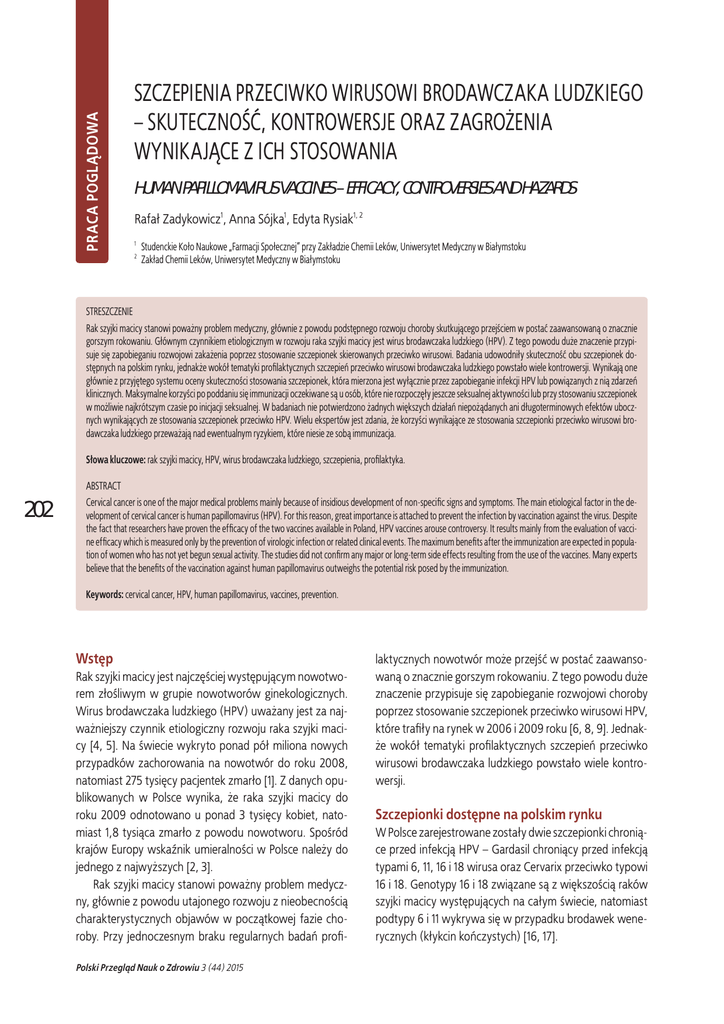 PRACA POGLĄDOWA SZCZEPIENIA PRZECIWKO WIRUSOWI BRODAWCZAKA LUDZKIEGO – SKUTECZNOŚĆ, KONTROWERSJE ORAZ ZAGROŻENIA WYNIKAJĄCE Z ICH STOSOWANIA HUMAN PAPILLOMAVIRUS VACCINES – EFFICACY, CONTROVERSIES AND HAZARDS Rafał Zadykowicz1, Anna Sójka1, Edyta Rysiak1, 2 1 2 Studenckie Koło Naukowe „Farmacji Społecznej” przy Zakładzie Chemii Leków, Uniwersytet Medyczny w Białymstoku Zakład Chemii Leków, Uniwersytet Medyczny w Białymstoku STRESZCZENIE Rak szyjki macicy stanowi poważny problem medyczny, głównie z powodu podstępnego rozwoju choroby skutkującego przejściem w postać zaawansowaną o znacznie gorszym rokowaniu. Głównym czynnikiem etiologicznym w rozwoju raka szyjki macicy jest wirus brodawczaka ludzkiego (HPV). Z tego powodu duże znaczenie przypisuje się zapobieganiu rozwojowi zakażenia poprzez stosowanie szczepionek skierowanych przeciwko wirusowi. Badania udowodniły skuteczność obu szczepionek dostępnych na polskim rynku, jednakże wokół tematyki profilaktycznych szczepień przeciwko wirusowi brodawczaka ludzkiego powstało wiele kontrowersji. Wynikają one głównie z przyjętego systemu oceny skuteczności stosowania szczepionek, która mierzona jest wyłącznie przez zapobieganie infekcji HPV lub powiązanych z nią zdarzeń klinicznych. Maksymalne korzyści po poddaniu się immunizacji oczekiwane są u osób, które nie rozpoczęły jeszcze seksualnej aktywności lub przy stosowaniu szczepionek w możliwie najkrótszym czasie po inicjacji seksualnej. W badaniach nie potwierdzono żadnych większych działań niepożądanych ani długoterminowych efektów ubocznych wynikających ze stosowania szczepionek przeciwko HPV. Wielu ekspertów jest zdania, że korzyści wynikające ze stosowania szczepionki przeciwko wirusowi brodawczaka ludzkiego przeważają nad ewentualnym ryzykiem, które niesie ze sobą immunizacja. Słowa kluczowe: rak szyjki macicy, HPV, wirus brodawczaka ludzkiego, szczepienia, profilaktyka. ABSTRACT 202 Cervical cancer is one of the major medical problems mainly because of insidious development of non-specific signs and symptoms. The main etiological factor in the development of cervical cancer is human papillomavirus (HPV). For this reason, great importance is attached to prevent the infection by vaccination against the virus. Despite the fact that researchers have proven the efficacy of the two vaccines available in Poland, HPV vaccines arouse controversy. It results mainly from the evaluation of vaccine efficacy which is measured only by the prevention of virologic infection or related clinical events. The maximum benefits after the immunization are expected in population of women who has not yet begun sexual activity. The studies did not confirm any major or long-term side effects resulting from the use of the vaccines. Many experts believe that the benefits of the vaccination against human papillomavirus outweighs the potential risk posed by the immunization. Keywords: cervical cancer, HPV, human papillomavirus, vaccines, prevention. Wstęp Rak szyjki macicy jest najczęściej występującym nowotworem złośliwym w grupie nowotworów ginekologicznych. Wirus brodawczaka ludzkiego (HPV) uważany jest za najważniejszy czynnik etiologiczny rozwoju raka szyjki macicy [4, 5]. Na świecie wykryto ponad pół miliona nowych przypadków zachorowania na nowotwór do roku 2008, natomiast 275 tysięcy pacjentek zmarło [1]. Z danych opublikowanych w Polsce wynika, że raka szyjki macicy do roku 2009 odnotowano u ponad 3 tysięcy kobiet, natomiast 1,8 tysiąca zmarło z powodu nowotworu. Spośród krajów Europy wskaźnik umieralności w Polsce należy do jednego z najwyższych [2, 3]. Rak szyjki macicy stanowi poważny problem medyczny, głównie z powodu utajonego rozwoju z nieobecnością charakterystycznych objawów w początkowej fazie choroby. Przy jednoczesnym braku regularnych badań profiPolski Przegląd Nauk o Zdrowiu 3 (44) 2015 laktycznych nowotwór może przejść w postać zaawansowaną o znacznie gorszym rokowaniu. Z tego powodu duże znaczenie przypisuje się zapobieganie rozwojowi choroby poprzez stosowanie szczepionek przeciwko wirusowi HPV, które trafiły na rynek w 2006 i 2009 roku [6, 8, 9]. Jednakże wokół tematyki profilaktycznych szczepień przeciwko wirusowi brodawczaka ludzkiego powstało wiele kontrowersji. Szczepionki dostępne na polskim rynku W Polsce zarejestrowane zostały dwie szczepionki chroniące przed infekcją HPV – Gardasil chroniący przed infekcją typami 6, 11, 16 i 18 wirusa oraz Cervarix przeciwko typowi 16 i 18. Genotypy 16 i 18 związane są z większością raków szyjki macicy występujących na całym świecie, natomiast podtypy 6 i 11 wykrywa się w przypadku brodawek wenerycznych (kłykcin kończystych) [16, 17]. Skuteczność W badaniach udowodniono skuteczność Gardasilu przeciw rozwojowi śródnabłonkowej neoplazji szyjki macicy (CIN) stopnia 2 i 3, gruczolakoraka in situ oraz raka szyjki macicy związanych z infekcją HPV 16 i HPV 18 pośród kobiet HPV-naiwnych [11, 14, 15]. Cervarix wykazał skuteczność przeciw rozwojowi CIN stopnia 2 i 3, raka in situ oraz raka szyjki macicy pośród HPV-naiwnych kobiet [12, 13]. Nie istnieją dowody na to, że którakolwiek ze szczepionek przeciwko infekcji HPV zmienia przebieg zakażenia obecnego przed immunizacją. Dane te wzmacniają przekonanie o stosowaniu szczepionki przeciwko wirusowi brodawczaka ludzkiego w celu zapobiegania infekcji, a nie w leczeniu wcześniej istniejącego zakażenia HPV i chorób z nim związanych [10]. Maksymalne korzyści po poddaniu się immunizacji oczekiwane są zatem u osób, które nie rozpoczęły jeszcze seksualnej aktywności lub przy stosowaniu szczepionek w możliwie najkrótszym czasie po inicjacji seksualnej [18]. Kontrowersje Kontrowersje związane z poddaniem się immunizacji wynikają głównie z przyjętego systemu oceny skuteczności stosowania szczepionek w zapobieganiu infekcji HPV. Sk