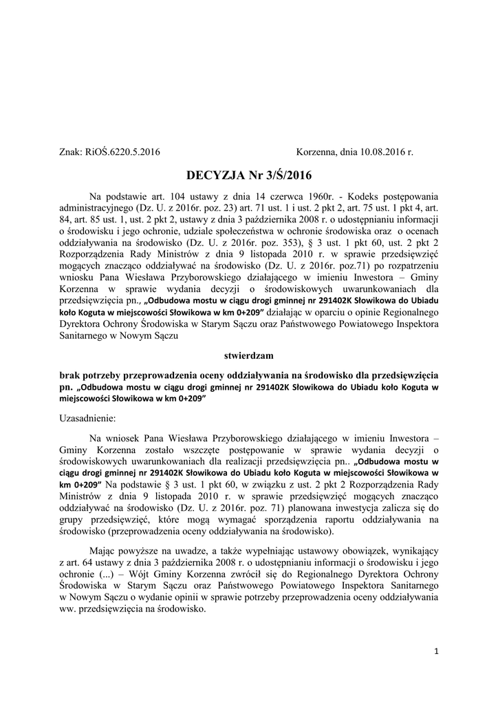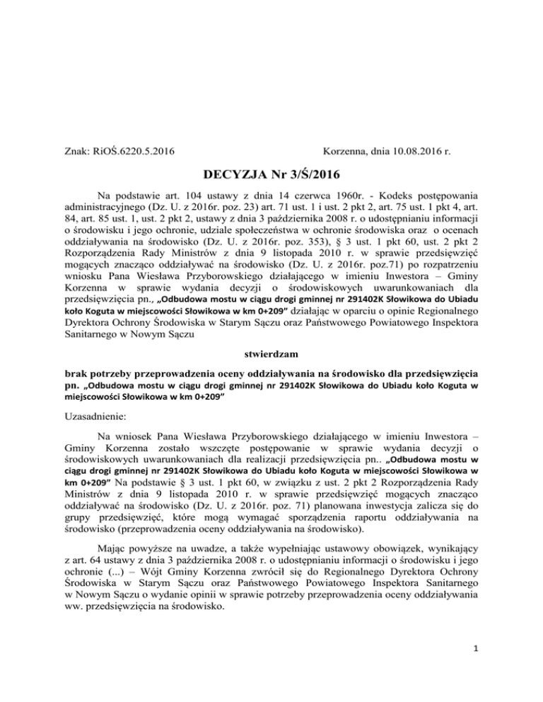 Znak: RiOŚ.6220.5.2016 Korzenna, dnia 10.08.2016 r. DECYZJA Nr 3/Ś/2016 Na podstawie art. 104 ustawy z dnia 14 czerwca 1960r. - Kodeks postępowania administracyjnego (Dz. U. z 2016r. poz. 23) art. 71 ust. 1 i ust. 2 pkt 2, art. 75 ust. 1 pkt 4, art. 84, art. 85 ust. 1, ust. 2 pkt 2, ustawy z dnia 3 października 2008 r. o udostępnianiu informacji o środowisku i jego ochronie, udziale społeczeństwa w ochronie środowiska oraz o ocenach oddziaływania na środowisko (Dz. U. z 2016r. poz. 353), § 3 ust. 1 pkt 60, ust. 2 pkt 2 Rozporządzenia Rady Ministrów z dnia 9 listopada 2010 r. w sprawie przedsięwzięć mogących znacząco oddziaływać na środowisko (Dz. U. z 2016r. poz.71) po rozpatrzeniu wniosku Pana Wiesława Przyborowskiego działającego w imieniu Inwestora – Gminy Korzenna w sprawie wydania decyzji o środowiskowych uwarunkowaniach dla przedsięwzięcia pn., „Odbudowa mostu w ciągu drogi gminnej nr 291402K Słowikowa do Ubiadu koło Koguta w miejscowości Słowikowa w km 0+209” działając w oparciu o opinie Regionalnego Dyrektora Ochrony Środowiska w Starym Sączu oraz Państwowego Powiatowego Inspektora Sanitarnego w Nowym Sączu stwierdzam brak potrzeby przeprowadzenia oceny oddziaływania na środowisko dla przedsięwzięcia pn. „Odbudowa mostu w ciągu drogi gminnej nr 291402K Słowikowa do Ubiadu koło Koguta w miejscowości Słowikowa w km 0+209” Uzasadnienie: Na wniosek Pana Wiesława Przyborowskiego działającego w imieniu Inwestora – Gminy Korzenna zostało wszczęte postępowanie w sprawie wydania decyzji o środowiskowych uwarunkowaniach dla realizacji przedsięwzięcia pn. . „Odbudowa mostu w ciągu drogi gminnej nr 291402K Słowikowa do Ubiadu koło Koguta w miejscowości Słowikowa w km 0+209” Na podstawie § 3 ust. 1 pkt 60, w związku z ust. 2 pkt 2 Rozporządzenia Rady Ministrów z dnia 9 listopada 2010 r. w sprawie przedsięwzięć mogących znacząco oddziaływać na środowisko (Dz. U. z 2016r. poz. 71) planowana inwestycja zalicza się do grupy przedsięwzięć, które mogą wymagać sporządzenia raportu oddziaływania na środowisko (przeprowadzenia oceny oddziaływania na środowisko). Mając powyższe na uwadze, a także wypełniając ustawowy obowiązek, wynikający z art. 64 ustawy z dnia 3 października 2008 r. o udostępnianiu informacji o środowisku i jego ochronie (...) – Wójt Gminy Korzenna zwrócił się do Regionalnego Dyrektora Ochrony Środowiska w Starym Sączu oraz Państwowego Powiatowego Inspektora Sanitarnego w Nowym Sączu o wydanie opinii w sprawie potrzeby przeprowadzenia oceny oddziaływania ww. przedsięwzięcia na środowisko. 1 Państwowy Powiatowy Inspektor Sanitarny w Nowym Sączu opinią sanitarną nr 260/16 z dnia 15.07.2016 r. znak: PSE-NNZ-420-187/16 uznał, że planowana inwestycja nie wymaga przeprowadzenia oceny oddziaływania ww. przedsięwzięcia na środowisko. Według Regionalnego Dyrektora Ochrony Środowiska w Starym Sączu, który wydał opinię z dnia 20.07.2016 r. znak: ST-II.4240.95.2016.PL przeprowadzenie oceny oddziaływania przedmiotowego przedsięwzięcia na środowisko również nie jest konieczne. Po przeprowadzeniu analizy karty informacyjnej przedsięwzięcia w odniesieniu do wydanych opinii Inspektora Sanitarnego oraz Regionalnego Dyrektora Ochrony Środowiska, a w szczególności mając na uwadze uwarunkowania wynikające z art. 63 ust. 1 ustawy z dnia 3 października 2008 r. o udostępnianiu informacji o środowisku i jego ochronie, udziale społeczeństwa w ochronie środowiska oraz o ocenach oddziaływania na środowisko, Wójt Gminy Korzenna wydał w dniu 03.08.2016 r. postanowienie znak: RiOŚ.6220.5.2016 stwierdzające brak potrzeby przeprowadzenia oceny oddziaływania przedsięwzięcia na środowisko, a tym samym brak obowiązku sporządzenia raportu oddziaływania na środowisko. Stwierdzony w postanowieniu brak obowiązku przeprowadzenia oceny oddziaływania przedsięwzięcia na środowisko wynika ze szczegółowej analizy następujących uwarunkowań: 1. Rodzaju i charakterystyki przedsięwzięcia Planowane przedsięwzięcie polegać będzie na budowie nowego obiektu mostowego stanowiącego przeprawę przez potok Niwianka w ciągu drogi gminnej nr 291402K Słowikowa do Ubiadu koło Koguta w miejscowości Słowikowa o nawierzchni asfaltowej. Nowy most zastąpi most istniejący przeznaczony do rozbiórki, który został uszkodzony przez powódź i nie nadaje się do dalszej eksploatacji. Przedmiotowe przedsięwzięcie obejmuje zakres prac: rozbiórka istniejącego mostu, budowa nowego obiektu, korekta sytuacyjna i wysokościowa dojazdów do mostu celem dostosowania do nowej geometrii mostu, umocnienie brzegów i dna w rejonie mostu za pomocą budowli kamiennych i siatkowo – kamiennych. Wykonanie prac rozbiórkowych i budowlanych wymagać będzie usuwania drzew i krzewów. Planowane do wycinki drzewa to: 2 szt. wierzby o obwodzie pnia na wysokości pierśnicy 80 cm i 35 cm, 1 szt. jesion o obwodzie pnia 25 cm, jedna olsza szara o obwodzie pnia 15 cm. Poza tym planowane jest usuwanie drzew i krzewów w fazie nalotu i podrostu, w tym wierzb z powierzchni 150 m2, bzów czarnych z powierzchni 10 m2. Na czas wykonywania prac odcinki drogi gminnej przylegające do mostu będą zamknięte dla ruchu. Objazdy prowadzone będą po istniejących drogach publicznych. Zaplecze budowy zlokalizowane będzie na zamkniętym dla ruchu odcinku drogi gminnej w obrębie pasa drogowego. Realizowane przedsięwzięcie z uwagi na jego lokalizację i zakres jak również przewidywany stosunkowo krótki czas realizacji, nie będzie wymagało budowy tymczasowego mostu objazdowego ani też objazdów tymczasowych. Na czas budowy odcinek drogi 291402K w km 0+180 do 0+240 będzie zamknięty dla ruchu drogowego. Objazdy odbywać się będą istniejącymi drogami lokalnymi. 2. Usytuowania przedsięwzięcia z uwzględnieniem możliwego zagrożenia dla środowiska Planowane przedsięwzięcie usy
