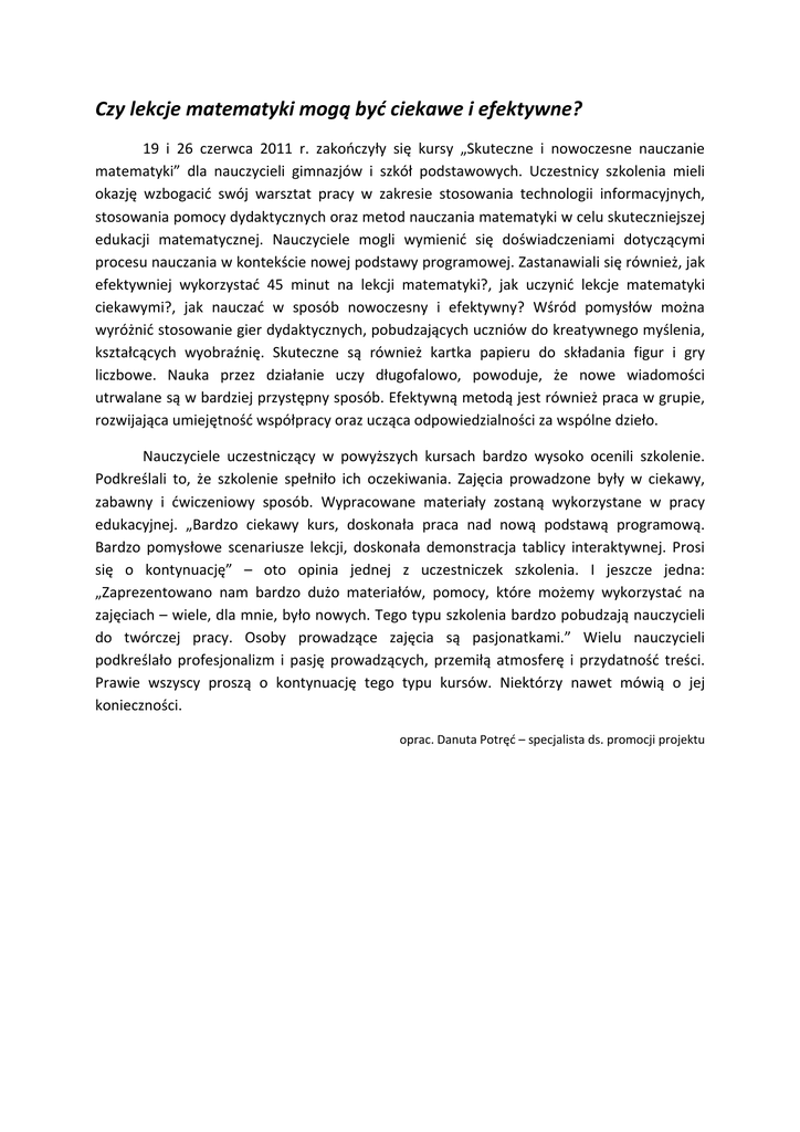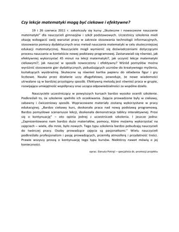 Czy lekcje matematyki mogą być ciekawe i efektywne? 19 i 26 czerwca 2011 r. zakończyły się kursy „Skuteczne i nowoczesne nauczanie matematyki” dla nauczycieli gimnazjów i szkół podstawowych. Uczestnicy szkolenia mieli okazję wzbogacić swój warsztat pracy w zakresie stosowania technologii informacyjnych, stosowania pomocy dydaktycznych oraz metod nauczania matematyki w celu skuteczniejszej edukacji matematycznej. Nauczyciele mogli wymienić się doświadczeniami dotyczącymi procesu nauczania w kontekście nowej podstawy programowej. Zastanawiali się również, jak efektywniej wykorzystać 45 minut na lekcji matematyki?, jak uczynić lekcje matematyki ciekawymi?, jak nauczać w sposób nowoczesny i efektywny? Wśród pomysłów można wyróżnić stosowanie gier dydaktycznych, pobudzających uczniów do kreatywnego myślenia, kształcących wyobraźnię. Skuteczne są również kartka papieru do składania figur i gry liczbowe. Nauka przez działanie uczy długofalowo, powoduje, że nowe wiadomości utrwalane są w bardziej przystępny sposób. Efektywną metodą jest również praca w grupie, rozwijająca umiejętność współpracy oraz ucząca odpowiedzialności za wspólne dzieło. Nauczyciele uczestniczący w powyższych kursach bardzo wysoko ocenili szkolenie. Podkreślali to, że szkolenie spełniło ich oczekiwania. Zajęcia prowadzone były w ciekawy, zabawny i ćwiczeniowy sposób. Wypracowane materiały zostaną wykorzystane w pracy edukacyjnej. „Bardzo ciekawy kurs, doskonała praca nad nową podstawą programową. Bardzo pomysłowe scenariusze lekcji, doskonała demonstracja tablicy interaktywnej. Prosi się o kontynuację” – oto opinia jednej z uczestniczek szkolenia. I jeszcze jedna: „Zaprezentowano nam bardzo dużo materiałów, pomocy, które możemy wykorzystać na zajęciach – wiele, dla mnie, było nowych. Tego typu szkolenia bardzo pobudzają nauczycieli do twórczej pracy. Osoby prowadzące zajęcia są pasjonatkami.” Wielu nauczycieli podkreślało profesjonalizm i pasję prowadzących, przemiłą atmosferę i przydatność treści. Prawie wszyscy proszą o kontynuację tego typu kursów. Niektórzy nawet mówią o jej konieczności. oprac. Danuta Potręć – specjalista ds. promocji projektu