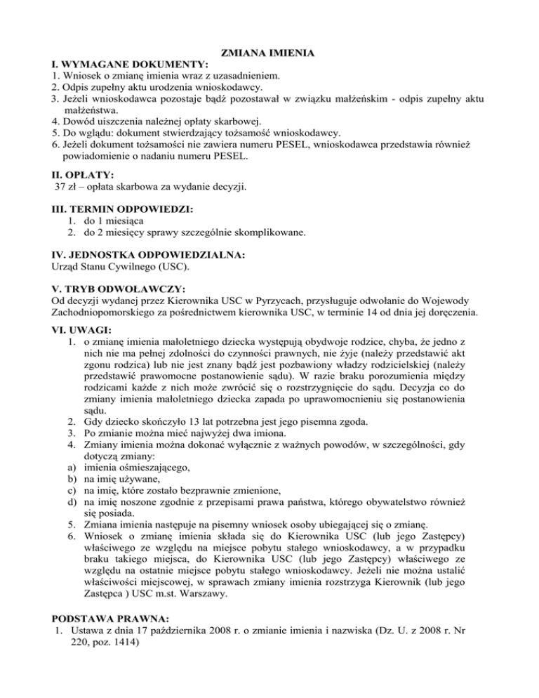 ZMIANA IMIENIA I. WYMAGANE DOKUMENTY: 1