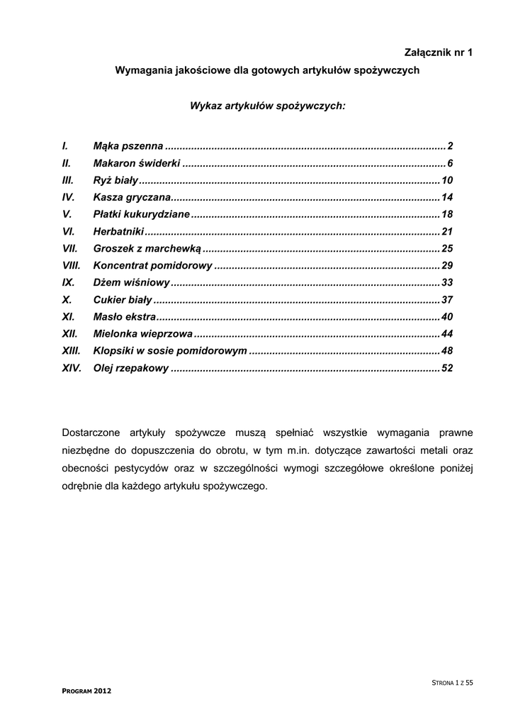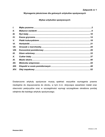 Załącznik nr 1 Wymagania jakościowe dla gotowych artykułów spożywczych Wykaz artykułów spożywczych: I. Mąka pszenna .................................................................................................2 II. Makaron świderki ...........................................................................................6 III. Ryż biały ........................................................................................................10 IV. Kasza gryczana.............................................................................................14 V. Płatki kukurydziane ......................................................................................18 VI. Herbatniki ......................................................................................................21 VII. Groszek z marchewką ..................................................................................25 VIII. Koncentrat pomidorowy ..............................................................................29 IX. Dżem wiśniowy .............................................................................................33 X. Cukier biały ...................................................................................................37 XI. Masło ekstra..................................................................................................40 XII. Mielonka wieprzowa .....................................................................................44 XIII. Klopsiki w sosie pomidorowym ..................................................................48 XIV. Olej rzepakowy .............................................................................................52 Dostarczone artykuły spożywcze muszą spełniać wszystkie wymagania prawne niezbędne do dopuszczenia do obrotu, w tym m.in. dotyczące zawartości metali oraz obecności pestycydów oraz w szczególności wymogi szczegółowe określone poniżej odrębnie dla każdego artykułu spożywczego. STRONA 1 Z 55 PROGRAM 2012 I. Mąka pszenna Kod PKWiU 10.61.21 I.1. Wymagania ogólne Mąka pszenna typ 450 „Pięćsetka” – mąka z przerobu całego ziarna, ewentualnie częściowo obłuszczonego, zawierająca wszystkie jego składniki łącznie z zarodkiem. I.2. Wymagania szczegółowe Wymagania organoleptyczne i fizykochemiczne Lp. 1. Cecha Cechy organoleptyczne A. Barwa B. Smak C. Zapach 2. Wilgotność, % nie więcej niż 3. Zawartość popiołu całkowitego, %, nie więcej niż Ilość glutenu, %, nie mniej niż Rozpływalność glutenu, mm, nie więcej niż Liczba opadania, sekundy, nie mniej niż 4. 5. 6. 7. 8. 9. 10. Stopień rozdrobnienia – przesiew przez sito opięte gazą młyńską o wielkości pierwiastka kwadratowego z prześwitu 265 μm, %, nie mniej niż Stopień rozdrobnienia – przesiew przez sito opięte gazą młyńską o wielkości pierwiastka kwadratowego z prześwitu 150 μm, %, nie mniej niż Obecność zanieczyszczeń organicznych i nieorganicznych Obecność szkodników zbożowo – mącznych i innych oraz ich pozostałości Wymagania A. Biała z odcieniem żółtym B. Swoisty, smak inny Metody badań PN-A-74013:1964 niedopuszczalny C. Swoisty, zapach inny niedopuszczalny 15,0 PN-ISO 712:2002 PN-EN ISO 712:2009 0,50 PN- ISO 2171:1994 PN-EN ISO 2171:2010 25 PN-A-74041:1977 9 PN-A-74041:1977 220 PN-ISO 3093:2007 + AC:2009 PN-EN ISO 3093:2010 99 PN-A-74015:1973 70 Niedopuszczalna PN-A-74016:1974 Niedopuszczalna PN-A-74016:1974 STRONA 2 Z 55 PROGRAM 2012 I.3. Opakowania I.3.1. Wymagania dla opakowań jednostkowych Mąka pszenna powinna być pakowana w 1 kilogramowe torebki papierowe jedno-lub dwuwarstwowe uznane przez upoważnione placówki badawcze do pakowania przetworów zbożowych, przetworów z grochu oraz makaronu. Materiały opakowaniowe i opakowania powinny być czyste, suche, bez uszkodzeń mechanicznych, wolne od szkodników oraz obcych zapachów, zapewniające właściwą jakość i trwałość wyrobu. Wszystkie materiały opakowaniowe oraz gotowe opakowania przeznaczone do bezpośredniego kontaktu z żywnością powinny mieć odpowiednie atesty. Opakowania powinny być estetycznie zadrukowane, prawidłowo oznakowane i prawidłowo zamknięte. Materiały opakowaniowe i opakowania powinny być przechowywane w warunkach nieobniżających ich jakości, a przed użyciem sprawdzone pod względem uszkodzeń, czystości i zapachu. I.3.2. Wymagania dla opakowań transportowych Mąka pszenna w 1 kilogramowych opakowaniach jednostkowych powinna być zapakowana w opakowania transportowe wykonane z folii przezroczystej zawierające 10 opakowań jednostkowych, zabezpieczone przed otwarciem. Łączna masa mąki pszennej na palecie nie może przekraczać 880 kg. I.3.3. Znakowanie Opakowania jednostkowe oraz transportowe powinny być czytelnie oznakowane zgodnie z obowiązującymi przepisami oraz zawierać: 1) informację o nazwie produktu „Mąka pszenna”, 2) na pasku w kolorze zielonym nadruk „Pomoc UE”, 3) nadruk – „Dostarczona w ramach programu pomocy żywnościowej”, 4) nadruk – „Artykuł nie jest przeznaczony do sprzedaży”. Dodatkowo na opakowaniach jednostkowych powinny być umieszczone czytelne napisy zawierające, co najmniej: a) datę minimalnej trwałości wyrażoną cyfrowo i poprzedzoną słowami „Najlepiej spożyć przed końcem .............…….....” podając miesiąc i rok, b) zawartość netto wyrażoną w jednostkach masy, c) nazwę i adres producenta, STRONA 3 Z 55 PROGRAM 2012 d) nazwę i adres podmiotu gospodarczego paczkującego (jeśli podmiotem tym nie jest producent), e) kraj pochodzenia, f) oznaczenie partii produkcyjnej umożliwiające identyfikację artykułu, g) wartość odżywczą. Dodatkowo na opakowaniach transportowych powinny być umieszczone czytelne napisy, zawierające, co najmniej: a) datę minimalnej trwałości wyrażoną cyfrowo i poprzedzoną słowami „Najlepiej spożyć przed końcem …….” podając miesiąc i rok