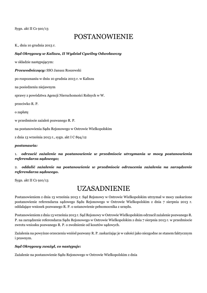 Sygn. akt II Cz 910/13 POSTANOWIENIE K., dnia 10 grudnia 2013 r. Sąd Okręgowy w Kaliszu, II Wydział Cywilny Odwoławczy w składzie następującym: Przewodniczący: SSO Janusz Roszewski po rozpoznaniu w dniu 10 grudnia 2013 r. w Kaliszu na posiedzeniu niejawnym sprawy z powództwa Agencji Nieruchomości Rolnych w W. przeciwko R. P. o zapłatę w przedmiocie zażaleń pozwanego R. P. na postanowienia Sądu Rejonowego w Ostrowie Wielkopolskim z dnia 13 września 2013 r., sygn. akt I C 894/12 postanawia: 1. odrzucić zażalenie na postanowienie w przedmiocie utrzymania w mocy postanowienia referendarza sądowego; 2. oddalić zażalenie na postanowienie w przedmiocie odrzucenia zażalenia na zarządzenie referendarza sądowego. Sygn. akt II Cz 910/13 UZASADNIENIE Postanowieniem z dnia 13 września 2013 r. Sąd Rejonowy w Ostrowie Wielkopolskim utrzymał w mocy zaskarżone postanowienie referendarza sądowego Sądu Rejonowego w Ostrowie Wielkopolskim z dnia 7 sierpnia 2013 r. oddalające wniosek pozwanego R. P. o ustanowienie pełnomocnika z urzędu. Postanowieniem z dnia 13 września 2013 r. Sąd Rejonowy w Ostrowie Wielkopolskim odrzucił zażalenie pozwanego R. P. na zarządzenie referendarza Sądu Rejonowego w Ostrowie Wielkopolskim z dnia 7 sierpnia 2013 r. w przedmiocie zwrotu wniosku pozwanego R. P. o zwolnienie od kosztów sądowych. Zażalenia na powyższe orzeczenia wniósł pozwany R. P. zaskarżając je w całości jako niezgodne ze stanem faktycznym i prawnym. Sąd Okręgowy zważył, co następuje: Zażalenie na postanowienie Sądu Rejonowego w Ostrowie Wielkopolskim z dnia 13 września 2013 r. utrzymujące w mocy postanowienie referendarza sądowego Sądu Rejonowego w Ostrowie Wielkopolskim z dnia 7 sierpnia 2013 r. w przedmiocie oddalenia wniosku pozwanego R. P. o ustanowienie pełnomocnika z urzędu podlega odrzuceniu. W myśl art. 370 k.p.c. i 373 k.p.c. w zw. z art. 397 § 2 k.p.c. sąd drugiej instancji odrzuca zażalenie, jeżeli ulegało ona odrzuceniu przez sąd pierwszej instancji, m.in. z powodu jego niedopuszczalności. Zgodnie z art. 398 23 k.p.c. sąd rozpoznający skargę na postanowienie referendarza w przedmiocie odmowy ustanowienia adwokata lub radcy prawnego orzeka jako sąd drugiej instancji, stosując odpowiednio przepisy o zażaleniu. Oznacza to, że postanowienie sądu w tym przedmiocie nie podlega zaskarżeniu, gdyż ma charakter orzeczenia drugoinstancyjnego. Z uwagi na powyższe zażalenie pozwanego R. P. podlegało odrzuceniu jako niedopuszczalne, o czym - na podstawie powołanych przepisów - Sąd Okręgowy orzekł jak w punkcie 1 sentencji postanowienia. Zażalenie na postanowieniem Sądu Rejonowego w Ostrowie Wielkopolskim z dnia 13 września 2013 r. odrzucające zażalenie pozwanego R. P. na zarządzenie referendarza Sądu Rejonowego w Ostrowie Wielkopolskim z dnia 7 sierpnia 2013 r. w przedmiocie zwrotu wniosku pozwanego R. P. o zwolnienie od kosztów sądowych nie zasługuje na uwzględnienie. Jak słusznie wskazał Sąd Rejonowy, z art. 394 § 1 k.p.c. wynika, że do sądu drugiej instancji przysługuje zażalenie jedynie na postanowienia sądu pierwszej instancji kończące postępowanie w sprawie oraz wymienione enumeratywnie w 394 § 1 pkt 1 – 12 k.p.c. Rację ma Sąd Rejonowy, że zarządzenie o zwrocie wniosku o zwolnienie od kosztów sądowych nie należy do żadnej z tych kategorii, jak również jego zaskarżalność nie jest przewidziana przez jakikolwiek przepis szczególny. W tym stanie rzeczy Sąd Rejonowy trafnie uznał, że przedmiotowe zarządzenie nie podlega zaskarżeniu, a zatem zażalenie pozwanego R. P. na przedmiotowe zarządzenie – na podstawie art. 370 k.p.c. w zw. z art. 397 § 2 k.p.c. należało odrzucić jako niedopuszczalne. Mając na uwadze powyższe, Sąd Okręgowy na podstawie art. 385 k.p.c. w zw. z art. 397 § 2 k.p.c. orzekł jak w punkcie 2 sentencji postanowienia.