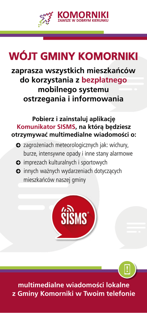 WÓJT GMINY KOMORNIKI zaprasza wszystkich mieszkańców do korzystania z bezpłatnego mobilnego systemu ostrzegania i informowania Pobierz i zainstaluj aplikację Komunikator SISMS, na którą będziesz otrzymywać multimedialne wiadomości o: zagrożeniach meteorologicznych jak: wichury, burze, intensywne opady i inne stany alarmowe imprezach kulturalnych i sportowych innych ważnych wydarzeniach dotyczących mieszkańców naszej gminy ! multimedialne wiadomości lokalne z Gminy Komorniki w Twoim telefonie Bezpłatna aplikacja dla mieszkańców! Komunikator SISMS Aplikacja Komunikator SISMS przeznaczona jest dla posiadaczy telefonów typu smartfon. Dzięki aplikacji będziesz otrzymywać rozszerzone powiadomienia z Urzędu Gminy w Komornikach. Do wiadomości mogą być dołączone zdjęcia, filmy, pliki audio. 1. Pobierz za darmo aplikację z oficjalnych platform dystrybucyjnych (dla smartfonów z systemem Android lub iOS). 2.Wyszukaj w dostępnej liście Komunikatora interesujący Cię serwis informacyjny i zapisz się w nim. 3.Od tej pory będziesz otrzymywać najważniejsze i ciekawe informacje z Urzędu Gminy w postaci wiadomości SMS Cloud. 4. Jeśli chcesz wyrejestrować się z systemu, wejdź w aplikacji w USTAWIENIA i naciśnij przycisk WYREJESTRUJ. POBIERZ Z App Store POBIERZ Z Google Play Usługa jest świadczona przez SISMS Sp. z o.o. na rzecz Użytkownika na podstawie Umowy zawartej z Gminą Komorniki. Aby korzystać z systemu należy zaakceptować Regulamin dostępny w aplikacji i na stronie: www.sisms.pl/regulaminy.