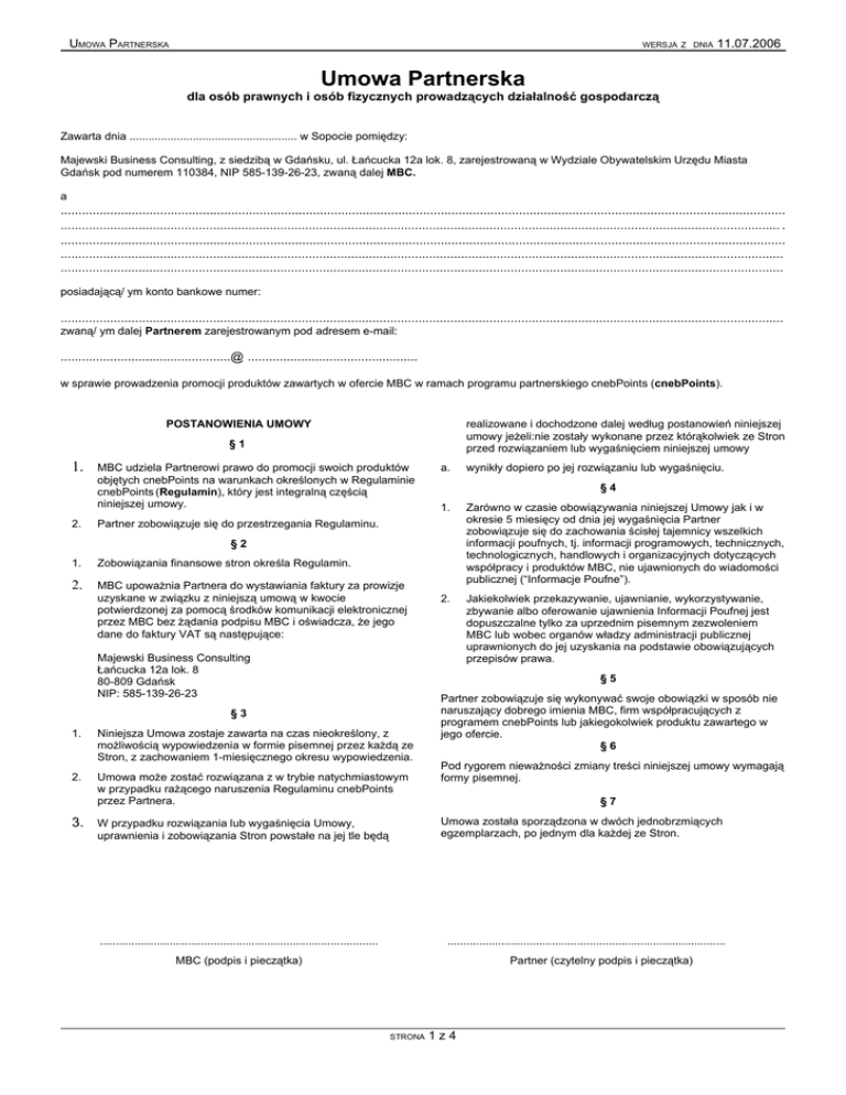 UMOWA PARTNERSKA WERSJA Z DNIA 11.07.2006 Umowa Partnerska dla osób prawnych i osób fizycznych prowadzących działalność gospodarczą Zawarta dnia ..................................................... w Sopocie pomiędzy: Majewski Business Consulting, z siedzibą w Gdańsku, ul. Łańcucka 12a lok. 8, zarejestrowaną w Wydziale Obywatelskim Urzędu Miasta Gdańsk pod numerem 110384, NIP 585-139-26-23, zwaną dalej MBC. a ............................................................................................................................................................................................................ ........................................................................................................................................................................................................... . ............................................................................................................................................................................................................ ............................................................................................................................................................................................................ ............................................................................................................................................................................................................ posiadającą/ ym konto bankowe numer: ............................................................................................................................................................................................................ zwaną/ ym dalej Partnerem zarejestrowanym pod adresem e-mail: ................................................@ ................................................ w sprawie prowadzenia promocji produktów zawartych w ofercie MBC w ramach programu partnerskiego cnebPoints (cnebPoints). POSTANOWIENIA UMOWY realizowane i dochodzone dalej według postanowień niniejszej umowy jeżeli:nie zostały wykonane przez którąkolwiek ze Stron przed rozwiązaniem lub wygaśnięciem niniejszej umowy §1 1. 2. MBC udziela Partnerowi prawo do promocji swoich produktów objętych cnebPoints na warunkach określonych w Regulaminie cnebPoints (Regulamin), który jest integralną częścią niniejszej umowy. a. §4 1. Zarówno w czasie obowiązywania niniejszej Umowy jak i w okresie 5 miesięcy od dnia jej wygaśnięcia Partner zobowiązuje się do zachowania ścisłej tajemnicy wszelkich informacji poufnych, tj. informacji programowych, technicznych, technologicznych, handlowych i organizacyjnych dotyczących współpracy i produktów MBC, nie ujawnionych do wiadomości publicznej (“Informacje Poufne”). 2. Jakiekolwiek przekazywanie, ujawnianie, wykorzystywanie, zbywanie albo oferowanie ujawnienia Informacji Poufnej jest dopuszczalne tylko za uprzednim pisemnym zezwoleniem MBC lub wobec organów władzy administracji publicznej uprawnionych do jej uzyskania na podstawie obowiązujących przepisów prawa. Partner zobowiązuje się do przestrzegania Regulaminu. §2 1. Zobowiązania finansowe stron określa Regulamin. 2. MBC upoważnia Partnera do wystawiania faktury za prowizje uzyskane w związku z niniejszą umową w kwocie potwierdzonej za pomocą środków komunikacji elektronicznej przez MBC bez żądania podpisu MBC i oświadcza, że jego dane do faktury VAT są następujące: Majewski Business Consulting Łańcucka 12a lok. 8 80-809 Gdańsk NIP: 585-139-26-23 §5 §3 1. Niniejsza Umowa zostaje zawarta na czas nieokreślony, z możliwością wypowiedzenia w formie pisemnej przez każdą ze Stron, z zachowaniem 1-miesięcznego okresu wypowiedzenia. 2. Umowa może zostać rozwiązana z w trybie natychmiastowym w przypadku rażącego naruszenia Regulaminu cnebPoints przez Partnera. 3. wynikły dopiero po jej rozwiązaniu lub wygaśnięciu. Partner zobowiązuje się wykonywać swoje obowiązki w sposób nie naruszający dobrego imienia MBC, firm współpracujących z programem cnebPoints lub jakiegokolwiek produktu zawartego w jego ofercie. §6 Pod rygorem nieważności zmiany treści niniejszej umowy wymagają formy pisemnej. §7 Umowa została sporządzona w dwóch jednobrzmiących egzemplarzach, po jednym dla każdej ze Stron. W przypadku rozwiązania lub wygaśnięcia Umowy, uprawnienia i zobowiązania Stron powstałe na jej tle będą ........................................................................................ ........................................................................................ MBC (podpis i pieczątka) Partner (czytelny podpis i pieczątka) STRONA 1z4 UMOWA PARTNERSKA WERSJA Z DNIA 11.07.2006 Regulamin cnebPoints dla osób prawnych i osób fizycznych prowadzących działalność gospodarczą Poniższy Regulamin zawiera zestaw zasad obowiązujących wszystkich Partnerów programu partnerskiego organizowanego przez Majewski Business Consulting (MBC), zwanego dalej cnebPoints. 4. Partner ma prawo promować korzyści związane z cnebPoints w celu budowania swojej grupy partnerów. 5. Stan konta partnera zawierający sumę należnych prowizji znajduje się w Panelu cnebPoints do którego kieruje Adres Panelu 6. Partner nie jest wynagradzany za własne zakupy, tzn. dokonywane z użyciem jego danych identyfikacyjnych zapisanych w bazie danych partnerów cnebPoints. Od tej zasady MBC może robić wyjątki. 7. Partner może wypłacić skumulowane na swoim koncie prowizje, jeśli ich wartość przekroczy 50 PLN. Partner w tym celu wystawi MBC fakturę na odpowiednią kwotę. Ponadto stan konta będzie wypłacany Partnerowi w grudniu każdego roku. 8. Warunkiem wypłacenia prowizji jest dostarczenie do MBC podpisanych i prawidłowo wypełnionych Umowy w dwóch egzemplarzach i Regulamin w jednym egzemplarzu. Prowizje będą naliczane Partnerowi niezależnie od faktu spełnienia tego warunku. MBC zamierza sprzed