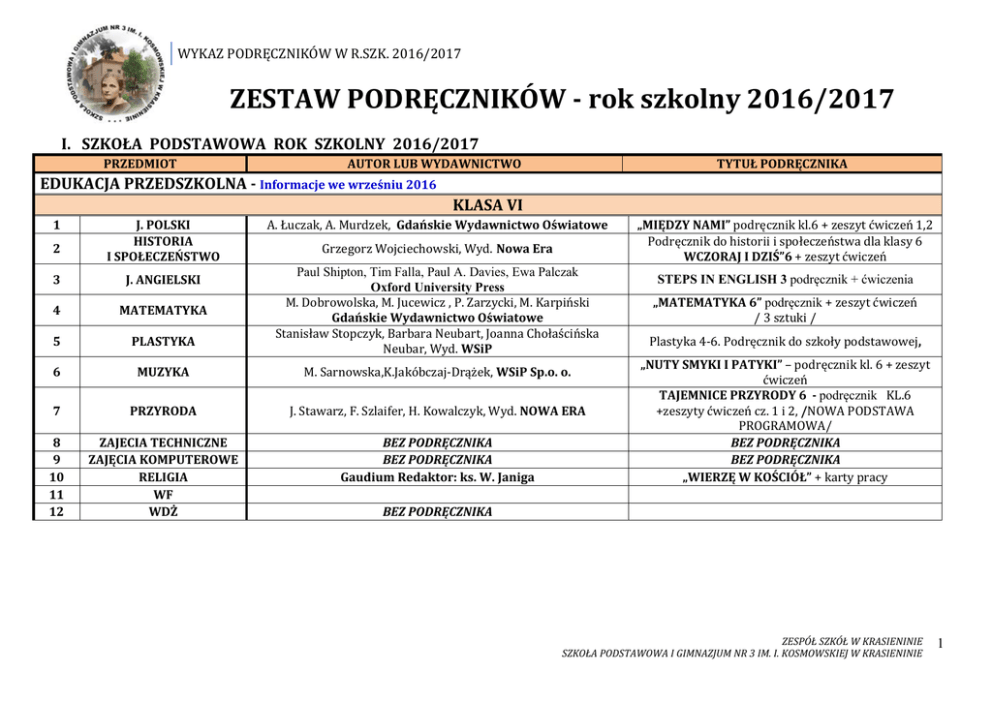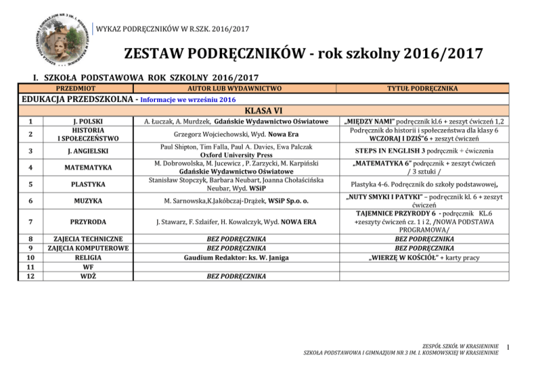 WYKAZ PODRĘCZNIKÓW W R.SZK. 2016/2017 ZESTAW PODRĘCZNIKÓW - rok szkolny 2016/2017 I. SZKOŁA PODSTAWOWA ROK SZKOLNY 2016/2017 PRZEDMIOT AUTOR LUB WYDAWNICTWO TYTUŁ PODRĘCZNIKA EDUKACJA PRZEDSZKOLNA - Informacje we wrześniu 2016 KLASA VI 1 J. POLSKI HISTORIA I SPOŁECZEŃSTWO A. Łuczak, A. Murdzek, Gdańskie Wydawnictwo Oświatowe 3 J. ANGIELSKI 4 MATEMATYKA 5 PLASTYKA Paul Shipton, Tim Falla, Paul A. Davies, Ewa Palczak Oxford University Press M. Dobrowolska, M. Jucewicz , P. Zarzycki, M. Karpiński Gdańskie Wydawnictwo Oświatowe Stanisław Stopczyk, Barbara Neubart, Joanna Chołaścińska Neubar, Wyd. WSiP 6 MUZYKA M. Sarnowska,K.Jakóbczaj-Drążek, WSiP Sp.o. o. 7 PRZYRODA J. Stawarz, F. Szlaifer, H. Kowalczyk, Wyd. NOWA ERA 8 9 10 11 12 ZAJECIA TECHNICZNE ZAJĘCIA KOMPUTEROWE RELIGIA WF WDŻ BEZ PODRĘCZNIKA BEZ PODRĘCZNIKA Gaudium Redaktor: ks. W. Janiga 2 Grzegorz Wojciechowski, Wyd. Nowa Era „MIĘDZY NAMI” podręcznik kl.6 + zeszyt ćwiczeń 1,2 Podręcznik do historii i społeczeństwa dla klasy 6 WCZORAJ I DZIŚ”6 + zeszyt ćwiczeń STEPS IN ENGLISH 3 podręcznik + ćwiczenia „MATEMATYKA 6” podręcznik + zeszyt ćwiczeń / 3 sztuki / Plastyka 4-6. Podręcznik do szkoły podstawowej, „NUTY SMYKI I PATYKI” – podręcznik kl. 6 + zeszyt ćwiczeń TAJEMNICE PRZYRODY 6 - podręcznik KL.6 +zeszyty ćwiczeń cz. 1 i 2, /NOWA PODSTAWA PROGRAMOWA/ BEZ PODRĘCZNIKA BEZ PODRĘCZNIKA „WIERZĘ W KOŚCIÓŁ” + karty pracy BEZ PODRĘCZNIKA ZESPÓŁ SZKÓŁ W KRASIENINIE SZKOŁA PODSTAWOWA I GIMNAZJUM NR 3 IM. I. KOSMOWSKIEJ W KRASIENINIE 1 WYKAZ PODRĘCZNIKÓW W R.SZK. 2016/2017 PRZEDMIOT 1 J. POLSKI GIMNAZJUM ROK SZKOLNY 2016/2017 AUTOR LUB WYDAWNICTWO KLASA III Gdańskie Wydawnictwo Oświatowe St. Roszak, A. Łaszkiewicz NOWA ERA TYTUŁ PODRĘCZNIKA Język polski 3. „MIĘDZY NAMI” podręcznik + 2 zeszyty ćwiczeń Nauka o języku dla gimnazjum GWO cz. I i II autorstwa B. Fiszer, M. Hajduk, P. Borys, A. Halasz Podręcznik do historii dla klasy III gimnazjum ŚLADAMI PRZESZŁOŚCI + Zeszyt ćwiczeń do historii dla klasy III gimnazjum ŚLADAMI PRZESZŁOŚCI 2 HISTORIA 3 WOS 4 J. ANGIELSKI 5 J.ROSYJSKI 6 MATEMATYKA 7 FIZYKA 8 CHEMIA 9 BIOLOGIA 10 GEOGRAFIA M. Szubert, Wyd. Nowa Era 11 12 13 INFORMATYKA ZAJĘCIA TECHNICZNE BEZ PODRĘCZNIKA BEZ PODRĘCZNIKA H. Borowiecki, Z. Pytasz, Wyd. PWN „ŚWIAT BIOLOGII” podręcznik dla gimnazjum cz.3 + zeszyt ćwiczeń cz.3 „PLANETA NOWA 3” podręcznik do geografii dla klasy trzeciej gimnazjum + ćwiczenia BEZ PODRĘCZNIKA BEZ PODRĘCZNIKA EDUKACJA DLA BEZPIECZEŃSTWA +zeszyt ćwiczeń Gaudium Red. Ks.P.Mąkosa „ŻYJE TWOJĄ MIŁOŚCIĄ” +karty pracy 14 15 16 EDUKACJA DLA BEZPIECZEŃSTWA RELIGIA WDŻ WF J. Janicka, A. Janicki, A. Kucia, T. Maćkowski, Wyd. Nowa Era Oxford University Press Ben Wtz, Diana Pye E.Chamrajewa, R. Broniarz, Wyd. WSiP red. M. Dobrowolska Gdańskie Wydawnictwo Oświatowe pod red. B. Sagnowskiej Wyd. Zamkor Kraków pod red. Anny Warchoł, Wyd. Zamkor Kraków M. Kłyś, J. Stawarz, A. Kornaś, M. Ryszkiewicz Wyd. Nowa Era „DZIŚ I JUTRO” podręcznik + ćwiczenia część 2 ENGLISH PLUS 4 + zeszyt ćwiczeń „WRIEMIENA 3” Podręcznik do j. rosyjskiego kl. III gimnazjum kurs dla początkujących i kontynuujących + „WRIEMIENA 3” zeszyt ćwiczeń 3 „MATEMATYKA Z PLUSEM 3” podręcznik – nowa wersja + zbiór zadań MATEMATYKA Z PLUSEM 3 „ŚWIAT FIZYKI” Podręcznik dla uczniów gimnazjum cz.3 + ćwiczenia „ ŚWIAT CHEMII” CZ. 2 + ćwiczenia BEZ PODRĘCZNIKA ZESPÓŁ SZKÓŁ W KRASIENINIE SZKOŁA PODSTAWOWA I GIMNAZJUM NR 3 IM. I. KOSMOWSKIEJ W KRASIENINIE 2