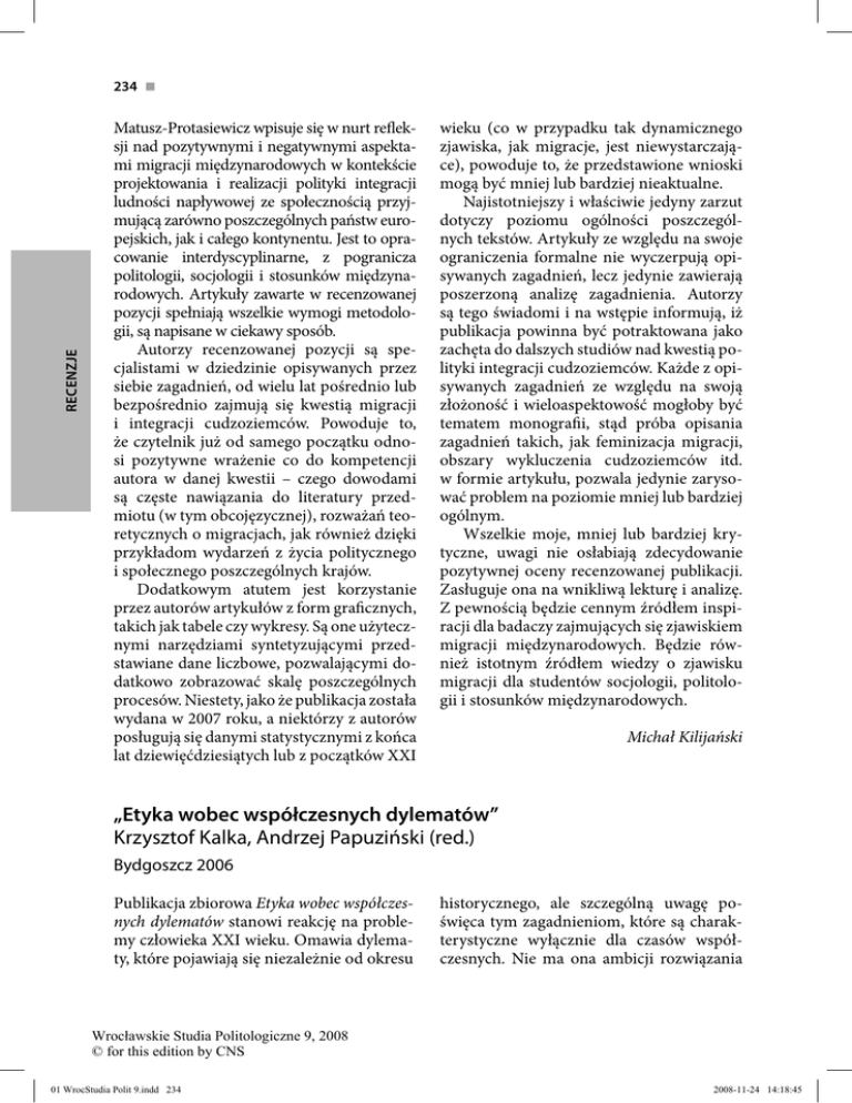 RECENZJE 234 Matusz-Protasiewicz wpisuje się w nurt refleksji nad pozytywnymi i negatywnymi aspektami migracji międzynarodowych w kontekście projektowania i realizacji polityki integracji ludności napływowej ze społecznością przyjmującą zarówno poszczególnych państw europejskich, jak i całego kontynentu. Jest to opracowanie interdyscyplinarne, z pogranicza politologii, socjologii i stosunków międzynarodowych. Artykuły zawarte w recenzowanej pozycji spełniają wszelkie wymogi metodologii, są napisane w ciekawy sposób. Autorzy recenzowanej pozycji są specjalistami w dziedzinie opisywanych przez siebie zagadnień, od wielu lat pośrednio lub bezpośrednio zajmują się kwestią migracji i integracji cudzoziemców. Powoduje to, że czytelnik już od samego początku odnosi pozytywne wrażenie co do kompetencji autora w danej kwestii – czego dowodami są częste nawiązania do literatury przedmiotu (w tym obcojęzycznej), rozważań teoretycznych o migracjach, jak również dzięki przykładom wydarzeń z życia politycznego i społecznego poszczególnych krajów. Dodatkowym atutem jest korzystanie przez autorów artykułów z form graficznych, takich jak tabele czy wykresy. Są one użytecznymi narzędziami syntetyzującymi przedstawiane dane liczbowe, pozwalającymi dodatkowo zobrazować skalę poszczególnych procesów. Niestety, jako że publikacja została wydana w 2007 roku, a niektórzy z autorów posługują się danymi statystycznymi z końca lat dziewięćdziesiątych lub z początków XXI wieku (co w przypadku tak dynamicznego zjawiska, jak migracje, jest niewystarczające), powoduje to, że przedstawione wnioski mogą być mniej lub bardziej nieaktualne. Najistotniejszy i właściwie jedyny zarzut dotyczy poziomu ogólności poszczególnych tekstów. Artykuły ze względu na swoje ograniczenia formalne nie wyczerpują opisywanych zagadnień, lecz jedynie zawierają poszerzoną analizę zagadnienia. Autorzy są tego świadomi i na wstępie informują, iż publikacja powinna być potraktowana jako zachęta do dalszych studiów nad kwestią polityki integracji cudzoziemców. Każde z opisywanych zagadnień ze względu na swoją złożoność i wieloaspektowość mogłoby być tematem monografii, stąd próba opisania zagadnień takich, jak feminizacja migracji, obszary wykluczenia cudzoziemców itd. w formie artykułu, pozwala jedynie zarysować problem na poziomie mniej lub bardziej ogólnym. Wszelkie moje, mniej lub bardziej krytyczne, uwagi nie osłabiają zdecydowanie pozytywnej oceny recenzowanej publikacji. Zasługuje ona na wnikliwą lekturę i analizę. Z pewnością będzie cennym źródłem inspiracji dla badaczy zajmujących się zjawiskiem migracji międzynarodowych. Będzie również istotnym źródłem wiedzy o zjawisku migracji dla studentów socjologii, politologii i stosunków międzynarodowych. Michał Kilijański „Etyka wobec współczesnych dylematów” Krzysztof Kalka, Andrzej Papuziński (red.) Bydgoszcz 2006 Publikacja zbiorowa Etyka wobec współczesnych dylematów stanowi reakcję na problemy człowieka XXI wieku. Omawia dylematy, które pojawiają się niezależnie od okresu historycznego, ale szczególną uwagę poświęca tym zagadnieniom, które są charakterystyczne wyłącznie dla czasów współczesnych. Nie ma ona ambicji rozwiązania Wrocławskie Studia Politologiczne 9, 2008 © for this edition by CNS 01 WrocStudia Polit 9.indd 234 2008-11-24 14:18:45 235 Szczecina, Rzeszowa i Olsztyna. Tak wielostronne podejście skutkuje, po pierwsze, zróżnicowaniem problemowym oraz faktem, iż w wielu tekstach, poza akcentem etycznym, pojawiają się szersze odniesienia socjologiczne i politologiczne. Po drugie, spojrzenie na problematykę moralnych dylematów z różnych perspektyw wydaje się chronić przed ograniczonością i jednostronnością w podejściu do omawianego tematu. Praca podzielona została na trzy rozdziały. W rozdziale pierwszym, zatytułowanym Problemy zawsze aktualne, autorzy poruszają kwestie dylematów moralnych, które znajdują się w kręgu zainteresowań etyki ogólnej. Omówione w nim zagadnienia pretendują do miana uniwersalnych, zarówno pod względem czasowym, jak i społecznym, w tym sensie, iż dotyczą problemów nurtujących ludzi niezależnie od czasu, środowiska, w którym żyją, jak również niezależne od wykształcenia czy wykonywanego zawodu. Jest to rozdział, w którym autorzy analizują wybrane konteksty etyki ogólnej, toczą spór o wartości, o jej rolę i znaczenie, o ambiwalentność jej możliwości i zastosowań. Wprowadzenie do wspomnianego rozdziału stanowi tekst A. Latawiec W poszukiwaniu istoty dylematów etycznych, w którym autorka szczegółowo wyjaśnia pojęcia „dylematu moralnego” oraz podejmuje się analizy wybranych źródeł dylematów, takich jak: konflikty wartości, odmienne kryteria rozstrzygnięć, nieprawidłowa ocena faktów czy nawet problemy językowe. A. Latawiec wychodzi z założenia, iż sprawą fundamentalną przy rozstrzyganiu etycznych wątpliwości jest prawidłowe ich zdiagnozowanie. Etyka w obronie bezinteresowności – to tytuł artykułu H. Romanowskiej-Łakomy, w którym autorka podejmuje się rozważań nad sensem ludzkiego życia, który prezentuje w nowy, ciekawy sposób. Za pomocą analizy porównawczej zestawia ze sobą problematykę sensu z zagadnieniem celu i celowości. Sam sens określa jako: „bezstronny i uniwer- RECENZJE ich wszystkich. Stanowi jedynie przegląd tych najbardziej reprezentatywnych, najpowszechniejszych, budzących największe kontrowersje. Jest świadectwem „czujności” – czytamy we wstępie do publikacji. Rzeczywiście problematyka podjęta w wymienionej wyżej pracy zbiorowej wydaje się ze wszech miar aktualna i uzasadniona. Żyjemy bowiem w czasach, które przynoszą spektakularne odkrycia w wielu dziedzinach. Wiązanie nadziei na przyszłość z osiągnięciami biotechnologii i dziedzin jej pokrewnyc