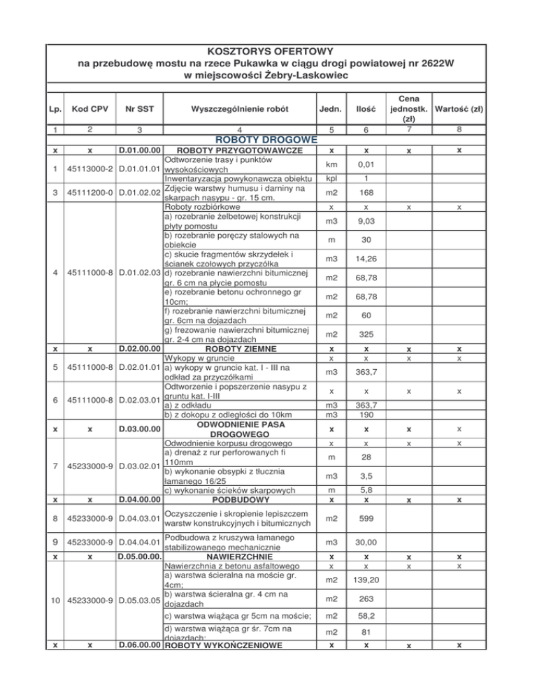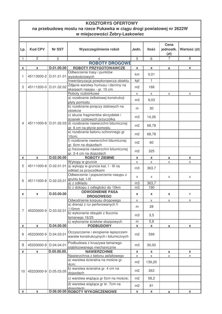 KOSZTORYS OFERTOWY na przebudow mostu na rzece Pukawka w ci gu drogi powiatowej nr 2622W w miejscowo ci ebry-Laskowiec Lp. Kod CPV Nr SST 1 2 3 x x 1 3 4 x D.01.00.00 45113000-2 D.01.01.01 45111200-0 D.01.02.02 45111000-8 D.01.02.03 x D.02.00.00 5 45111000-8 D.02.01.01 6 45111000-8 D.02.03.01 x 7 x 8 x D.03.00.00 45233000-9 D.03.02.01 x D.04.00.00 45233000-9 D.04.03.01 Wyszczególnienie robót Jedn. 4 5 6 ROBOTY PRZYGOTOWAWCZE Odtworzenie trasy i punktów wysoko ciowych Inwentaryzacja powykonawcza obiektu Zdj cie warstwy humusu i darniny na skarpach nasypu - gr. 15 cm. Roboty rozbiórkowe a) rozebranie elbetowej konstrukcji płyty pomostu b) rozebranie por czy stalowych na obiekcie c) skucie fragmentów skrzydełek i cianek czołowych przyczółka d) rozebranie nawierzchni bitumicznej gr. 6 cm na płycie pomostu e) rozebranie betonu ochronnego gr 10cm; f) rozebranie nawierzchni bitumicznej gr. 6cm na dojazdach g) frezowanie nawierzchni bitumicznej gr. 2-4 cm na dojazdach ROBOTY ZIEMNE Wykopy w gruncie a) wykopy w gruncie kat. I - III na odkład za przyczółkami Odtworzenie i popszerzenie nasypu z gruntu kat. I-III a) z odkładu b) z dokopu z odległo ci do 10km ODWODNIENIE PASA DROGOWEGO Odwodnienie korpusu drogowego a) drena z rur perforowanych fi 110mm b) wykonanie obsypki z tłucznia łamanego 16/25 c) wykonanie cieków skarpowych PODBUDOWY x x km 0,01 kpl 1 m2 168 x x m3 9,03 m 30 m3 14,26 m2 68,78 m2 68,78 m2 60 m2 325 x x x x m3 363,7 x x m3 m3 363,7 190 x ROBOTY DROGOWE Oczyszczenie i skropienie lepiszczem warstw konstrukcyjnych i bitumicznych Podbudowa z kruszywa łamanego stabilizowanego mechanicznie x x D.05.00.00. NAWIERZCHNIE Nawierzchnia z betonu asfaltowego a) warstwa cieralna na mo cie gr. 4cm; b) warstwa cieralna gr. 4 cm na 10 45233000-9 D.05.03.05 dojazdach 9 45233000-9 D.04.04.01 c) warstwa wi x x ca gr 5cm na mo cie; d) warstwa wi ca gr r. 7cm na dojazdach; D.06.00.00 ROBOTY WYKO CZENIOWE Ilo Cena jednostk. Warto (zł) 7 8 x x x x x x x x x x x x x x x x x m 28 m3 3,5 m x 5,8 x x x m2 599 m3 30,00 x x x x x x x x m2 139,20 m2 263 m2 58,2 m2 81 x x x x (zł) 1 2 3 11 45112000-5 D.06.01.01 12 45112000-5 D.06.01.02 x x D.07.00.00 13 45233000-9 D.07.03.01 14 45233000-9 D.07.05.01 x x D.08.00.00. 15 45233000-9 D.08.01.01 16 45233000-9 D.08.02.02 17 45233000-9 D.08.03.01 x x 18 45111000-8 x x 19 45221000-2 x x 20 45221000-2 21 45221000-2 x x 22 45221000-2 M.11.00.00 4 5 Umocnienie powierzchniowe skarp ROBOTY DROGOWE m2 nasypu i rowów przez humusowanie z obsianiem traw ; Umocnienie koryta rzeki podwójn m kiszk faszynow fi 20cm URZ DZENIA BEZPIECZE STWA x RUCHU Tymczasowa organizacja ruchu na kpl czas robót. m Stalowe bariery ochronne SP-09/D/2 x ELEMENTY ULIC Kraw nik kamienny 30x20cm na m dojazdach; Chodnik z kostki brukowej o grubo ci 8 cm na podsypce cementowo piaskowej m2 gr 10cm; Obrze a betonowe chodnikowe 8 x 30 m cm. ROBOTY MOSTOWE FUNDAMENTOWANIE Roboty ziemne przy fundamentowaniu M.11.01.01 a) wbicie grodzic stalowych G46 M.12.00.00 ZBROJENIE Zbrojenie betonu stal klasy A - IIIN (BSt 500S) a) poszerzenia przyczółka, skrzydełka, M.12.01.01 płaszcz przyczółka b) płyt przej ciowych c) płyty pomostu d) kap chodnikowych e) fundamentu oporu stozka M.13.00.00 BETON Beton klasy B 40 w deskowaniu: a) płyty pomostu b) kap chodnikowych Beton klasy B 30 w deskowaniu: M.13.01.01 a) poszerzenia przyczółka, skrzydełka, płaszcz przyczółka b) płyt przej ciowych c) fundamentu oporu sto ka Beton klasy B 10 pod płyty M.13.02.01 przej ciowe, fundament oporu sto ka, schody, poszerzenia przyczółków M.14.00.00. KONSTRUKCJE STALOWE Konstrukcja stalowa ustroju no nego a) nowa konstrukcja stalowa d wigarów głównych ze stali S355J2G3 b) nowa konstrukcja stalowa M.14.01.01. poprzecznic z ceownika C300 c) starou yteczna konstrukcja stalowa ustroju nios cego mostu - belki główne, (obróbka mechaniczna zgodnie z proj.) d) kotwy talerzowe ze stali St3S Oczyszczenie i zabezpieczenie konstrukcji stalowej ustroju nios cego 23 45221000-2 M.14.02.01. powłokami epoksydowopoliuretanowymi gr 320mikronów.; X X M.15.00.00 IZOLACJA 6 7 8 x x x x 248 80 x 1,00 80 x 36,6 22,6 50,20 x x m2 x x x 80,4 x x x x x x x x x x x kg 3416 kg kg kg kg x x m3 m3 x 1988 3486 575 305 x x 19,01 4,66 X x x x x x x m3 42,00 m3 m3 16,65 5,76 m3 12,2 x x x X x x x x t 3,00 t 0,86 t 5,38 szt. 36 m2 131,62 x x x x 1 2 3 4 5 Izolacja powłokowa epoksydowoROBOTY DROGOWE 24 45221000-2 M.15.01.02 smołowa powierzchni stalowej cianek m2 szczelnych Izolacje z papy termozgrzewalnej x a) na płycie pomostu m2 25 45221000-2 M.15.02.03. b) na ciance zaplecznej i fragmencie m2 płyty przej ciowej 26 45221000-2 M.15.02.05. Izolacja bitumiczna wykonana na zimno powierzchni bet. styku z gruntem; Uszczelnienie kitem trwale 27 45221000-2 M.15.02.06 plastycznym np. Laterbit BG 40x10mm styku nawierzchni z kraw nikiem 28 45221000-2 29 45221000-2 X X 30 45221000-2 X X 31 45221000-2 X X 32 45221000-2 X X 33 45221000-2 34 45221000-2 x x 35 45221000-2 36 45221000-2 37 45400000-1 Uszczelnienie masa zalewow na gor co a) styk kapy chodnikowej z kraw nikiem 20x30mm M.15.02.07. b) styk kapy chodnikowej z gzymsem polimerobetonowym 20x30mm c) szczelina pomi dzy płyt przej ciow a ciank zapleczn 20x100mm Nawierzchnio-izolacja z ywic epoksydowo-poliuretanowych na M.15.03.02. powierzchni kap wspornikowych gr. 4mm; M.16.00.00. ODWODNIENIE S czki z rurk odwodnieniow M.16.01.04. Dren na izolacji np. PERCODRAIN; M.17.00.00 ŁO YSKA Ło yska elastomerowe M.17.01.02. Ło yska wielokierunkowo przesuwne o no no ci charakterystycznej 300kN M.18.00.00 DYLATACJE Urz dzenie dylatacyjne bitumiczne o wym. 95x500 mm M.18.01.01. Urz dzenie dylatacyjne bitumiczne o wym. 200x300 mm M.19.00.00 ELEMENTY ZABEZPIECZE Kraw nik kamienny kotwiony M.19.01.01 18x20cm; Barieropor cz sztywna M.19.01.03. bezprzekładkowa typ III, BPS/M/1, H=1,10m; M.20.00.00 INNE ROBOTY MOSTOWE Umocnienie sto ków nasypu drobnowymiarowymi elementami M.20.01.05. betonowymi na pod