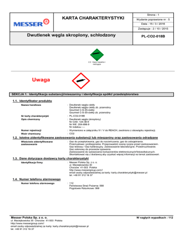 Strona : 1 KARTA CHARAKTERYSTYKI Wydanie poprawione nr : 5 Data : 15 / 3 / 2016 Zastępuje : 2 / 10 / 2015 Dwutlenek węgla skroplony, schłodzony PL-CO2-018B n ó 2.2 : Gazy niepalne i nietrujące Uwaga « M SEKCJA 1. Identyfikacja substancji/mieszaniny i identyfikacja spółki/ przedsiębiorstwa 1.1. Identyfikator produktu Nazwa handlowa Nr karty charakterystyki Opis chemiczny Numer rejestracji Wzór chemiczny : Dwutlenek węgla ciekły Dwutlenek węgla ciekły zb. przenośny Gourmet C-S-35-ciekły Gourmet C-S-35-ciekły zb. przenośny : PL-CO2-018B : Dwutlenek węgla (skroplony) Nr CAS :124-38-9 Nr WE :204-696-9 Nr indeksu :--: Wymieniono w załączniku IV / V do REACH, zwolniono z obowiązku rejestracji. : CO2 1.2. Istotne zidentyfikowane zastosowania substancji lub mieszaniny oraz zastosowania odradzane Właściwie zidentyfikowane zastosowanie : Gaz do przepłukiwania, gaz do rozcieńczania, gaz do zobojętniania. Przemysłowe i profesjonalne. Przeprowadzić ocenę ryzyka przed zastosowaniem. Gaz testowy / Gaz kalibracyjny. Zastosowanie laboratoryjne. Przedmuchiwanie. Gaz osłonowy do procesów spawania. Zastosowanie do wytwarzania komponentów elektronicznych/fotowoltaicznych. Skontaktować się z dostawcą aby uzyskać więcej informacji na temat zastosowań. 1.3. Dane dotyczące dostawcy karty charakterystyki Identyfikacja firmy : Messer Polska Sp. z o. o. ul. Maciejkowicka 30 Chorzów 41-503 Polska http://www.messergroup.com// email osoby odpowiedzialnej za karty: [email protected] tel. +48 91 312 16 37 1.4. Numer telefonu alarmowego Numer telefonu alarmowego : 112 Państwowa Straż Pożarna: 998 Pogotowie Ratunkowe: 999 Messer Polska Sp. z o. o. ul. Maciejkowicka 30 Chorzów 41-503 Polska http://www.messergroup.com// email osoby odpowiedzialnej za karty: [email protected] tel. +48 91 312 16 37 W nagłych wypadkach : 112 Strona : 2 KARTA CHARAKTERYSTYKI Wydanie poprawione nr : 5 Data : 15 / 3 / 2016 Zastępuje : 2 / 10 / 2015 Dwutlenek węgla skroplony, schłodzony PL-CO2-018B SEKCJA 2. Identyfikacja zagrożeń 2.1. Klasyfikacja substancji lub mieszaniny Klasa zagrożenia i kody kategorii wg Rozporządzenia (WE) nr 1272/2008 (CLP) : Gazy pod ciśnieniem - Gaz skroplony schłodzony - Uwaga (CLP : Press. Gas Ref. Liq.) H281 • Zagrożenia fizyczne 2.2. Elementy oznakowania Oznakowanie wg Rozporządzenia (WE) nr 1272/2008 (CLP) • Piktogramy określające rodzaj zagrożenia • Kody piktogramów określających rodzaj zagrożenia • Hasło ostrzegawcze • Zwrot wskazujący rodzaj zagrożenia • Zwrot wskazujący środki ostrożności - Zapobieganie - Reagowanie - Przechowywanie « M : GHS04 : Uwaga : H281 - Zawiera schłodzony gaz; może spowodować oparzenia kriogeniczne lub obrażenia. : P282 - Nosić rękawice izolujące od zimna/maski na twarz/ochronę oczu. : P336+P315 - Rozmrozić oszronione obszary letnią wodą. Nie trzeć oszronionego obszaru. Natychmiast zasięgnąć porady/zgłosić się pod opiekę lekarza. : P403 - Przechowywać w dobrze wentylowanym miejscu. 2.3. Inne zagrożenia : Duszący w wysokich stężeniach. SEKCJA 3. Skład/informacja o składnikach 3.1. Substancja Substancja. Nazwa substancji Dwutlenek węgla (skroplony) : Zawartość 100 Nr CAS 124-38-9 Nr WE 204-696-9 Nr indeksu ----- Numer rejestracji *1 Klasyfikacja Press. Gas Ref. Liq. (H281) Nie zawiera innych składników lub zanieczyszczeń, które mogłyby mieć wpływ na klasyfikację produktu. * 1: Wymieniono w załączniku IV / V do REACH, zwolniono z obowiązku rejestracji. * 2: Termin rejestracji nie upłynął. * 3: Rejestracja nie jest wymagana. Substancja wytwarzana lub importowana w ilości < 1t/rok. Pełny tekst zwrotów H patrz sekcja 16. 3.2. Mieszanina Nie dotyczy. Messer Polska Sp. z o. o. ul. Maciejkowicka 30 Chorzów 41-503 Polska http://www.messergroup.com// email osoby odpowiedzialnej za karty: [email protected] tel. +48 91 312 16 37 W nagłych wypadkach : 112 Strona : 3 KARTA CHARAKTERYSTYKI Wydanie poprawione nr : 5 Data : 15 / 3 / 2016 Zastępuje : 2 / 10 / 2015 Dwutlenek węgla skroplony, schłodzony PL-CO2-018B SEKCJA 4. Środki pierwszej pomocy 4.1. Opis środków pierwszej pomocy - Wdychanie - Kontakt ze skórą - Kontakt z oczami - Spożycie : Zabezpieczając się izolującym aparatem oddechowym przenieść ofiarę do nieskażonego obszaru. Utrzymywać ofiarę w cieple i spokoju. Wezwać lekarza. W przypadku zaniku oddechu zastosować sztuczne oddychanie. : W przypadku odmrożenia zraszać wodą przez co najmniej 15 minut. Zastosować jałowy opatrunek. Uzyskać pomoc lekarską. : Natychmiast przemywać oczy dużą ilością wody przez co najmniej 15 minut. : Spożycie nie jest uważane za potencjalną drogę narażenia. 4.2. Najważniejsze ostre i opóźnione objawy oraz skutki narażenia : W wysokich stężeniach może spowodować uduszenie. Objawy obejmują utratę zdolności ruchowych / przytomności. Ofiara może nie być świadoma, że się dusi. Niskie stężenia CO2 powodują przyspieszony oddech i ból głowy. 4.3. Wskazania dotyczące wszelkiej natychmiastowej pomocy lekarskiej i szczególnego postępowania z poszkodowanym : Żadne. SEKCJA 5. Postępowanie w przypadku pożaru 5.1. Środki gaśnicze - Odpowiednie środki gaśnicze - Nieodpowiednie środki gaśnicze : Mgła wodna lub drobno rozproszony strumień wody. : Nie stosować silnego strumienia wody do gaszenia. 5.2. Szczególne zagrożenia związane z substancją lub mieszaniną Specyficzne zagrożenia Niebezpieczne produkty spalania : Narażenie na działanie ognia może spowodować rozerwanie / wybuch pojemnika. : Żadne. 5.3. Informacje dla straży pożarnej Specjalistyczne metody Specjalny sprzęt ochronny dla strażaków : Usunąć pojemniki z dala od miejsca pożaru, jeżeli można to zrobić bez zagrożenia. Jeżeli to możliwe, zatrzymać wypływ produktu. Prowadzić akcję gaśniczą odpowiednią do pożaru w pobliżu. Narażenie na ogień i promieniowanie cieplne może prowadzić do rozerwania