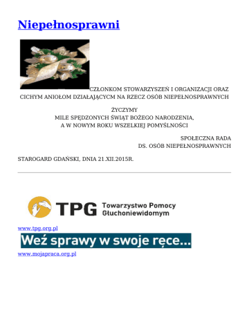 Niepełnosprawni CZŁONKOM STOWARZYSZEŃ I ORGANIZACJI ORAZ CICHYM ANIOŁOM DZIAŁAJĄCYCM NA RZECZ OSÓB NIEPEŁNOSPRAWNYCH ŻYCZYMY MILE SPĘDZONYCH ŚWIĄT BOŻEGO NARODZENIA, A W NOWYM ROKU WSZELKIEJ POMYŚLNOŚCI SPOŁECZNA RADA DS. OSÓB NIEPEŁNOSPRAWNYCH STAROGARD GDAŃSKI, DNIA 21.XII.2015R. www.tpg.org.pl www.mojapraca.org.pl (napisała Bogumiła Jurczyńska) Urodziłam się na wsi i tutaj mieszkam. Lubię to swoje małe miejsce na ziemi, mój mały domek i swój ogródek. Problem ze wzrokiem mam od urodzenia – wysoka krótkowzroczność. Zmorą mojego dzieciństwa były grube i ciężkie okulary. Nie miałam żadnych innych specjalnych pomocy. Moim jedynym „przywilejem” było siedzenie w pierwszej ławce przez wszystkie lata nauki szkolnej, ale ja przecież i tak z tablicy nic nie dałam rady przeczytać, zaglądałam przez ramię do zeszytu kolezanki, z którą siedziałam. Lekcje odrabiałam przy lampie naftowej, bo na „nowych wybudowaniach” elektryfikację przeprowadzono dopiero w 1969 roku.Mimo tych trudności uczyłam się dobrze, zawsze przynosiłam świadectwo z czerwonym paskiem. Lubiłam być aktywna – należałam do szkolnego chóru, byłam drużynową w harcerstwie i gospodarzem klasy. Po ukończeniu ósmej klasy w poradni pedagogicznej radzono mi, abym na dalszą naukę wybrała sobie szkołę, w której „ dużo w książkach nie trzeba będzie siedzieć”. Oczy miałem bardzo osłabione. Do dziś pamiętam, jak kierowniczka zakładu fryzjerskiego, gdzie próbowałam załatwić sobie praktyki powiedziała:” Z takim wzrokiem nie możemy cię przyjąć, bo kładła byś się na klientki.” A ja marzyłam, żeby zostać przedszkolanką lub nauczycielką. Niestety! Gdy miałam 18 lat udało mi się znaleźć zatrudbnienie. Prowadziłam klub dla młodzieży. Bardzo lubiłam tę pracę, ale moje oczy się zbuntowały – wylew do siatkówki, po 2 latach następny i „moja” okulistka powiedziała: ani dnia dłuzej! Szczęściem w nieszczęściu było to, że przepracowałam 5 lat i mogłam dostać chociarz skromną rentę. W 1981 roku wyszłam za mąż, a rok później wielka radość – urodziłam śliczną , zdrową córkę. Gdy zapisałam się do Polskiego Związku Niewidomych, nie chciałam być tylko biernym członkiem. Zaczęłam pomagać i angazować się w pracę zarządu. Lubiłam być między ludźmi, jeździłam na każdą wycieczkę, na turnusy rehabilitacyjne, na szkolenia. Miałam dużo znajomych i spore grono przyjaciół. Gdy mąż zachorował i też musiał przejść na rentę, żyło się nam ciężko. Udało mi się zatrudnić w Zakładzie Pracy Chronionej. Brrr! Przykre wspomnienia. Udało mi się wytrwać cztery lata. Trzy lata temu dopadła mnie choroba nowotworowa. Wtedy przekonałam się co znaczy mieć kchaną rodzinę i oddanych przyjaciół – zrobili prawdziwy „ szturm do nieba” z prośbą o moje zdrowie i chyba się im udało, bo na razie jest dobrze. Od 7 lat jestem przewodniczącą Powiatowego Koła PZPN. Dużo pracy, ale i satysfakcjaogromna, gdy uda się komuś pomóc. Cieszę się, że zmienia się nastawienie społeczeństwa do osób niepełnosprawnych. Jest już dużo specjalistycznego sprzętu. Mnie pomaga”gadający” komputer, czytający SMS-y telefon, czytak książek, udźwiękowiony ciśnienimierz i lupa elektroniczna. Medycyna terz zrobiła wielki postęp. Ja moje grube okulary mogę chociarz na kilka godzin dziennie zamienić na szkła kontaktowe. Na początku ubiegłego roku do naszego koła PZN przyjechali przedstawiciele Pomorskiej Jednostki Towarzystwa Pomocy Głuchoniemym, aby wyłonić spośród członków koła osoby z dysfunkcją wzroku i słuchu. Takim trafem rozpoczoł się w moim życiu nowy rozdział, zostałam członkiem TPG. Od 8 lat mam stwierdzony ubytek słuchu w stopniu znacznym, noszę aparat słuchowy. Dzięki współpracy z TPG moje życiowe akumulatory zostały doładowane dodatkową pozytywną energią. Spotkałam tu wieklu wspaniałych ludzi, którym leży na sercu niesienie pomocy ludziom głuchoniemym. Ja też taką pomoc otrzymałam. Swoje smuteczki i kłopoty staram się odkładać „na dno szuflady”. Zawsze staram się myśleć o ludziach, którzy mają gorzej ode mnie i skupiam się mna tym, aby chociaż niektórym z nich pomóc. Mam jeszcze takie jedno osobiste marzenie, aby doczekać się wnuczat, a że na razie się nic nie zapowiada, to muszę się jakoś trzymać:). ,,Starogard – Miastem przestrzeni wspólnej” Głównym celem Programu jest wyrównywanie szans osób niepełnosprawnych do możliwie pełnego uczestniczenia w życiu społecznym naszego miasta. Bariery: architektoniczne, komunikacyjne, edukacyjne, społeczne, ekonomiczne, dzięki kompleksowemu podejściu do problemu i wielu partnerom uczestniczącym w realizacji Programu, udało się częściowo zlikwidować. Program przyjęty do realizacji uchwałą Rady Miasta w 1998 r. ma swoje wymierne efekty. Od 1998 do 2008 roku wykonano: przy Miejskim Ośrodku Pomocy Społecznej powstał Środowiskowy Dom Samopomocy (styczeń 1998r.) oraz Ośrodek Adaptacyjny (listopad 1999r.), w Specjalnym Ośrodku Szkolno-Wychowawczym działa Ośrodek Wczesnej Interwencji, powołano Starogardzkie Centrum Rehabilitacji i przekazano mu siedzibę spełniającą warunek dostępności dla osób niepełnosprawnych, obiekty Zespołu Szkół Publicznych, Publicznej Szkoły Podstawowej Nr 1 – basen i sala gimnastyczna, Publiczne Gimnazjum Nr 3, Miejskie Przedszkole Publiczne Nr 2 są obiektami bez barier architektonicznych, wymieniono miejski tabor MZK, kupując niskopodłogowe autobusy, główny ciąg komunikacyjny – ul. Gen. H. Hallera – dostosowano do potrzeb osób poruszających się na wózkach, powołano Pełnomocnika Zarządu do spraw Osób Niepełnosprawnych (wolontariat) oraz Radę Osób Niepełnosprawnych, z inicjatywy których np. Telekomunikacja zainstalowała w kilku punktach miasta telefony dla potrzeb niepełn