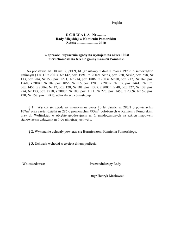 Projekt U C H W A Ł A Nr .......... Rady Miejskiej w Kamieniu Pomorskim Z dnia ........................ 2010 w sprawie wyraŜenia zgody na wynajem na okres 10 lat nieruchomości na terenie gminy Kamień Pomorski. Na podstawie art. 18 ust. 2, pkt 9, lit „a” ustawy z dnia 8 marca 1990r. o samorządzie gminnym ( Dz. U. z 2001r. Nr 142, poz. 1591, z 2002r. Nr 23, poz. 220, Nr 62, poz. 558, Nr 113, poz. 984, Nr 153, poz. 1271, Nr 214, poz. 1806, z 2003r. Nr 80, poz. 717, Nr 162, poz. 1568, z 2004r. Nr 102, poz. 1055, Nr 116, poz. 1203, z 2005r. Nr 172, poz. 1441, Nr 175, poz. 1457, z 2006r. Nr 17, poz. 128, Nr 181, poz. 1337, z 2007r. nr 48, poz. 327, Nr 138, poz. 974, Nr 173, poz. 1218, z 2008r. Nr 180, poz. 1111, Nr 223, poz. 1458, z 2009r. Nr 52, poz. 420, Nr 157, poz. 1241), uchwala się, co następuje: § 1. WyraŜa się zgodę na wynajem na okres 10 lat działki nr 287/1 o powierzchni 107m2 oraz części działki nr 286 o powierzchni 493m2 połoŜonych w Kamieniu Pomorskim, przy ul. Wolińskiej, w obrębie geodezyjnym nr 6, uwidocznionych na szkicu mapowym stanowiącym załącznik nr 1 do niniejszej uchwały. § 2. Wykonanie uchwały powierza się Burmistrzowi Kamienia Pomorskiego. § 3. Uchwała wchodzi w Ŝycie z dniem podjęcia. Wnioskodawca: Przewodniczący Rady mgr Henryk Masłowski Uzasadnienie: W związku z faktem, iŜ Gmina Kamień Pomorski nie ma opracowanych zasad wydzierŜawiania i wynajmowania nieruchomości, zgodnie z art. 18, ust. 2, pkt 9, lit. „a” ustawy o samorządzie gminnym, wynajem na okres dłuŜszy niŜ 3 lata lub na czas nieoznaczony moŜe być dokonywane wyłącznie za zgodą Rady Miejskiej. Działkę nr 287 i część działki nr 286 przy ul. Wolińskiej w kamieniu Pomorskim planuję wynająć na okres 10 lat dla właściciela przyległej piekarni z przeznaczeniem na urządzenie parkingu.