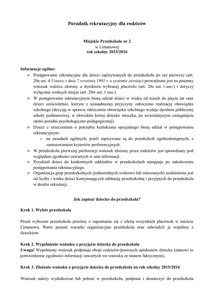 Poradnik rekrutacyjny dla rodziców Miejskie Przedszkole nr 2 w Limanowej rok szkolny 2015/2016 Informacje ogólne: • Postępowanie rekrutacyjne dla dzieci zapisywanych do przedszkola po raz pierwszy (art. 20a ust. 4 Ustawy z dnia 7 września 1991 r. o systemie oświaty) prowadzone jest na pisemny wniosek rodzica złożony u dyrektora wybranej placówki (art. 20s ust. 1 uso.) i dotyczy wyłącznie wolnych miejsc (art. 20w ust. 1 uso.). • W postępowaniu rekrutacyjnym biorą udział dzieci w wieku od trzech do pięciu lat oraz dzieci sześcioletnie, którym z uzasadnionej przyczyny odroczono realizację obowiązku szkolnego (decyzję w sprawie odroczenia obowiązku szkolnego wydaje dyrektor publicznej szkoły podstawowej, w obwodzie której dziecko mieszka, po wcześniejszym zasięgnięciu opinii poradni psychologiczno-pedagogicznej). • Dzieci z orzeczeniem o potrzebie kształcenia specjalnego biorą udział w postępowaniu rekrutacyjnym: o na zasadach ogólnych, jeżeli zapisywane są do przedszkoli ogólnodostępnych, z zastosowaniem kryteriów preferencyjnych. • W przedszkolu pierwszej preferencji wniosek złożony przez rodziców jest sprawdzany pod względem zgodności zawartych w nim informacji . • Przydział dzieci do konkretnych oddziałów w przedszkolach następuje po zakończeniu postępowania rekrutacyjnego. • Organizacja grup przedszkolnych (jednorodnych wiekowo lub mieszanych) uzależniona jest od liczby i wieku dzieci kontynuujących edukację przedszkolną i przyjętych do przedszkola w drodze rekrutacji. Jak zapisać dziecko do przedszkola? Krok 1. Wybór przedszkola Przed wyborem przedszkola prosimy o zapoznanie się z ofertą wszystkich placówek w mieście Limanowa. Warto poznać warunki organizacyjne przedszkola oraz odwiedzić je wspólnie z dzieckiem. Krok 2. Wypełnienie wniosku o przyjęcie dziecka do przedszkola Uwaga! Wypełniony wniosek podpisuje oboje rodziców/prawnych opiekunów dziecka (stanowi to potwierdzenie zgodności informacji zawartych we wniosku ze stanem faktycznym). Krok 3. Złożenie wniosku o przyjęcie dziecka do przedszkola na rok szkolny 2015/2016 Wniosek należy wydrukować lub pobrać w przedszkolu, podpisać i dostarczyć do przedszkola pierwszej preferencji.. Ważne, by wniosek był kompletny i złożony w terminie. Kolejność składania wniosków nie ma wpływu na wynik rekrutacji. Krok 4. Weryfikacja dokumentów w przedszkolu pierwszej preferencji – potwierdzenie spełniania kryteriów kwalifikacyjnych zgłoszonych przy rejestrowaniu wniosku Do poprawnie wypełnionego wniosku rodzice zobowiązani są dołączyć dokumenty/oświadczenia/zaświadczenia potwierdzające spełnianie kryteriów ustawowych oraz kryteriów podanych przez Radę Miasta Limanowa Uwaga! Oświadczenia składane są pod rygorem odpowiedzialności karnej za składanie fałszywych zeznań. Składający oświadczenie jest obowiązany do zawarcia w nim klauzuli następującej treści: „Jestem świadoma/świadomy odpowiedzialności karnej za złożenie fałszywego oświadczenia” (art. 20t ust. 6 uso.). Krok 5. Potwierdzenie przez rodziców woli przyjęcia dziecka do danego przedszkola Rodzice/prawni opiekunowie dzieci zakwalifikowanych do przyjęcia do przedszkola składają pisemne potwierdzenie woli zapisu w przedszkolu, do którego dziecko zostało zakwalifikowane. Niezłożenie oświadczenia woli w terminie od 8 do 10 kwietnia 2015 r. jest równoznaczne z rezygnacją z uczęszczania dziecka do przedszkola w roku szkolnym 2015/2016. Uwaga! Brak potwierdzenia woli uczęszczania dziecka do przedszkola w ustalonym w harmonogramie terminie jest równoznaczne z rezygnacją z miejsca w przedszkolu. Krok 6. Procedura odwoławcza Rodzice dzieci, które nie zostały przyjęte do przedszkola, mogą: • składać wniosek do komisji rekrutacyjnej o sporządzenie uzasadnienia odmowy przyjęcia dziecka do danego przedszkola w terminie siedmiu dni od dnia podania do publicznej wiadomości listy dzieci przyjętych i nieprzyjętych, • wnieść do dyrektora przedszkola odwołanie od rozstrzygnięcia komisji rekrutacyjnej w terminie siedmiu dni od dnia otrzymania uzasadnienia odmowy, • złożyć do sądu administracyjnego skargę na rozstrzygnięcie dyrektora danego przedszkola po wyczerpaniu innych możliwości określonych ustawą rekrutacyjną. I. Terminy postępowania rekrutacyjnego Postępowanie rekrutacyjne odbędzie się zgodnie z poniższym harmonogramem: L.p. Rodzaj czynności Termin 1. Składanie deklaracji o kontynuowaniu wychowania przedszkolnego w danym przedszkolu dzieci urodzonych w roku 2010 roku i do 10 marca 2015r. Termin postępowania uzupełniającego 2. 3. 4. 5. 6. 7. 8. wcześniej. Składanie wniosków wraz z załącznikami. Podanie do publicznej wiadomości listy kandydatów zakwalifikowanych i kandydatów niezakwalifikowanych. Podanie do publicznej wiadomości listy kandydatów przyjętych i kandydatów nieprzyjętych. Składanie wniosków o sporządzenie uzasadnienia odmowy przyjęcia dziecka. Przygotowanie i wydanie przez przewodniczącego komisji rekrutacyjnej uzasadnienia odmowy przyjęcia dziecka. Złożenie do dyrektora odwołania od rozstrzygnięcia komisji rekrutacyjnej wyrażonego w pisemnym uzasadnieniu odmowy przyjęcia. Rozstrzygnięcie przez dyrektora odwołania od rozstrzygnięcia komisji rekrutacyjnej wyrażonego w pisemnym uzasadnieniu odmowy przyjęcia. od 11 do 27 marca 2015 r. 8 kwietnia 2015 r. godz. 14.00 4 maj 2015r. 14 kwietnia 2015 r. godz. 14.00 12 maj 2015r. 8 maj 2015r do 7 dni od dnia podania do publicznej wiadomości listy kandydatów przyjętych i kandydatów nieprzyjętych. (do 5 maja 2015 r.) do 5 dni od daty złożenia wniosku o sporządzenie uzasadnienia odmowy przyjęcia dziecka. do 7 dni od terminu otrzymania pisemnego uzasadnienia odmowy przyjęcia Rozstrzygnięcie przez dyrektora odwołania od rozstrzygnięcia komisji rekrutacyjnej wyrażonego w pisemnym uzasadnieniu odmowy przyjęcia. Złożenie oświa