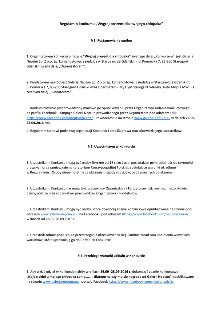 Regulamin konkursu „Wygraj prezent dla swojego chłopaka” § 1. Postanowienia ogólne 1. Organizatorem konkursu o nazwie "Wygraj prezent dla chłopaka” zwanego dalej „Konkursem” jest Galeria Neptun Sp. Z o.o. Sp. komandytowa, z siedzibą w Starogardzie Gdańskim, ul Pomorska 7, 83-200 Starogard Gdański zwana dalej „Organizatorem”. 2. Fundatorem nagród jest Galeria Neptun Sp. Z o.o. Sp. komandytowa, z siedzibą w Starogardzie Gdańskim, ul Pomorska 7, 83-200 Starogard Gdański wraz z partnerami: My Gym Starogard Gdański, Auto Myjnia MW. S.C. zwanymi dalej „Fundatorami”. 3. Konkurs zostanie przeprowadzony mailowo po opublikowaniu przez Organizatora zadania konkursowego na profilu Facebook – fanpage Galerii Neptun prowadzonego przez Organizatora pod adresem URL: https://www.facebook.com/neptungaleria/ i równocześnie na stronie www.galeria-neptun.eu w dniach 26.0928.09.2016 roku. 4. Regulamin stanowi podstawę organizacji Konkursu i określa prawa oraz obowiązki jego uczestników. § 2. Uczestnictwo w Konkursie 1. Uczestnikami Konkursu mogą być osoby fizyczne od 16 roku życia, posiadające pełną zdolność do czynności prawnych oraz zamieszkałe na terytorium Rzeczypospolitej Polskiej, spełniające warunki określone w Regulaminie. (Osoby niepełnoletnie za okazaniem zgody rodziców, bądź prawnych opiekunów.) 2. Uczestnikami Konkursu nie mogą być pracownicy Organizatora i Fundatorów, jak również małżonkowie, dzieci, rodzice oraz rodzeństwo pracowników Organizatora i Fundatorów. 3. Uczestnikami Konkursu mogą być osoby, które dokończą zdanie konkursowe opublikowane na stronie pod adresem www.galeria-neptun.eu i na Facebooku pod adresem https://www.facebook.com/neptungaleria/ w dniach od 26.09-28.09 2016 r. 4. Uczestnik zobowiązuje się do przestrzegania określonych w Regulaminie zasad oraz spełnienia wszystkich warunków, które uprawniają go do udziału w Konkursie. § 3. Przebieg i warunki udziału w Konkursie 1. Aby wziąć udział w Konkursie należy w dniach 26.09 -28.09.2016 r. dokończyć zdanie konkursowe „Najbardziej u mojego chłopaka cenię……… dlatego należy mu się nagroda od Galerii Neptun” opublikowane na stronie www.galeria-neptun.eu i portalu Facebook https://www.facebook.com/neptungaleria. 2. Odpowiedź należy przesłać na adres mailowy [email protected]. W treści maila należy podać nagrodę, o którą walczy dany uczestnik konkursu (patrz par. 5 ust. 1) Zgłoszenia należy przesłać najpóźniej w dniu 28.09.2016 r. do godz. 23:59. § 4. Zasady wyłaniania zwycięzców 1. Zwycięzcy Konkursu zostaną wyłonieni tylko spośród uczestników, którzy spełniają warunki wymienione w § 2 i 3 Regulaminu. 2. Laureatami konkursu zostaną autorzy siedmiu (7) najbardziej pomysłowych i kreatywnych odpowiedzi, które zostaną wyłonione spośród wszystkich nadesłanych zgłoszeń. 3. Nad prawidłowością przebiegu konkursu czuwają pracownicy Organizatora. 4. Po wyłonieniu zwycięzców Organizator konkursu w dniu 29.09.2016 o godz. 12:00 na stronie internetowej www.galeria-neptun.eu opublikuje nazwiska laureatów konkursu wraz z przypisanymi nagrodami. § 5. Nagrody 1. Nagrodami w konkursie są: - Miesięczny Pakiet Open + (1 szt.)* Fundatorem nagrody o łącznej wartości 304 zł jest siłownia i fitness My Gym Starogard Gdański. - Pakiet Mycia- Standard (3 szt.)** Fundatorem nagrody o wartości od 50 do 100 zł x 3 jest Auto Myjnia MW S.C. - Bony podarunkowe o wartości 100 zł do wykorzystania w sklepach Galerii Neptun (3 szt.) Fundatorem nagród (3x100 zł) jest Galeria Neptun. 2. Nagrody konkursowe zostaną wydane wyłącznie w postaci określonej Regulaminem, bez możliwości wymiany. 3. Odbiór nagród jest możliwy w Biurze Zarządu Galerii Neptun w dni robocze od poniedziałku do piątku w godzinach od 9:30 do 15:30, ul. Pomorska 7, 83-200 Starogard Gdański za okazaniem dowodu osobistego lub innego dokumentu stwierdzającego tożsamość. § 6. Postanowienia końcowe 1. Udział w konkursie jest jednocześnie akceptacją warunków zawartych w Regulaminie. *Wejście gratis + 1 miesiąc Open + trening personalny 1 h + pomiar wagą analityczną. **W tym: mycie z zewnątrz, wycieranie, odkurzanie wnętrza, mycie szyb od wewnątrz, czyszczenie i konserwacja plastików wewnętrznych, hydrowosk, czyszczenie opon)
