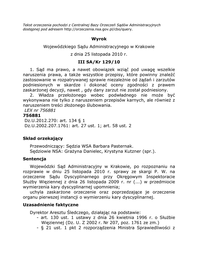 Tekst orzeczenia pochodzi z Centralnej Bazy Orzeczeń Sądów Administracyjnych dostępnej pod adresem http://orzeczenia.nsa.gov.pl/cbo/query. Wyrok Wojewódzkiego Sądu Administracyjnego w Krakowie z dnia 25 listopada 2010 r. III SA/Kr 129/10 1. Sąd ma prawo, a nawet obowiązek wziąć pod uwagę wszelkie naruszenia prawa, a także wszystkie przepisy, które powinny znaleźć zastosowanie w rozpatrywanej sprawie niezależnie od żądań i zarzutów podniesionych w skardze i dokonać oceny zgodności z prawem zaskarżonej decyzji, nawet , gdy dany zarzut nie został podniesiony. 2. Władza przełożonego wobec podwładnego nie może być wykonywana nie tylko z naruszeniem przepisów karnych, ale również z naruszeniem treści złożonego ślubowania. LEX nr 756881 756881 Dz.U.2012.270: art. 134 § 1 Dz.U.2002.207.1761: art. 27 ust. 1; art. 58 ust. 2 Skład orzekający Przewodniczący: Sędzia WSA Barbara Pasternak. Sędziowie NSA: Grażyna Danielec, Krystyna Kutzner (spr.). Sentencja Wojewódzki Sąd Administracyjny w Krakowie, po rozpoznaniu na rozprawie w dniu 25 listopada 2010 r. sprawy ze skargi P. W. na orzeczenie Sądu Dyscyplinarnego przy Okręgowym Inspektoracie Służby Więziennej z dnia 26 listopada 2009 r. nr (...) w przedmiocie wymierzenia kary dyscyplinarnej upomnienia; uchyla zaskarżone orzeczenie oraz poprzedzające je orzeczenie organu pierwszej instancji o wymierzeniu kary dyscyplinarnej. Uzasadnienie faktyczne Dyrektor Aresztu Śledczego, działając na podstawie: - art. 130 ust. 1 ustawy z dnia 26 kwietnia 1996 r. o Służbie Więziennej (Dz. U. Z 2002 r. Nr 207, poz. 1761 ze zm.) - § 21 ust. 1 pkt 2 rozporządzenia Ministra Sprawiedliwości z dnia 14 listopada 1996 r. w sprawie regulaminu dyscyplinarnego funkcjonariuszy Służby Więziennej (Dz. U. Nr 135 poz. 634 ze zm.) - orzeczeniem o wymierzeniu kary dyscyplinarnej z dnia (...) 2009 r. znak (...) uznał skarżącego - (...) P. W. - starszego strażnika działu ochrony, winnym popełnienia przewinienia polegającego na tym, że w dniu 15 sierpnia 2009 r. pełniąc służbę w oddziale mieszkalnym na stanowisku oddziałowego odmówił wykonania polecenia służbowego, co stanowi naruszenie art. 125 ust. 3 pkt 2 ww. ustawy o Służbie Więziennej i wymierzył karę dyscyplinarną upomnienia. Powyższe orzeczenia zostało wydane na podstawie następującego, ustalonego przez organ stanu faktycznego: w dniu (...) 2009 r. dowódca zmiany, młodszy chorąży M. H., wydał skarżącemu polecenie pozostania po służbie w jednostce w celu ubezpieczenia czynności związanych z realizacją apelu wieczornego. Skarżący odmówił wykonania polecenia. Organ podniósł, że w trakcie przeprowadzonego postępowania skarżący przyznał się do winy. W ocenie organu, okolicznością łagodzącą w sprawie była dotychczasowa niekaralność skarżącego oraz fakt, że trzeci dzień z rzędu pełnił 12 godzinną służbę. W uzasadnieniu ww. orzeczenia organ stwierdził, rozstrzygnięcie zostało wydane na podstawie art. 125 ust. 1 oraz art. 126 ust. 1 pkt 1 ww. ustawy. Na powyższe orzeczenie skarżący złożył zażalenie, w którym podniósł, że nie powinien być ukarany za odmowę wykonania polecenia, ponieważ powodem odmowy było złe samopoczucie spowodowane bolesnym zapaleniem dziąseł oraz zły stan psychofizyczny po 12-godzinnej służbie w dniu 15 sierpnia 2009 r., który był trzecim z rzędu dniem, w którym jego służba trwała od 7,00 rano do 19-tej wieczór. O tych okolicznościach wiedział przełożony, który wydał polecenie pozostania po godzinie 19-tej w celu pełnienia dalszej służby. Skarżący podniósł również, że w toku postępowania dyscyplinarnego przedstawił zaświadczenie lekarskie. Dodatkową okolicznością było jego miejsce zamieszkania oddalone o około 50 km od miejsca pracy, do którego miał wrócić po służbie. W ocenie skarżącego, jego pozostanie w takim stanie do zabezpieczenia apelu spowodowałoby, że obowiązki swoje wykonałby w sposób nierzetelny, niesumienny i niedbały, co stanowiłoby naruszenie dyscypliny służbowej tj. naruszenie art. 125 ust. 3 pkt 4 ww. ustawy, a także "złamaniem ślubowania" określonego w art. 27 ust. 1 tej ustawy. W dalszej części zażalenia skarżący poddał wątpliwość, czy dowódca wydając polecenie pozostania w jednostce poza czasem pracy, działał zgodnie z przepisami i zarzucił, że czas pozostawania w jednostce po godz. 19-tej do ubezpieczenia apelu wieczornego w soboty, niedziele i dni świąteczne nie był wliczany do czasu pracy funkcjonariuszy działu ochrony. Wskazując na powyższe skarżący wniósł o przeprowadzenie dowodu z " Książki przebiegu służby dowódcy zmiany Aresztu Śledczego". Ponadto skarżący zarzucił, że w zaskarżonym orzeczeniu jako podstawę prawną jego wydania wskazano na przepis art. 125 ust. 1 ww. ustawy, a przepis ten dotyczy odpowiedzialności funkcjonariusza za popełnione przestępstwa i wykroczenia. W ocenie skarżącego, w tej sytuacji rozważyć należy wznowienie postępowania dyscyplinarnego na podstawie § 65 ust. 1 pkt 3 ww. rozporządzenia Ministra Sprawiedliwości w sprawie regulaminu dyscyplinarnego funkcjonariuszy Służby Więziennej. Kolejny zarzut zażalenia dotyczył nie przesłuchania skarżącego w postępowaniu wyjaśniającym na okoliczność zdarzenia, a także włączenie do akt sprawy opinii służbowej. Skarżący zarzucił, że podczas wydawanego polecenia i w zaistniałej później sytuacji związanej z tym poleceniem, a także wskazanie w uzasadnieniu jako podstawy prawnej art. 125 ust. 1 ww. ustawy, "złamane zostały zasady etyki zawodowej oraz naruszono jego godność osobistą, został znieważony oraz upokorzony ". Na rozprawie przed Sądem Dyscyplinarnym przy Okręgowym Inspektoracie Służby Więziennej, skarżący złożył wnioski: 1) o wyłączenie ze składu orzekającego kpt. K. M., 2) o włączenie do składu orzekającego podoficera, 3) o