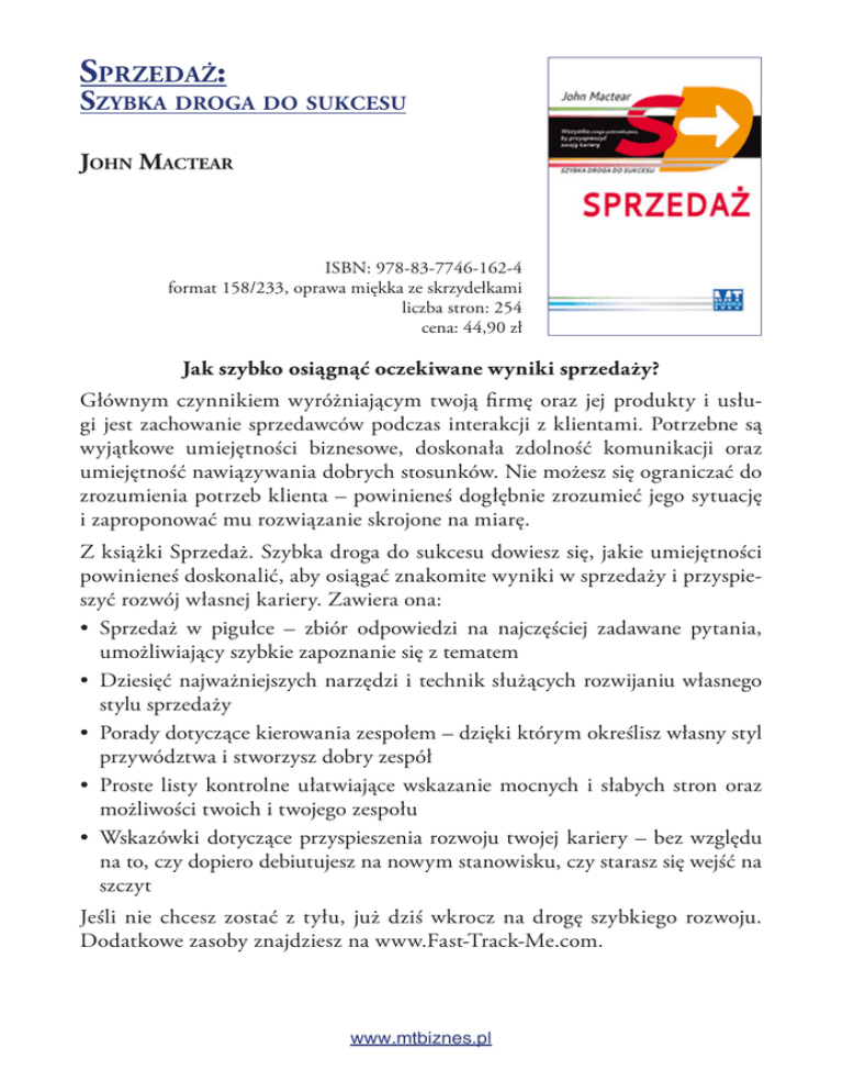 Sprzedaż: Szybka droga do sukcesu John Mactear ISBN: 978-83-7746-162-4 format 158/233, oprawa miękka ze skrzydełkami liczba stron: 254 cena: 44,90 zł Jak szybko osiągnąć oczekiwane wyniki sprzedaży? Głównym czynnikiem wyróżniającym twoją firmę oraz jej produkty i usługi jest zachowanie sprzedawców podczas interakcji z klientami. Potrzebne są wyjątkowe umiejętności biznesowe, doskonała zdolność komunikacji oraz umiejętność nawiązywania dobrych stosunków. Nie możesz się ograniczać do zrozumienia potrzeb klienta – powinieneś dogłębnie zrozumieć jego sytuację i zaproponować mu rozwiązanie skrojone na miarę. Z książki Sprzedaż. Szybka droga do sukcesu dowiesz się, jakie umiejętności powinieneś doskonalić, aby osiągać znakomite wyniki w sprzedaży i przyspieszyć rozwój własnej kariery. Zawiera ona: • Sprzedaż w pigułce – zbiór odpowiedzi na najczęściej zadawane pytania, umożliwiający szybkie zapoznanie się z tematem • Dziesięć najważniejszych narzędzi i technik służących rozwijaniu własnego stylu sprzedaży • Porady dotyczące kierowania zespołem – dzięki którym określisz własny styl przywództwa i stworzysz dobry zespół • Proste listy kontrolne ułatwiające wskazanie mocnych i słabych stron oraz możliwości twoich i twojego zespołu • Wskazówki dotyczące przyspieszenia rozwoju twojej kariery – bez względu na to, czy dopiero debiutujesz na nowym stanowisku, czy starasz się wejść na szczyt Jeśli nie chcesz zostać z tyłu, już dziś wkrocz na drogę szybkiego rozwoju. Dodatkowe zasoby znajdziesz na www.Fast-Track-Me.com. www.mtbiznes.pl Sprzedaż: Szybka droga do sukcesu SPIS TRE¥CI METODA „SZYBKIEJ DROGI” . . . . . . . . . . . . . . . . . . . . . . . . . . . . . . . . . . . . . . . . . . . . . . . . . O AUTORZE . . . . . . . . . . . . . . . . . . . . . . . . . . . . . . . . . . . . . . . . . . . . . . . . . . . . . . . . . . . . . . . . . . . . PODZIĘKOWANIA OD AUTORA . . . . . . . . . . . . . . . . . . . . . . . . . . . . . . . . . . . . . . . . . . . . . SZYBKA DROGA DO SUKCESU W SPRZEDAŻY . . . . . . . . . . . . . . . . . . . . . . . . . . . . JAK KORZYSTAĆ Z TEJ KSIĄŻKI . . . . . . . . . . . . . . . . . . . . . . . . . . . . . . . . . . . . . . . . . . . . . . FAST-TRACK-ME.COM . . . . . . . . . . . . . . . . . . . . . . . . . . . . . . . . . . . . . . . . . . . . . . . . . . . . . . . . 7 10 11 13 18 20 Część A. ŚWIADOMOŚĆ . . . . . . . . . . . . . . . . . . . . . . . . . . . . . . . . . . . . . . . . . . . . . . . . . . . . . 23 1. SPRZEDAŻ W PIGUŁCE . . . . . . . . . . . . . . . . . . . . . . . . . . . . . . . . . . . . . . . . . . . . . . . . . . 2. AUDYT SPRZEDAŻY . . . . . . . . . . . . . . . . . . . . . . . . . . . . . . . . . . . . . . . . . . . . . . . . . . . . . 27 43 Część B. SZYBKA DROGA W BIZNESIE . . . . . . . . . . . . . . . . . . . . . . . . . . . . . . . . . . . . . 55 3. CZOŁOWA DZIESIĄTKA „SZYBKIEJ DROGI” . . . . . . . . . . . . . . . . . . . . . . . . . . . . 59 4. TECHNOLOGIE . . . . . . . . . . . . . . . . . . . . . . . . . . . . . . . . . . . . . . . . . . . . . . . . . . . . . . . . . . . 109 5. WPROWADZANIE ZMIAN . . . . . . . . . . . . . . . . . . . . . . . . . . . . . . . . . . . . . . . . . . . . . . . 133 Część C. SZYBKA DROGA W KARIERZE . . . . . . . . . . . . . . . . . . . . . . . . . . . . . . . . . . . . 153 6. PIERWSZE DZIESIĘĆ TYGODNI . . . . . . . . . . . . . . . . . . . . . . . . . . . . . . . . . . . . . . . . . 157 7. KIEROWANIE ZESPOŁEM . . . . . . . . . . . . . . . . . . . . . . . . . . . . . . . . . . . . . . . . . . . . . . . 185 8. DROGA NA SZCZYT . . . . . . . . . . . . . . . . . . . . . . . . . . . . . . . . . . . . . . . . . . . . . . . . . . . . . 205 Część D. PRZYBORNIK DYREKTORA . . . . . . . . . . . . . . . . . . . . . . . . . . . . . . . . . . . . . . . 221 N1. AUDYT ZARZĄDZANIA ZESPOŁEM SPRZEDAŻOWYM . . . . . . . . . . . . . N2. LISTA KONTROLNA COACHINGU . . . . . . . . . . . . . . . . . . . . . . . . . . . . . . . . . . . . . N3. ARKUSZ PLANOWANIA WSPÓŁPRACY Z NAJWAŻNIEJSZYMI KLIENTAMI . . . . . . . . . . . . . . . . . . . . . . . . . . . . . . . . . . . . . . . . . . . . . . . . . . . . . . . . . . . . . N4. ARKUSZ OCENY KAMPANII SPRZEDAŻOWEJ . . . . . . . . . . . . . . . . . . . . . . . 225 233 235 239 METODA „SZYBKIEJ DROGI” . . . . . . . . . . . . . . . . . . . . . . . . . . . . . . . . . . . . . . . . . . . . . . . . . . 241 SŁOWNICZEK . . . . . . . . . . . . . . . . . . . . . . . . . . . . . . . . . . . . . . . . . . . . . . . . . . . . . . . . . . . . . . . . . . 243 INDEKS . . . . . . . . . . . . . . . . . . . . . . . . . . . . . . . . . . . . . . . . . . . . . . . . . . . . . . . . . . . . . . . . . . . . . . . . . 249 www.mtbiznes.pl 1 Sprzedaż: Szybka droga do sukcesu SPRZEDA¿ W PIGUCE Ten rozdział powinien ci uświadomić potrzebę stosowania odpowiednich technik zarządzania sprzedażą w organizacji oraz skłonić cię do uznania faktu, że zwykle istnieją duże możliwości doskonalenia umiejętności poszczególnych osób i całej firmy w tej dziedzinie oraz zwiększania efektywności zespołu w osiąganiu założonych rezultatów. Zacznijmy od podstaw Żadna firma nie może odnieść sukcesu bez skutecznych sprzedawców. Wobec tego umiejętność profesjonalnej sprzedaży należy do zbioru najważniejszych kompetencji nie tylko członków zespołu handlowego, ale także każdego pracownika, którego działania mają bezpośredni lub pośredni wpływ na jeden z najcenniejszych zasobów przedsiębiorstwa: na klientów. Profesjonalni sprzedawcy rozumieją potrzebę wywołania doskonałego pierwszego wrażenia; wiedzą, że cechy oferowanego produktu lub usługi pomagają w zrealizowaniu transakcji tylko wtedy, gdy klient widzi, jakie korzyści wyciągnie z zakupu; rozumieją też wszystkie etapy procesu sprzedaży, zaczynając od zadawania podstawowych pytań i uważ